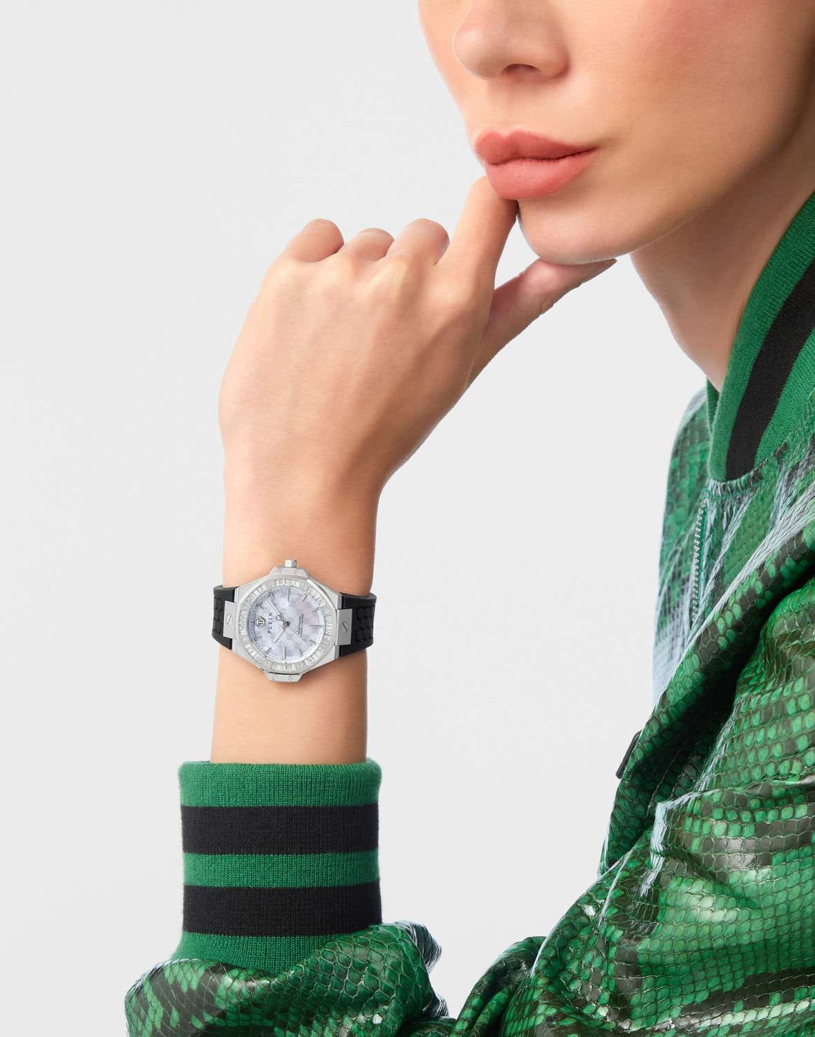 Женские кварцевые часы Philipp Plein Plein Royal Prestige PW4FA0325 — это стильное сочетание элегантности и современного дизайна. Изящный корпус выполнен из нержавеющей стали серебристого цвета, диаметром 33 мм, что придаст образу женственности и романтизма. Изысканный циферблат с метками в виде штрихов придает модели особый блеск. Циферблат защищен минеральным стекломМинеральное стеклоМинеральное стекло представляет собой искусственно выращенный минерал кварца. Такое стекло отличается особой устойчивостью к повреждениям и царапинам. Уступает по некоторым качествам сапфировому стеклу., обеспечивающий устойчивость к царапинам. БезельБезельВнешний ободок, закрепляющий стекло. В спортивных часах так называется поворотное кольцо с делениями на циферблате, выполняет роль таймера – замеряет отрезки времени на шкале. Неподвижный безель – элемент декора. Однонаправленно вращающийся безель на дайверских часах позволяет фиксировать моменты погружения и выныривания на поверхность. инкрустирован кристаллами. Стрелки с люминесцентным покрытиемЛюминесцентное покрытиеПозволяет считывать показания времени в темноте. Производители наносят на стрелки, часовые индексы, безель или поверхность циферблата светонакопительный состав, дающий холодное свечение.. Часы оснащены надежным кварцевым механизмом. Силиконовый ремешок на стандартной застёжке, гарантирует комфортное и безопасное ношение. Класс водозащиты: 50 метров позволит защитить корпус от случайных брызг или капель дождя. Phlipp Plein — отличный выбор для тех, кто ценит яркость и качество.