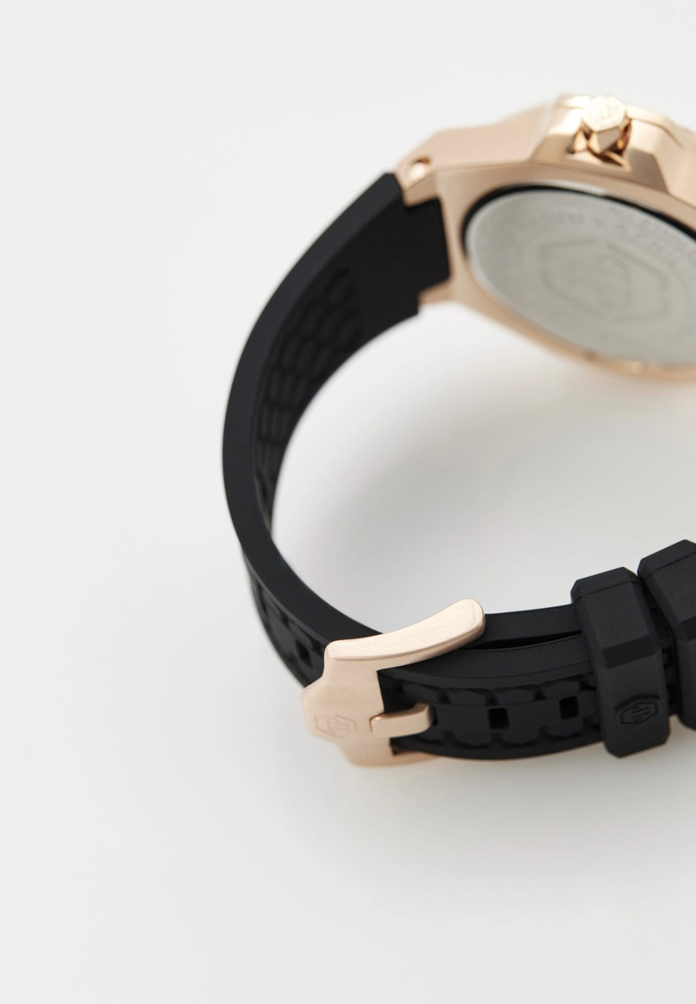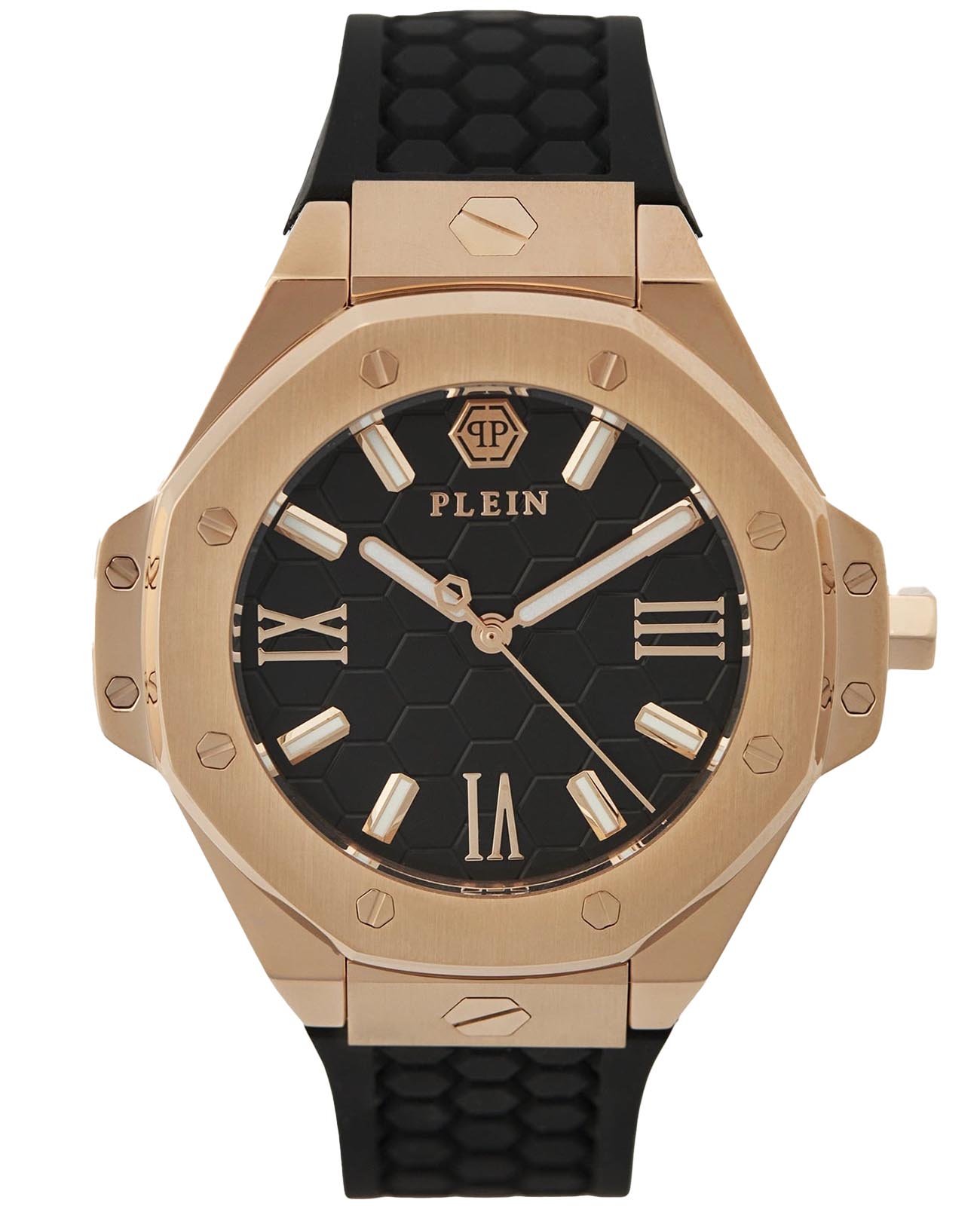 Philipp Plein Plein Lady Royal PWBDA0324 — это женские часы, сочетающие современный дизайн и функциональность. Корпус диаметром 39 мм выполнен из нержавеющей стали с розовым PVD-покрытиемPVDУльтратонкое покрытие наносится в технике вакуумного напыления, сочетает в себе нитрид титана особой прочности со слоем золота или оксида хрома. Несёт в себе декоративную или защитную функцию., что придаёт часам изысканный и стильный вид. Минеральное стеклоМинеральное стеклоМинеральное стекло представляет собой искусственно выращенный минерал кварца. Такое стекло отличается особой устойчивостью к повреждениям и царапинам. Уступает по некоторым качествам сапфировому стеклу. защищает циферблат от царапин, сохраняя его внешний вид. Чёрный циферблат с уникальной шестиугольной текстурой подчёркивает фирменный стиль бренда. Часы оснащены кварцевым механизмом, который обеспечивает точность хода. Водозащита до 5 ATM (50 метров) позволяет использовать часы в повседневной жизни. Ремешок из чёрного силикона обеспечивает комфортное ношение и надёжную фиксацию благодаря классической застёжке. Ширина ремешка 16 мм гармонично сочетается с размером корпуса, завершая смелый и современный образ.