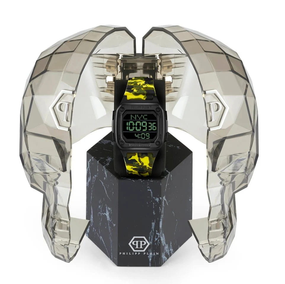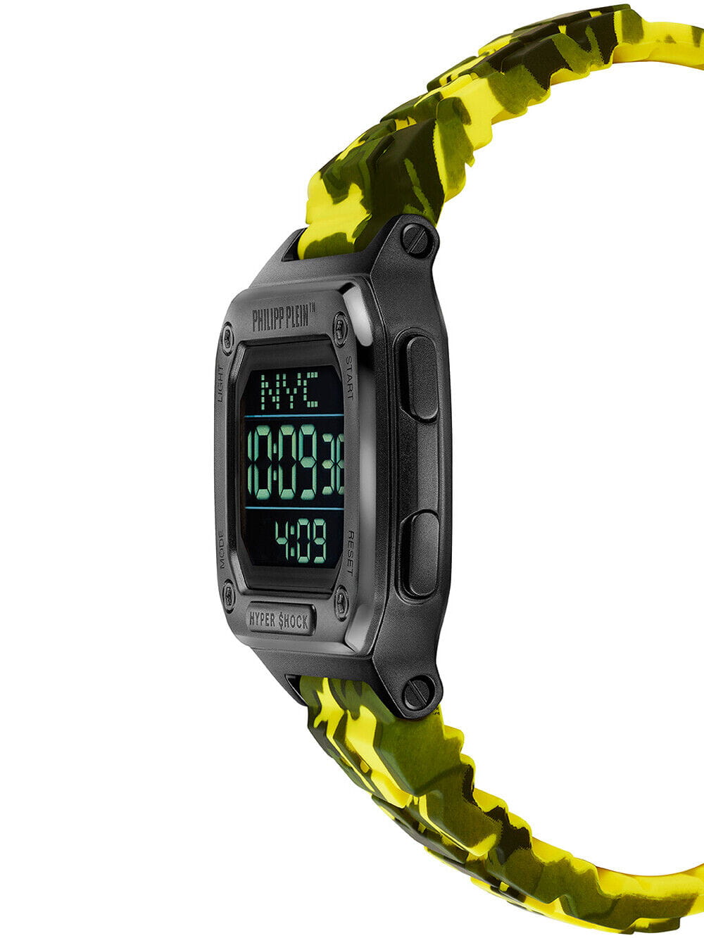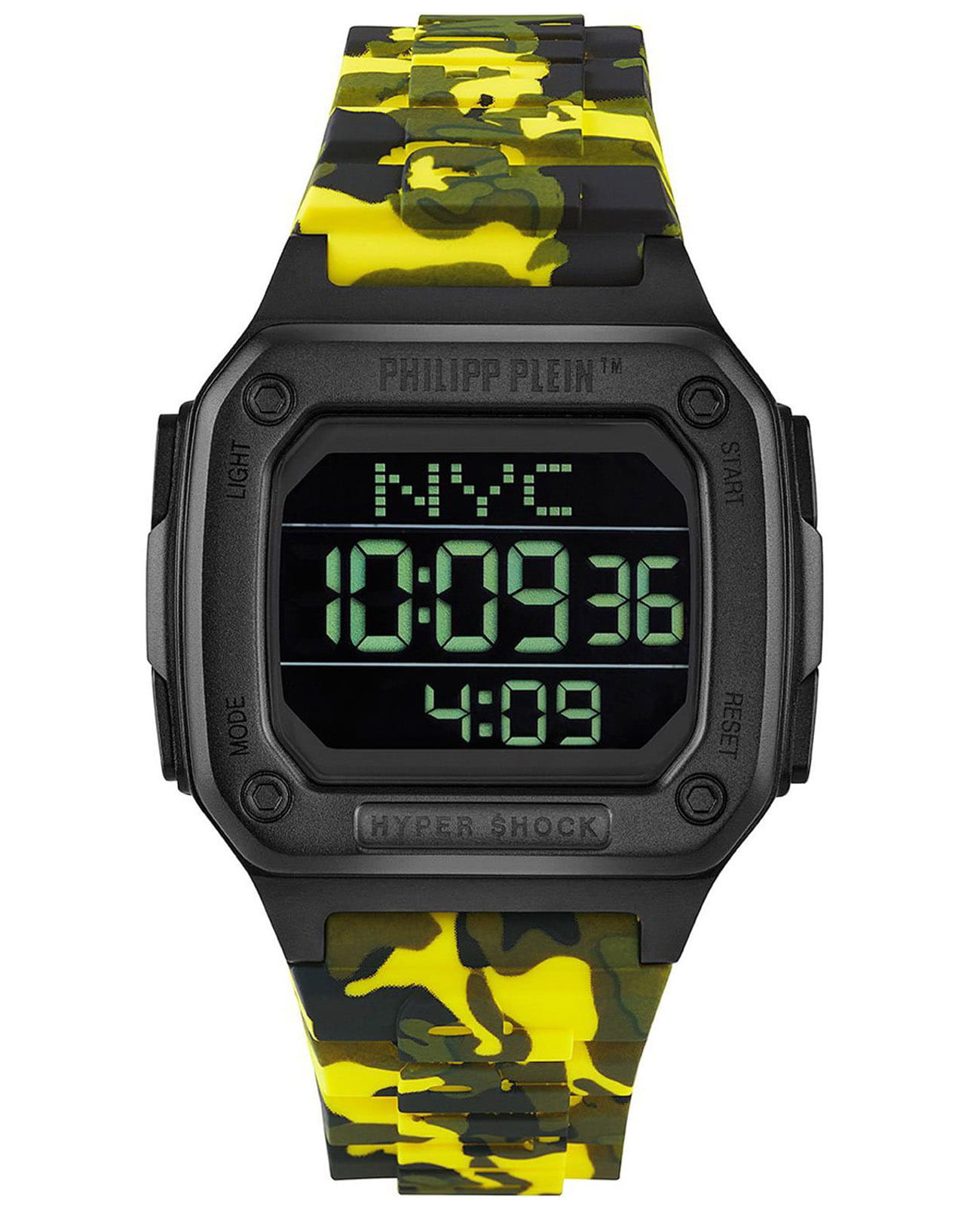 Электронные унисекс часы с секундомеромСекундомерСекундоме́р — прибор, способный измерять интервалы времени с точностью до долей секунды. Philipp Plein Hyper Shock PWHAA1722, электронный механизм с высокой точностью. Класс водозащиты: 50 метров, позволит защитить корпус от случайных брызг или капель дождя. Прямоугольный корпус выполнен из нержавеющей стали с IP-покрытиемIP-покрытиеМетод ионного напыления. Демонстрирует повышенную устойчивость к истиранию, окислению и химическим веществам. Под воздействием высокого давления и температуры около 1500°C молекулы металла надёжно соединяются с частицами корпуса часов. черного цвета. Силиконовый ремешок цвета камуфляж (желто-зеленый) шириной 22 мм, стандартная застежка.