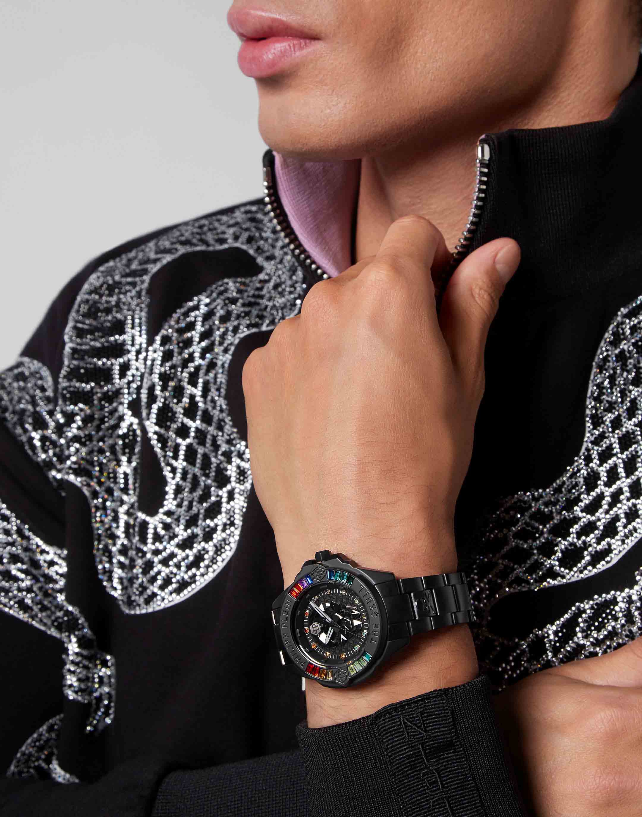 Яркие унисекс часы с минеральным стекломМинеральное стеклоМинеральное стекло представляет собой искусственно выращенный минерал кварца. Такое стекло отличается особой устойчивостью к повреждениям и царапинам. Уступает по некоторым качествам сапфировому стеклу. Philipp Plein The Skull PWNAA0522, кварцевый механизм с высокой точностью. Класс водозащиты: 50 метров, позволит защитить корпус от случайных брызг или капель дождя. Корпус часов изготовлен из стали с IP-покрытиемIP-покрытиеМетод ионного напыления. Демонстрирует повышенную устойчивость к истиранию, окислению и химическим веществам. Под воздействием высокого давления и температуры около 1500°C молекулы металла надёжно соединяются с частицами корпуса часов.. Круглый стальной корпус украшен кристаллами Swarovski. Циферблат с метками в виде точек украшенных кристаллами Swarovski, дополнен трехмерным граненым черепом. Шестигранная заводная головка с защитой. Застёжка бабочка с кнопкамиЗастёжка "бабочка"Такой вид застёжки дополняется предохранителями, помогающими избежать случайного раскрытия браслета. Обладают изящным исполнением.
