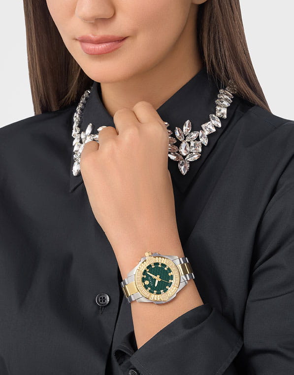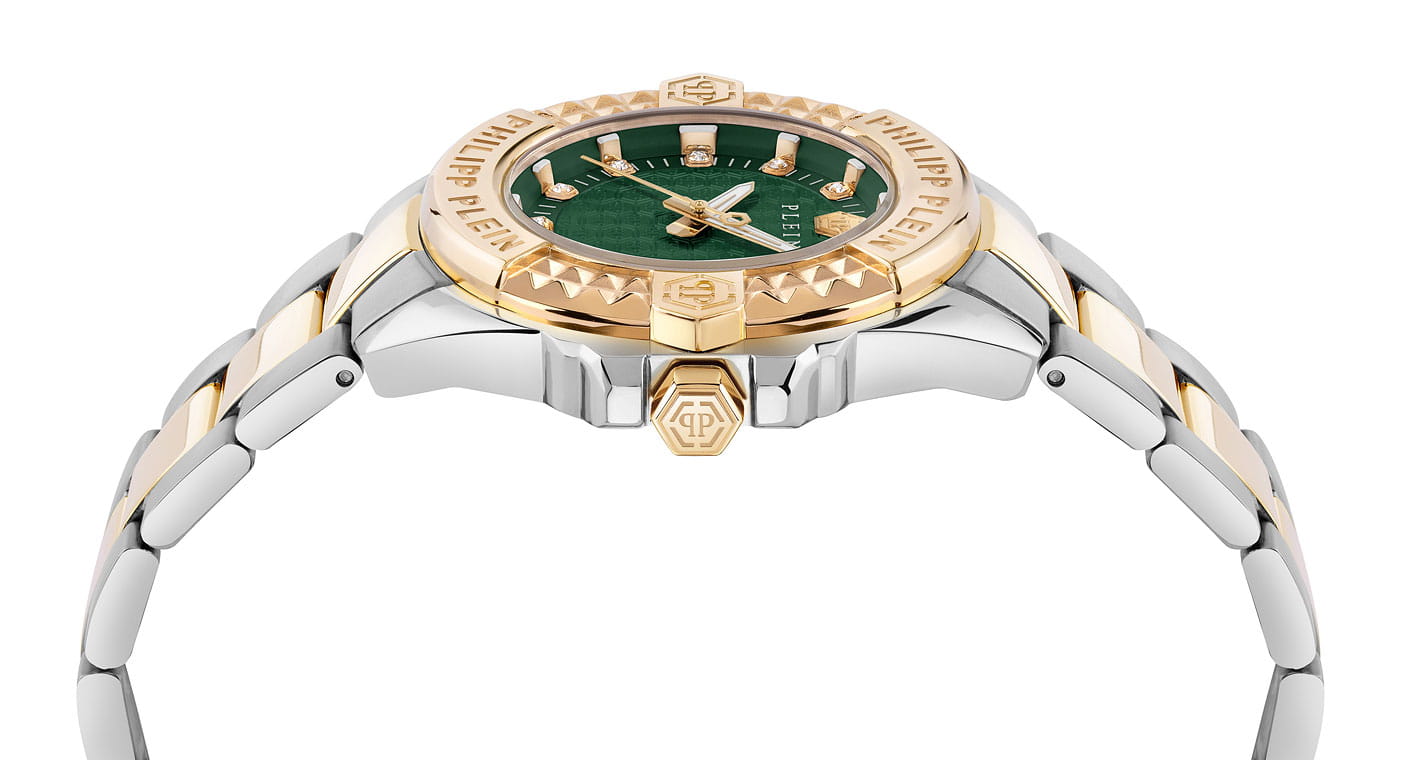 Philipp Plein Plein Majesty PWOFA0625 - дерзкое заявление любви к роскоши и бунтарскому стилю. Диаметр круглого корпуса из прочной нержавеющей стали равен 38 мм. Стальной браслет на застёжке-бабочке с кнопкамиЗастёжка "бабочка"Такой вид застёжки дополняется предохранителями, помогающими избежать случайного раскрытия браслета. Обладают изящным исполнением. обеспечивает надёжную фиксацию и комфортное ношение. Метки в виде кристаллов Preciosa. Минеральное стеклоМинеральное стеклоМинеральное стекло представляет собой искусственно выращенный минерал кварца. Такое стекло отличается особой устойчивостью к повреждениям и царапинам. Уступает по некоторым качествам сапфировому стеклу. защищает циферблат от царапин. Люминесцентное покрытиеЛюминесцентное покрытиеПозволяет считывать показания времени в темноте. Производители наносят на стрелки, часовые индексы, безель или поверхность циферблата светонакопительный состав, дающий холодное свечение. стрелок и меток позволит следить за временем даже в полной темноте. Неподвижный безельБезельВнешний ободок, закрепляющий стекло. В спортивных часах так называется поворотное кольцо с делениями на циферблате, выполняет роль таймера – замеряет отрезки времени на шкале. Неподвижный безель – элемент декора. Однонаправленно вращающийся безель на дайверских часах позволяет фиксировать моменты погружения и выныривания на поверхность. с PVD-покрытиемPVDУльтратонкое покрытие наносится в технике вакуумного напыления, сочетает в себе нитрид титана особой прочности со слоем золота или оксида хрома. Несёт в себе декоративную или защитную функцию.. Влагозащита: 50 метров, позволит защитить корпус от случайных брызг или капель дождя. Идеальный аксессуар для тех, кто ценит индивидуальность и не боится выделяться из толпы.