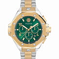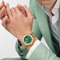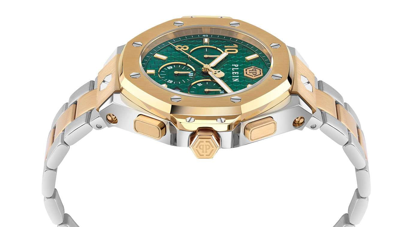 Philipp Plein Plein Chrono Royal 46 MM PWPRA0324 - это дерзкие и бескомпромиссные часы, воплощающие бунтарский дух бренда. Диаметр корпуса из прочной нержавеющей стали равен 46 мм. Стальной браслет на застёжке-бабочке с кнопкамиЗастёжка "бабочка"Такой вид застёжки дополняется предохранителями, помогающими избежать случайного раскрытия браслета. Обладают изящным исполнением. обеспечивает надёжную фиксацию и комфортное ношение. Минеральное стеклоМинеральное стеклоМинеральное стекло представляет собой искусственно выращенный минерал кварца. Такое стекло отличается особой устойчивостью к повреждениям и царапинам. Уступает по некоторым качествам сапфировому стеклу. защищает циферблат от царапин. БезельБезельВнешний ободок, закрепляющий стекло. В спортивных часах так называется поворотное кольцо с делениями на циферблате, выполняет роль таймера – замеряет отрезки времени на шкале. Неподвижный безель – элемент декора. Однонаправленно вращающийся безель на дайверских часах позволяет фиксировать моменты погружения и выныривания на поверхность. с PVD-покрытиемPVDУльтратонкое покрытие наносится в технике вакуумного напыления, сочетает в себе нитрид титана особой прочности со слоем золота или оксида хрома. Несёт в себе декоративную или защитную функцию.. Функциональность хронографаХронографФункция позволяет измерять отрезки времени с особой точностью: часы, минуты, секунды. Верным признаком хронографа является наличие на циферблате 3 дополнительных окошек-счётчиков. позволяет точно измерять время, а надежный кварцевый механизм гарантирует безупречную работу. Люминесцентное покрытиеЛюминесцентное покрытиеПозволяет считывать показания времени в темноте. Производители наносят на стрелки, часовые индексы, безель или поверхность циферблата светонакопительный состав, дающий холодное свечение. стрелок и меток позволит следить за временем даже в полной темноте. Граненая заводная головка. Влагозащита: 50 метров, позволит защитить корпус от случайных брызг или капель дождя. Идеальный аксессуар для тех, кто ценит индивидуальность и не боится выделяться из толпы.