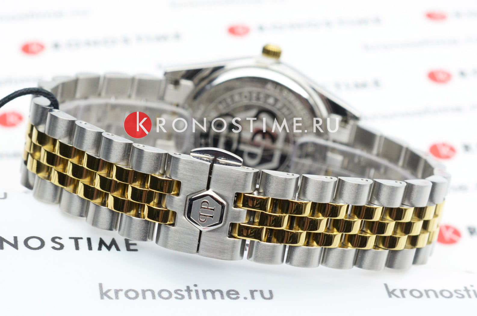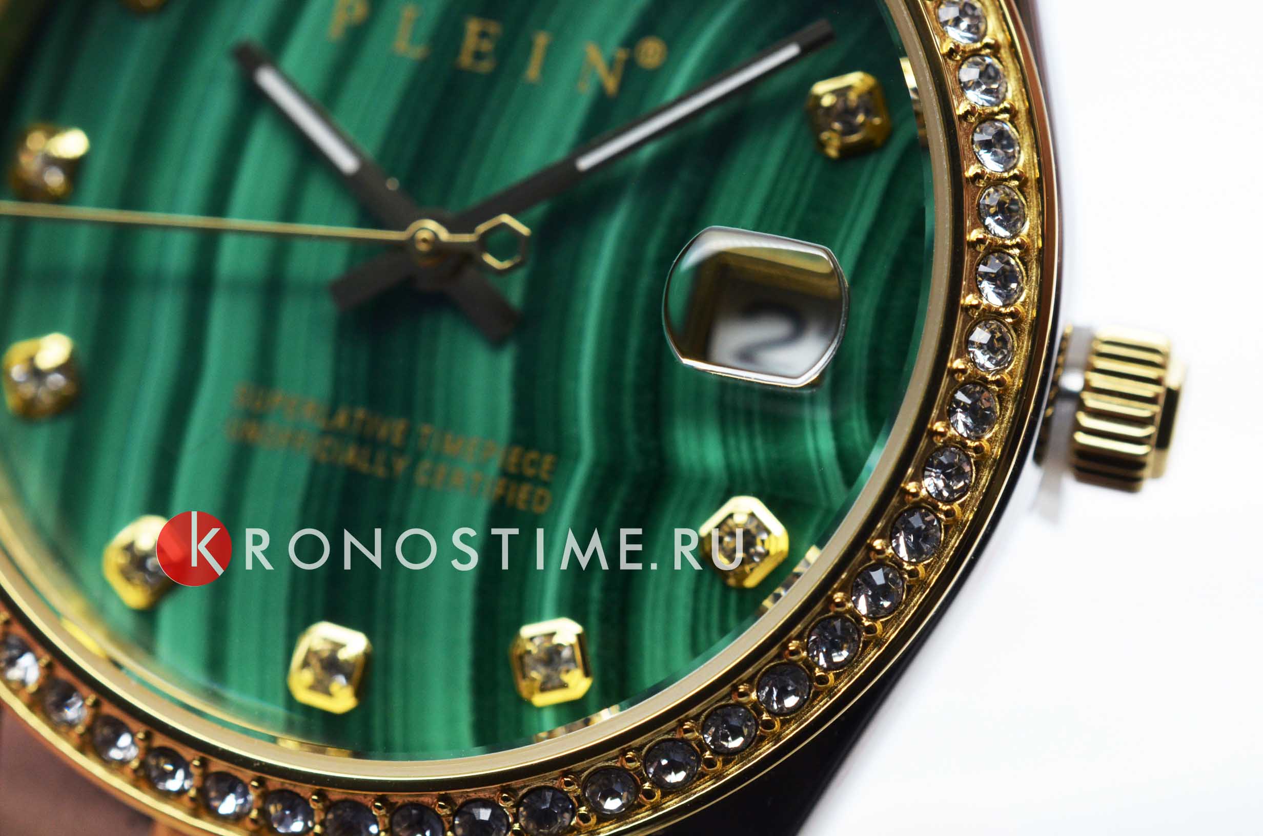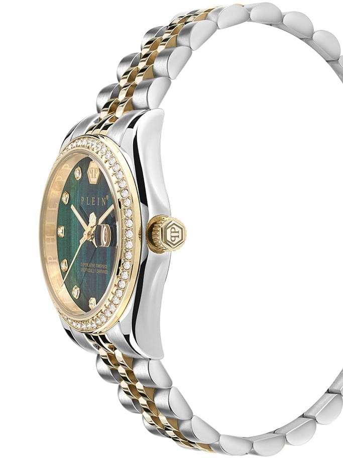 Яркие женские часы Philipp Plein Date Superlative PWYAA0523 c с минеральным стекломМинеральное стеклоМинеральное стекло представляет собой искусственно выращенный минерал кварца. Такое стекло отличается особой устойчивостью к повреждениям и царапинам. Уступает по некоторым качествам сапфировому стеклу.. Особенные часы для особенных женщин! Ослепительный аксессуар, демонстрирующий роскошь и изысканность.Часы с круглым стальным корпусом с IP-покрытиемIP-покрытиеМетод ионного напыления. Демонстрирует повышенную устойчивость к истиранию, окислению и химическим веществам. Под воздействием высокого давления и температуры около 1500°C молекулы металла надёжно соединяются с частицами корпуса часов.. Перламутровый циферблат с метками в виде точек, украшенных кристаллами. Люминесцентное покрытиеЛюминесцентное покрытиеПозволяет считывать показания времени в темноте. Производители наносят на стрелки, часовые индексы, безель или поверхность циферблата светонакопительный состав, дающий холодное свечение. стрелок. Окошко даты с увеличительным стеклом находится в положении 3 часа. Рифленая заводная головка. Стальной браслет на застёжке бабочка с кнопкамиЗастёжка "бабочка"Такой вид застёжки дополняется предохранителями, помогающими избежать случайного раскрытия браслета. Обладают изящным исполнением.