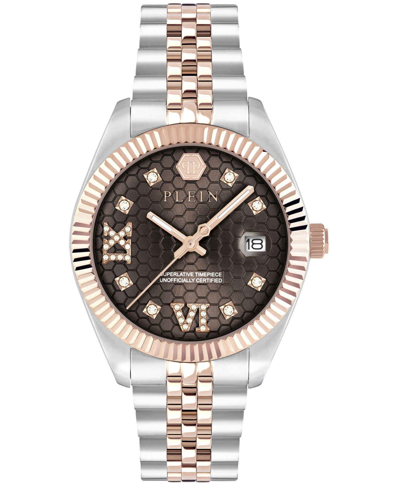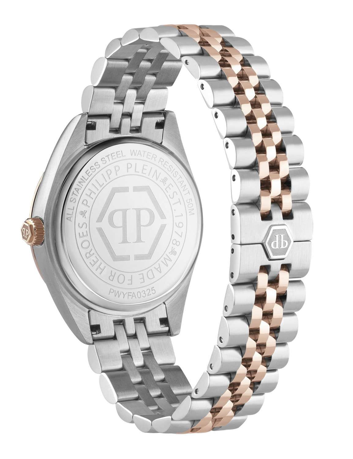 Женские кварцевые часы Philipp Plein Date Superlative PWYFA0325 — это стильное сочетание элегантности и современного дизайна. Изящный корпус выполнен из нержавеющей стали, диаметром 34 мм, что придаст образу женственности и романтизма. Изысканный циферблат с метками в виде точек придает модели особый блеск. Циферблат защищен минеральным стекломМинеральное стеклоМинеральное стекло представляет собой искусственно выращенный минерал кварца. Такое стекло отличается особой устойчивостью к повреждениям и царапинам. Уступает по некоторым качествам сапфировому стеклу., обеспечивающий устойчивость к царапинам и украшен кристаллами. Стрелки с люминесцентным покрытиемЛюминесцентное покрытиеПозволяет считывать показания времени в темноте. Производители наносят на стрелки, часовые индексы, безель или поверхность циферблата светонакопительный состав, дающий холодное свечение.. БезельБезельВнешний ободок, закрепляющий стекло. В спортивных часах так называется поворотное кольцо с делениями на циферблате, выполняет роль таймера – замеряет отрезки времени на шкале. Неподвижный безель – элемент декора. Однонаправленно вращающийся безель на дайверских часах позволяет фиксировать моменты погружения и выныривания на поверхность. с PVD-покрытиемPVDУльтратонкое покрытие наносится в технике вакуумного напыления, сочетает в себе нитрид титана особой прочности со слоем золота или оксида хрома. Несёт в себе декоративную или защитную функцию. цвета розового золота. Часы оснащены надежным кварцевым механизмом. Окошко даты находится в положении 3 часа. Стальной браслет с частичным PVD-покрытиемPVDУльтратонкое покрытие наносится в технике вакуумного напыления, сочетает в себе нитрид титана особой прочности со слоем золота или оксида хрома. Несёт в себе декоративную или защитную функцию. на застёжке-бабочкеЗастёжка "бабочка"Такой вид застёжки дополняется предохранителями, помогающими избежать случайного раскрытия браслета. Обладают изящным исполнением. , гарантирует комфортное и безопасное ношение. Класс водозащиты: 50 метров позволит защитить корпус от случайных брызг или капель дождя. Phlipp Plein — отличный выбор для тех, кто ценит яркость и качество.