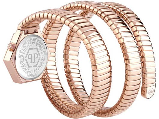 Яркие женские часы  Philipp Plein Snake Hexagon PWZAA0523 с минеральным стекломМинеральное стеклоМинеральное стекло представляет собой искусственно выращенный минерал кварца. Такое стекло отличается особой устойчивостью к повреждениям и царапинам. Уступает по некоторым качествам сапфировому стеклу.. Символ неотразимого гламура и роскоши. Соблазнительное воплощение легендарной утонченности, такой аксессуар - неотразимый символ, который вселяет в женщин уверенность и силу. Авангардная геометрия, чувственные изгибы, изысканная привлекательность и драгоценные мысли - все это сделает вас непревзойденной. Корпус изготовлен из стали с IP-покрытиемIP-покрытиеМетод ионного напыления. Демонстрирует повышенную устойчивость к истиранию, окислению и химическим веществам. Под воздействием высокого давления и температуры около 1500°C молекулы металла надёжно соединяются с частицами корпуса часов. цвета розовое золото. Неподвижный безель украшен кристаллами