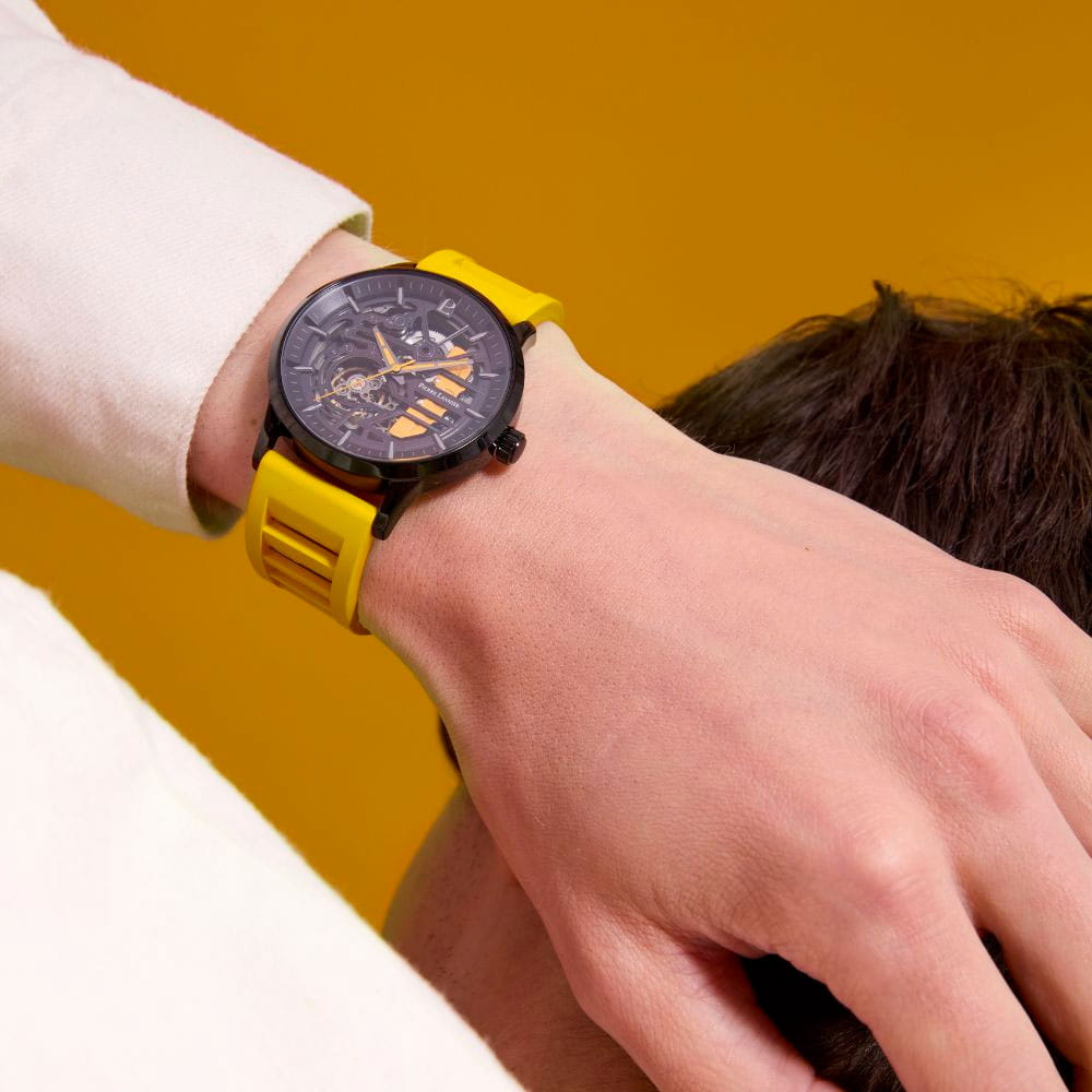 Pierre Lannier Paddock 341A449 — смелая и энергичная модель, вдохновлённая миром мотоспорта. Корпус диаметром 43 мм выполнен из нержавеющей стали с матовым чёрным PVD-покрытиемPVDУльтратонкое покрытие наносится в технике вакуумного напыления, сочетает в себе нитрид титана особой прочности со слоем золота или оксида хрома. Несёт в себе декоративную или защитную функцию., которое подчёркивает спортивный и технический характер часов. Циферблат частично скелетонизирован — открывает взгляд на работу баланса и других элементов механизма. Яркие жёлтые акценты на стрелках и декоративных вставках добавляют динамики и визуальной выразительности, напоминая детали гоночного оборудования. Стрелки и часовые метки покрыты люминесцентным покрытиемЛюминесцентное покрытиеПозволяет считывать показания времени в темноте. Производители наносят на стрелки, часовые индексы, безель или поверхность циферблата светонакопительный состав, дающий холодное свечение., обеспечивая отличную читаемость в тёмное время суток. Циферблат надёжно защищён минеральным стекломМинеральное стеклоМинеральное стекло представляет собой искусственно выращенный минерал кварца. Такое стекло отличается особой устойчивостью к повреждениям и царапинам. Уступает по некоторым качествам сапфировому стеклу., устойчивым к царапинам и механическим воздействиям. Модель оснащена автоматическим механизмом с автоподзаводом и запасом хода около 42 часов, что позволяет использовать часы без необходимости ежедневного подзавода. Ярко-жёлтый перфорированный кожаный ремешок шириной 20 мм завершён удобной стандартной застежкой, обеспечивающей надёжную посадку и лёгкость в использовании. Водозащита до 5 ATM (50 м) делает часы устойчивыми к дождю и брызгам, подходящими для повседневной носки. Paddock — это смелое заявление, в котором сочетаются техническая выразительность, спортивная энергия и характерный стиль.