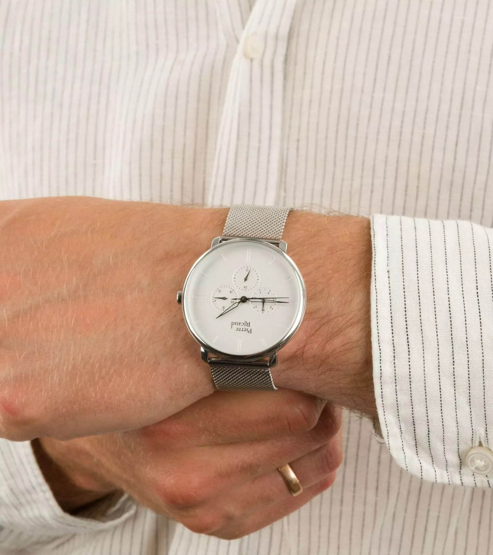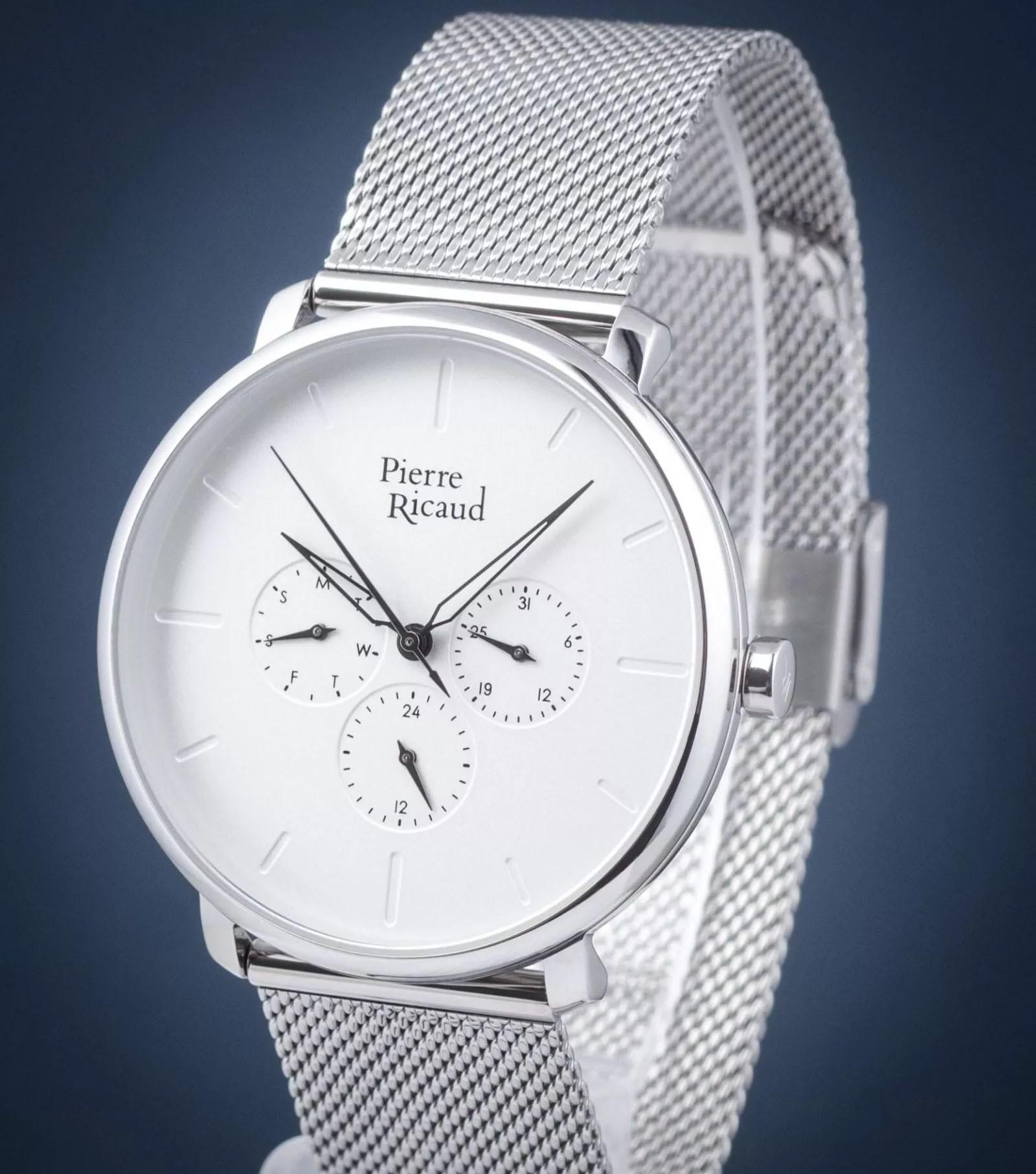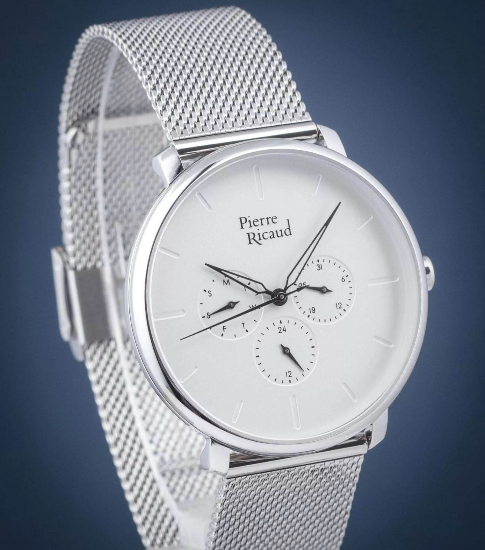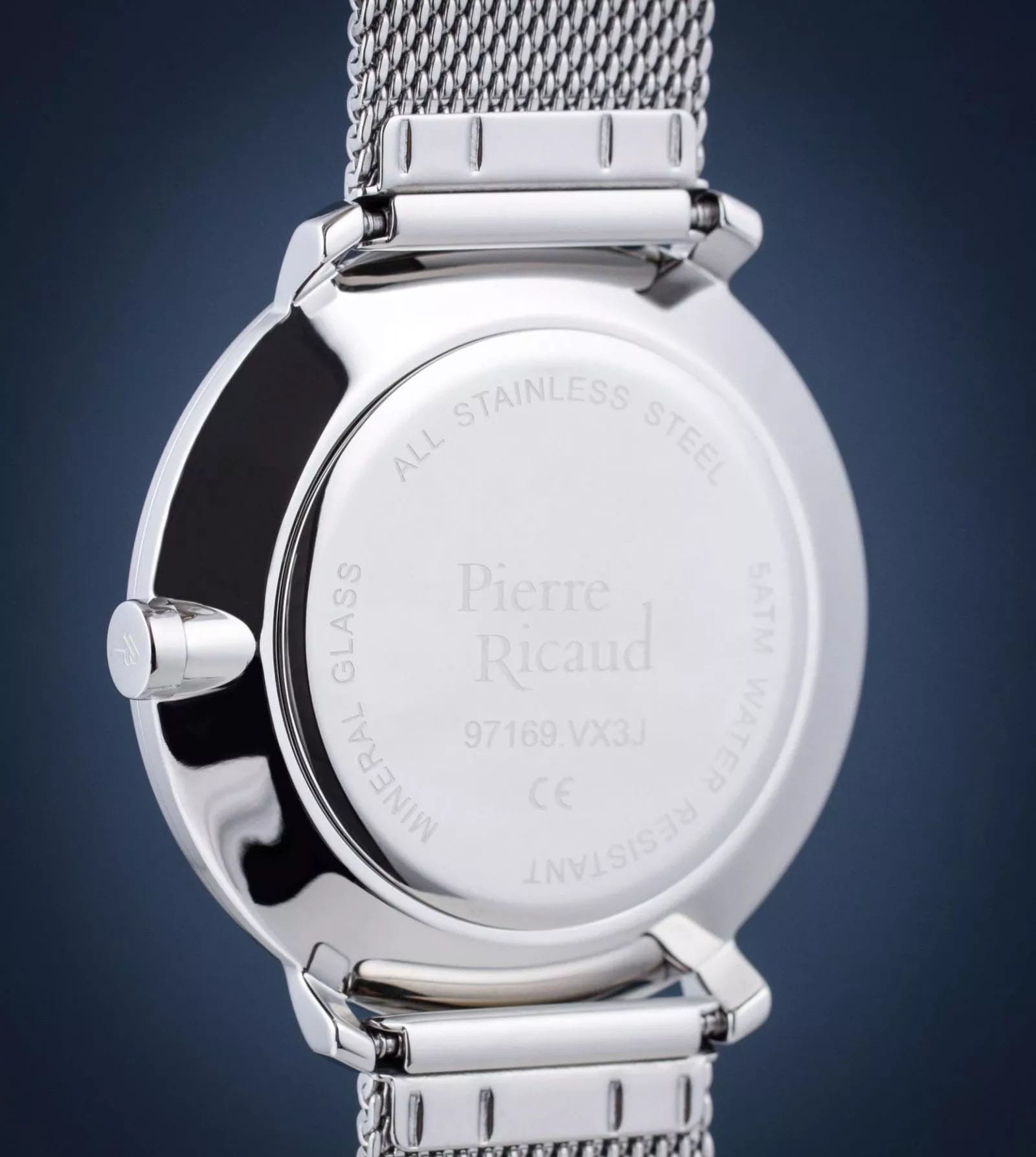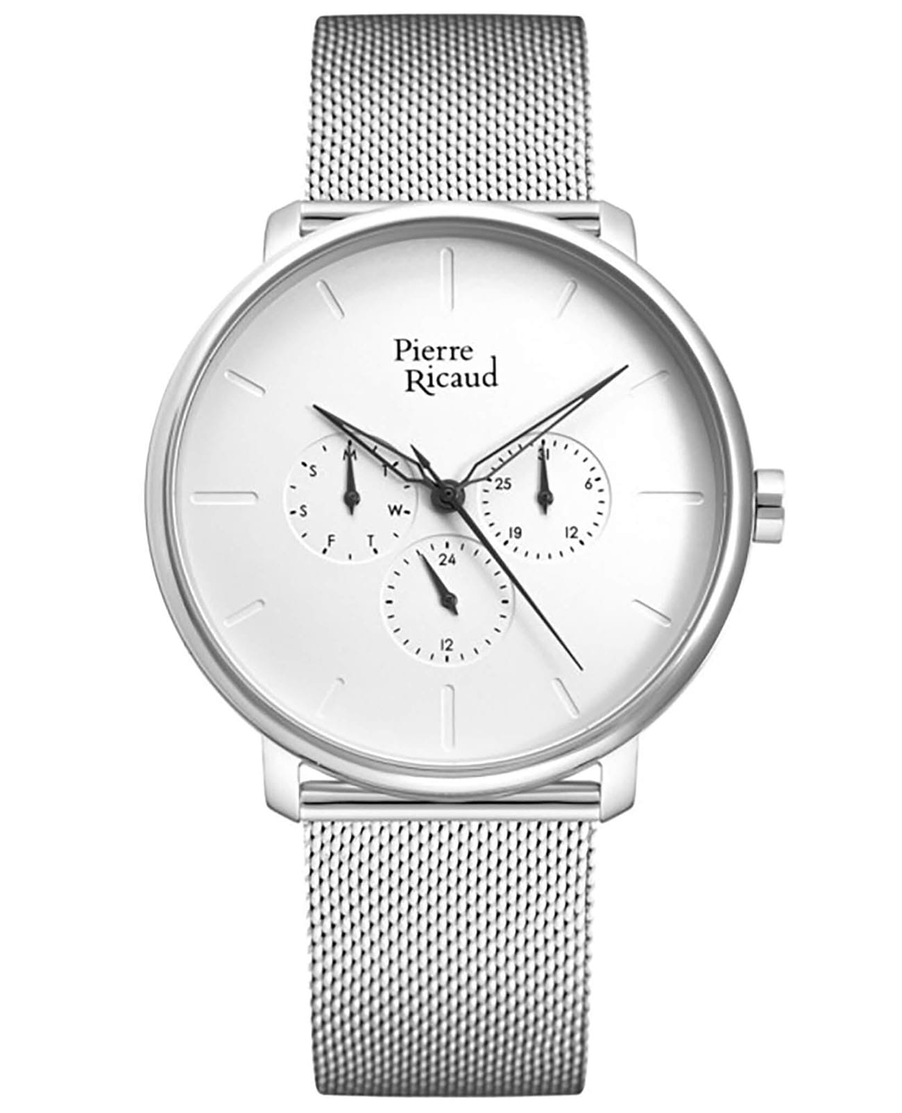 Мужские часы с минеральным стекломМинеральное стеклоМинеральное стекло представляет собой искусственно выращенный минерал кварца. Такое стекло отличается особой устойчивостью к повреждениям и царапинам. Уступает по некоторым качествам сапфировому стеклу. Pierre Ricaud P97169.5113QF, кварцевый механизм с высокой точностью. Класс водозащиты: 50 метров, позволит защитить корпус от случайных брызг или капель дождя. Корпус часов изготовлен из стали. Стальной браслет на раскладной застёжкеРаскладная застёжкаТакой тип застёжки используется только на браслетах из металла. Она никогда не раскрывается полностью, происходит разделение на 2 и более частей. Раскладывающая застёжка снизит вероятность потери часов к минимуму..