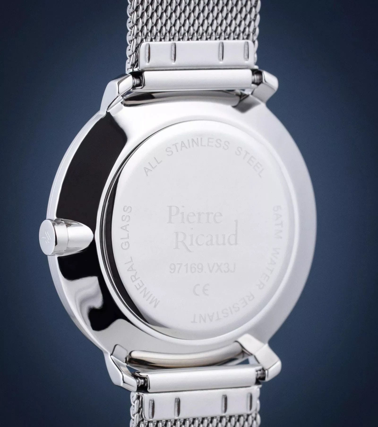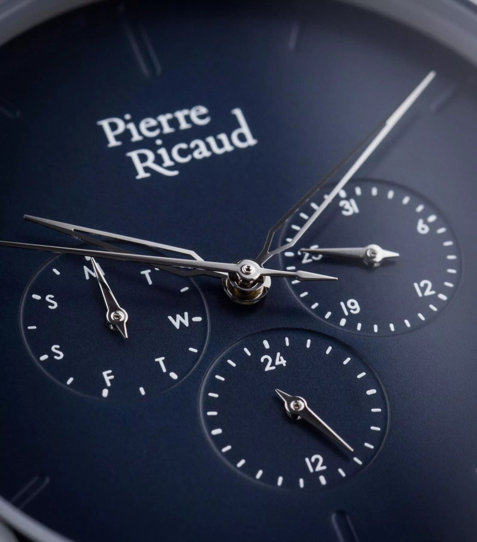 Мужские часы с минеральным стекломМинеральное стеклоМинеральное стекло представляет собой искусственно выращенный минерал кварца. Такое стекло отличается особой устойчивостью к повреждениям и царапинам. Уступает по некоторым качествам сапфировому стеклу. Pierre Ricaud P97169.5115QF, кварцевый механизм с высокой точностью. Класс водозащиты: 50 метров, позволит защитить корпус от случайных брызг или капель дождя. Корпус часов изготовлен из стали. Стальной браслет на раскладной застёжкеРаскладная застёжкаТакой тип застёжки используется только на браслетах из металла. Она никогда не раскрывается полностью, происходит разделение на 2 и более частей. Раскладывающая застёжка снизит вероятность потери часов к минимуму.. Дата, день недели, 24-часовой указатель времени.