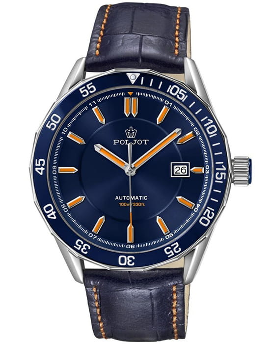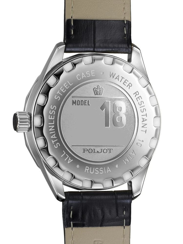 Poljot NH35A.181261 — надёжные механические мужские часы с автоподзаводом, сочетающие техническую точность и выразительный спортивный стиль. Корпус из нержавеющей стали подчёркивает прочность конструкции, а насыщенный циферблат с акцентами на стрелках и метках придаёт модели динамичный и современный облик. БезельБезельВнешний ободок, закрепляющий стекло. В спортивных часах так называется поворотное кольцо с делениями на циферблате, выполняет роль таймера – замеряет отрезки времени на шкале. Неподвижный безель – элемент декора. Однонаправленно вращающийся безель на дайверских часах позволяет фиксировать моменты погружения и выныривания на поверхность. с PVD-покрытиемPVDУльтратонкое покрытие наносится в технике вакуумного напыления, сочетает в себе нитрид титана особой прочности со слоем золота или оксида хрома. Несёт в себе декоративную или защитную функцию.. Внутри установлен проверенный японский механизм SEIKO NH35, обеспечивающий стабильную работу и плавный ход секундной стрелки. Окно даты добавляет функциональности, а широкие метки с люминесцентным покрытиемЛюминесцентное покрытиеПозволяет считывать показания времени в темноте. Производители наносят на стрелки, часовые индексы, безель или поверхность циферблата светонакопительный состав, дающий холодное свечение. обеспечивают отличную читаемость даже в темноте. Прочное минеральное стеклоМинеральное стеклоМинеральное стекло представляет собой искусственно выращенный минерал кварца. Такое стекло отличается особой устойчивостью к повреждениям и царапинам. Уступает по некоторым качествам сапфировому стеклу. защищает циферблат от царапин, а ремешок из натуральной кожи с контрастной прострочкой гарантирует комфорт и надёжную посадку. Poljot — часы с характером, созданные для тех, кто ценит точность, качество и спортивную уверенность в каждой детали.