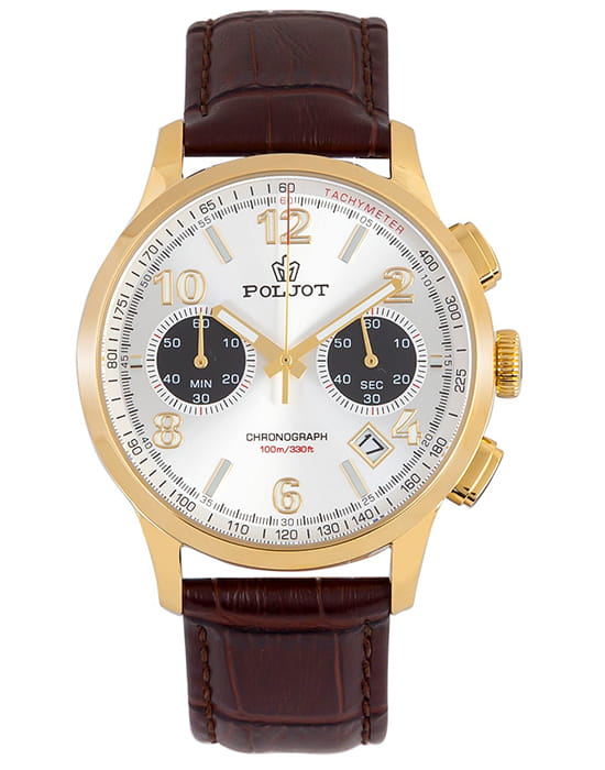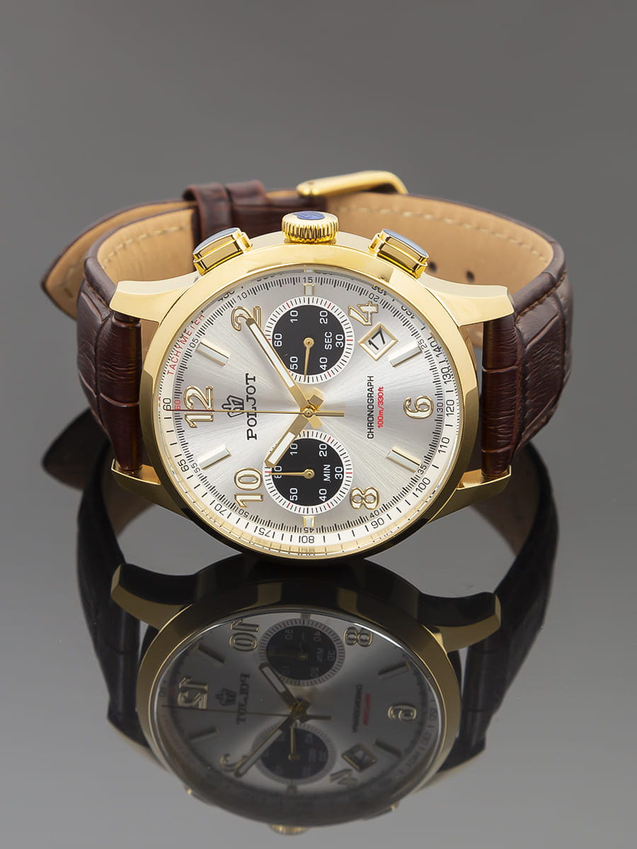 Poljot 6S21.906215 — современные мужские часы с выразительным спортивным дизайном и надёжной функциональностью. Корпус из нержавеющей стали с с PVD-покрытиемPVDУльтратонкое покрытие наносится в технике вакуумного напыления, сочетает в себе нитрид титана особой прочности со слоем золота или оксида хрома. Несёт в себе декоративную или защитную функцию. подчёркивает прочность и уверенный характер модели, а глубокий циферблат с счётчиками хронографаХронографФункция позволяет измерять отрезки времени с особой точностью: часы, минуты, секунды. Верным признаком хронографа является наличие на циферблате 3 дополнительных окошек-счётчиков. и аккуратным окном даты придаёт часам динамичный вид. Контрастные стрелки и метки с люминесцентным покрытиемЛюминесцентное покрытиеПозволяет считывать показания времени в темноте. Производители наносят на стрелки, часовые индексы, безель или поверхность циферблата светонакопительный состав, дающий холодное свечение. обеспечивают удобство считывания информации в любое время суток, а внешняя шкала тахиметраТахиметрРазмеченная шкала, располагается на ободке или безеле часов. Тахиметр позволяет рассчитать скорость на определённом участке пути, расстояние измеряется в километрах или милях. добавляет спортивную функциональность. Прочное минеральное стеклоМинеральное стеклоМинеральное стекло представляет собой искусственно выращенный минерал кварца. Такое стекло отличается особой устойчивостью к повреждениям и царапинам. Уступает по некоторым качествам сапфировому стеклу. защищает циферблат от царапин, а ремешок из натуральной кожи гарантирует комфорт и элегантную посадку на запястье. Poljot — это гармония классики и спортивного духа, созданная для мужчин, ценящих точность, надёжность и уверенный стиль.