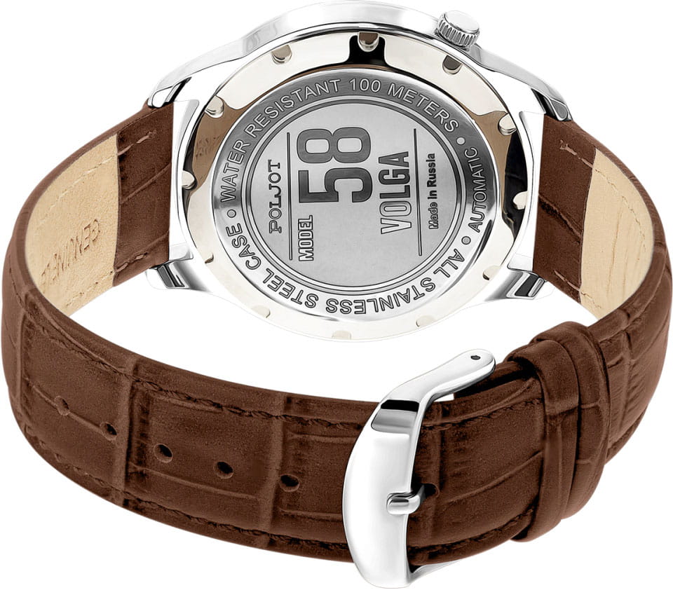 Poljot 82S0.581023 — изысканные механические мужские часы с автоподзаводом, в которых классика сочетается с технической эстетикой. Корпус из нержавеющей стали подчёркивает надёжность и строгость формы, а глубокий циферблат с изящным окном «open heart» демонстрирует работу механизма, придавая модели характер инженерной утончённости. Стрелки и метки с люминесцентным покрытиемЛюминесцентное покрытиеПозволяет считывать показания времени в темноте. Производители наносят на стрелки, часовые индексы, безель или поверхность циферблата светонакопительный состав, дающий холодное свечение.. Металлизированные стрелки и метки создают аккуратный контраст и обеспечивают превосходную читаемость, а прочное минеральное стеклоМинеральное стеклоМинеральное стекло представляет собой искусственно выращенный минерал кварца. Такое стекло отличается особой устойчивостью к повреждениям и царапинам. Уступает по некоторым качествам сапфировому стеклу. надёжно защищает циферблат от повреждений. Ремешок из натуральной кожи тёплого коричневого оттенка добавляет образу благородства и комфорта. Poljot — это часы для мужчин, ценящих механику, традиции и спокойную уверенность в каждой детали.