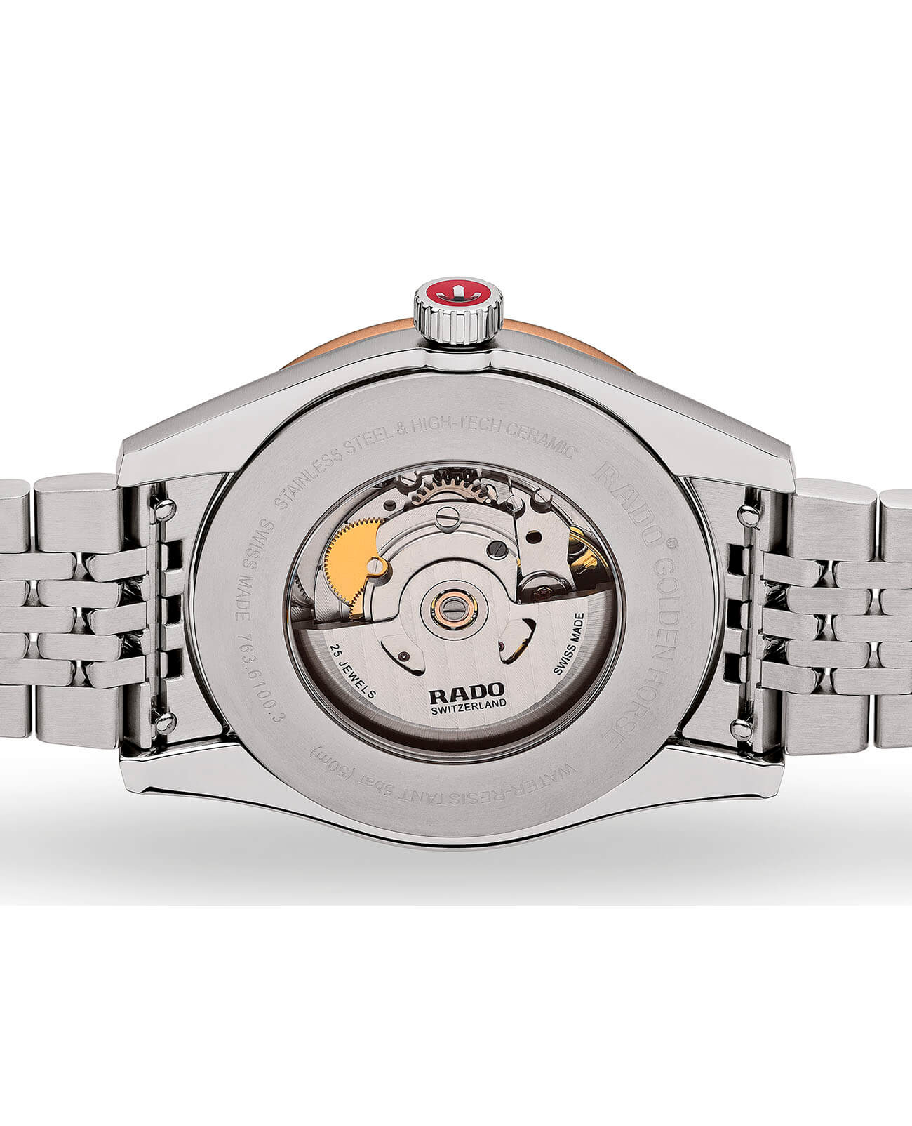 Модель относится к премиальному сегменту, стильно смотрится синий узорчатый циферблат с контрастными элементами. Нижняя часть дополнена эмблемой в виде морских коньков, в верхней находится узнаваемый логотип Rado. Часы сделаны из нержавеющей стали 316L, как и первые аксессуары из линейки Golden Horse, отличием стал безельБезельВнешний ободок, закрепляющий стекло. В спортивных часах так называется поворотное кольцо с делениями на циферблате, выполняет роль таймера – замеряет отрезки времени на шкале. Неподвижный безель – элемент декора. Однонаправленно вращающийся безель на дайверских часах позволяет фиксировать моменты погружения и выныривания на поверхность. из материала CeramosCeramosМатериал являет собой инновационное сочетание высокотехнологичной керамики и сплава металла. Он объединяет керамическую устойчивость к царапинам и металлический роскошный блеск. . Корпус защищает автоматический механизм ETA C07.611 с резервом хода 80 часов от ударов и повреждений. Задняя крышка прозрачная. Стекло из сапфира с обработкой "антиблик". Водостойкость до 5 бар. Отображение текущего числа. Диаметр корпуса: 36,5 мм.
