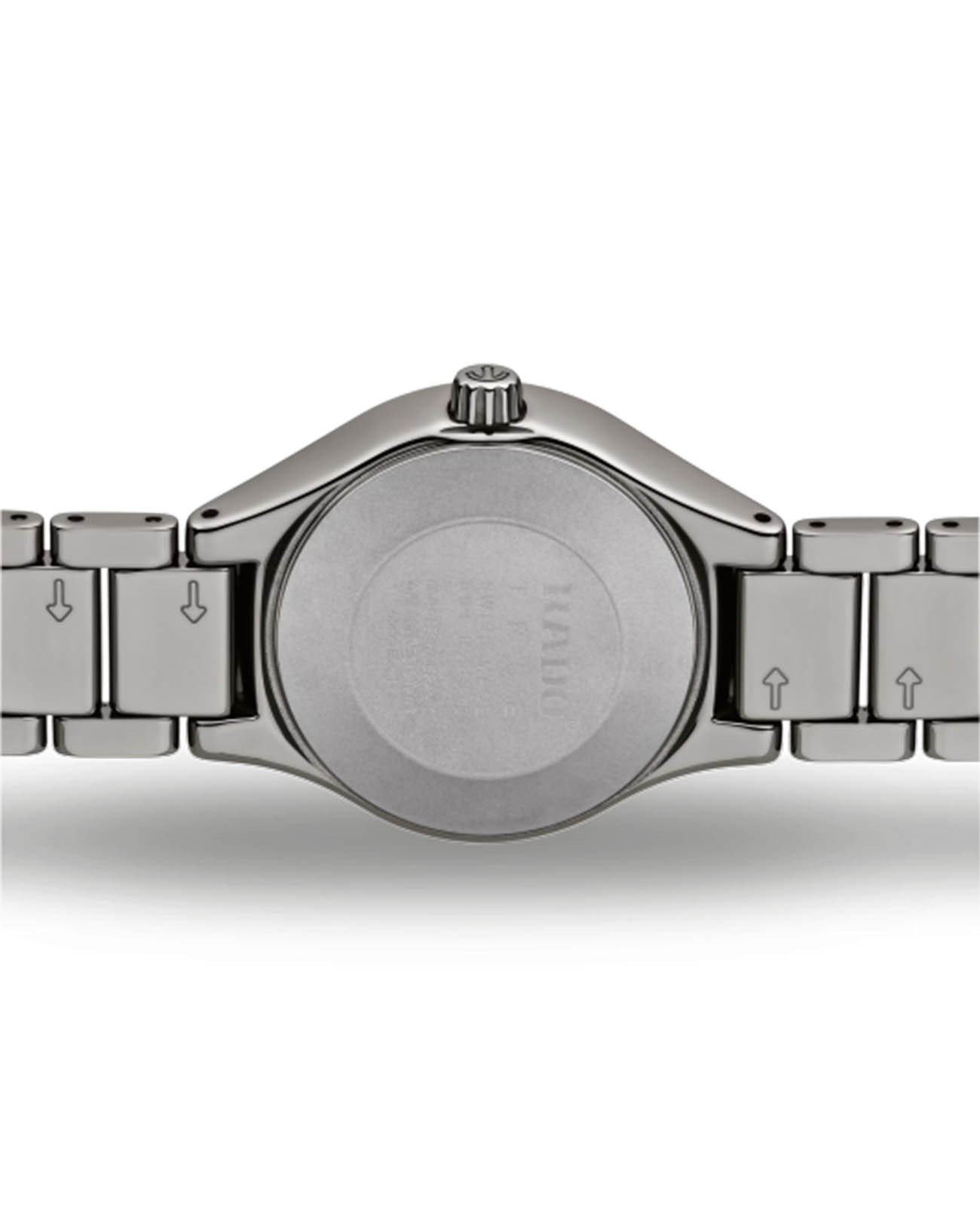 Швейцарские женские механические часы с автоподзаводом Rado True Automatic Diamonds R27243712. Сапфировое стеклоСапфировое стеклоПрочный и надёжный материал из кристалла сапфира синтетического происхождения, характеризующийся особой твёрдостью и устойчивостью к царапинам и повреждениям. устойчивое к появлению царапин, обладающее высокой прозрачностью. Корпус часов изготовлен из титана и высокотехнологичной керамикиВысокотехнологичная керамикаИнновационный запатентованный Rado материал с гладкой или матовой поверхностью. Керамика за счёт кристаллической структуры обладает повышенной устойчивостью от возникновения царапин. Материал способен принимать температуру тела человека, обеспечивая невероятный комфорт при ношении.. Циферблат украшен бриллиантами. Окошко даты находится в положении 3 часа. Класс водозащиты: 50 метров, позволит защитить корпус от случайных брызг или капель дождя. Браслет из титна и кермики на застёжке-бабочке с кнопкамиЗастёжка "бабочка"Такой вид застёжки дополняется предохранителями, помогающими избежать случайного раскрытия браслета. Обладают изящным исполнением. .