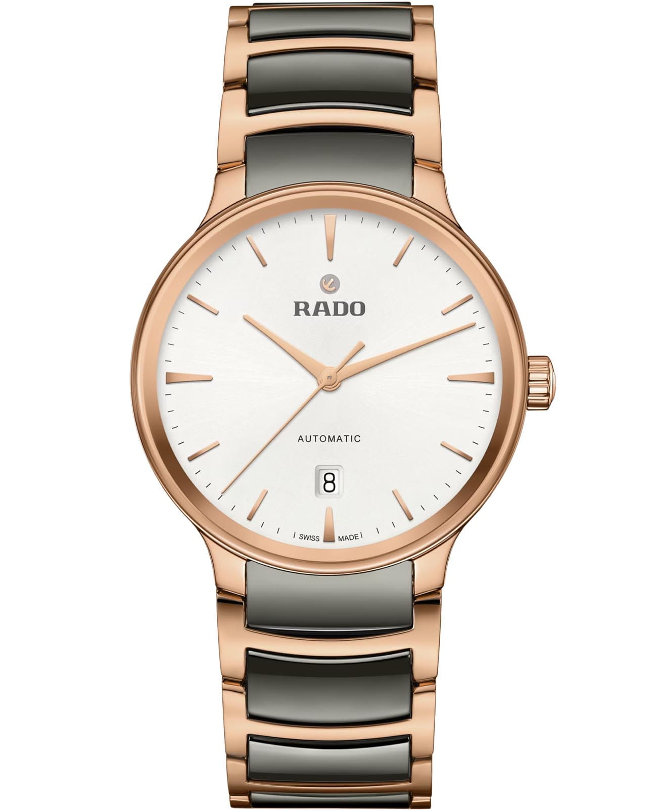 Швейцарские механические часы с автоматическим подзаводом Rado Centrix Automatic R30017012. Корпус часов изготовлен из нержавеющей стали с PVD-покрытиемPVDУльтратонкое покрытие наносится в технике вакуумного напыления, сочетает в себе нитрид титана особой прочности со слоем золота или оксида хрома. Несёт в себе декоративную или защитную функцию.. Браслет из стали и высокотехнологичной керамикиВысокотехнологичная керамикаИнновационный запатентованный Rado материал с гладкой или матовой поверхностью. Керамика за счёт кристаллической структуры обладает повышенной устойчивостью от возникновения царапин. Материал способен принимать температуру тела человека, обеспечивая невероятный комфорт при ношении. на раскладной застёжкеРаскладная застёжкаТакой тип застёжки используется только на браслетах из металла. Она никогда не раскрывается полностью, происходит разделение на 2 и более частей. Раскладывающая застёжка снизит вероятность потери часов к минимуму.. Сапфировое стеклоСапфировое стеклоПрочный и надёжный материал из кристалла сапфира синтетического происхождения, характеризующийся особой твёрдостью и устойчивостью к царапинам и повреждениям. устойчивое к мелким механическим повреждениям. Класс водозащиты: 50 метров, позволит защитить корпус от случайных брызг или капель дождя. Окошко даты находится в положении 6 часов.