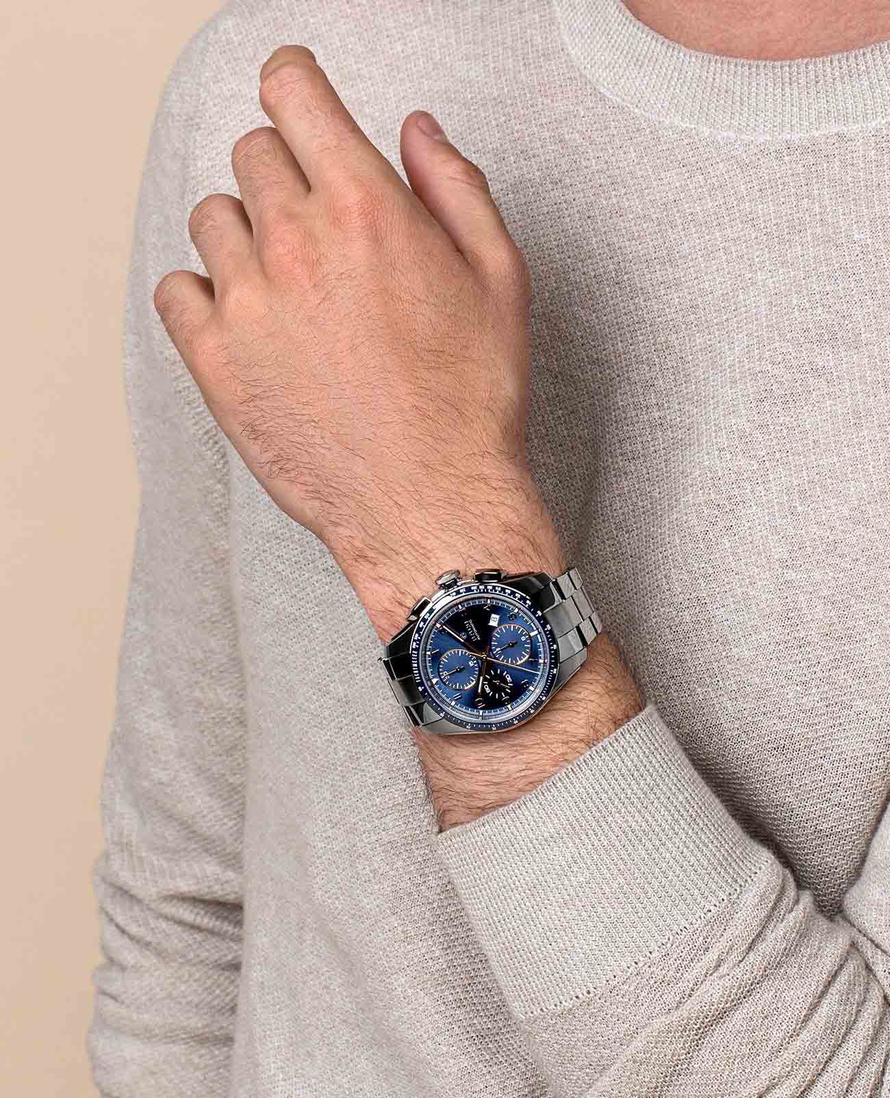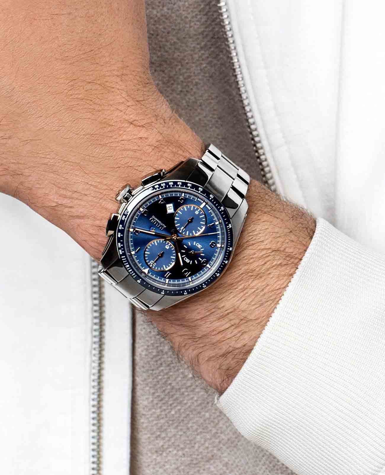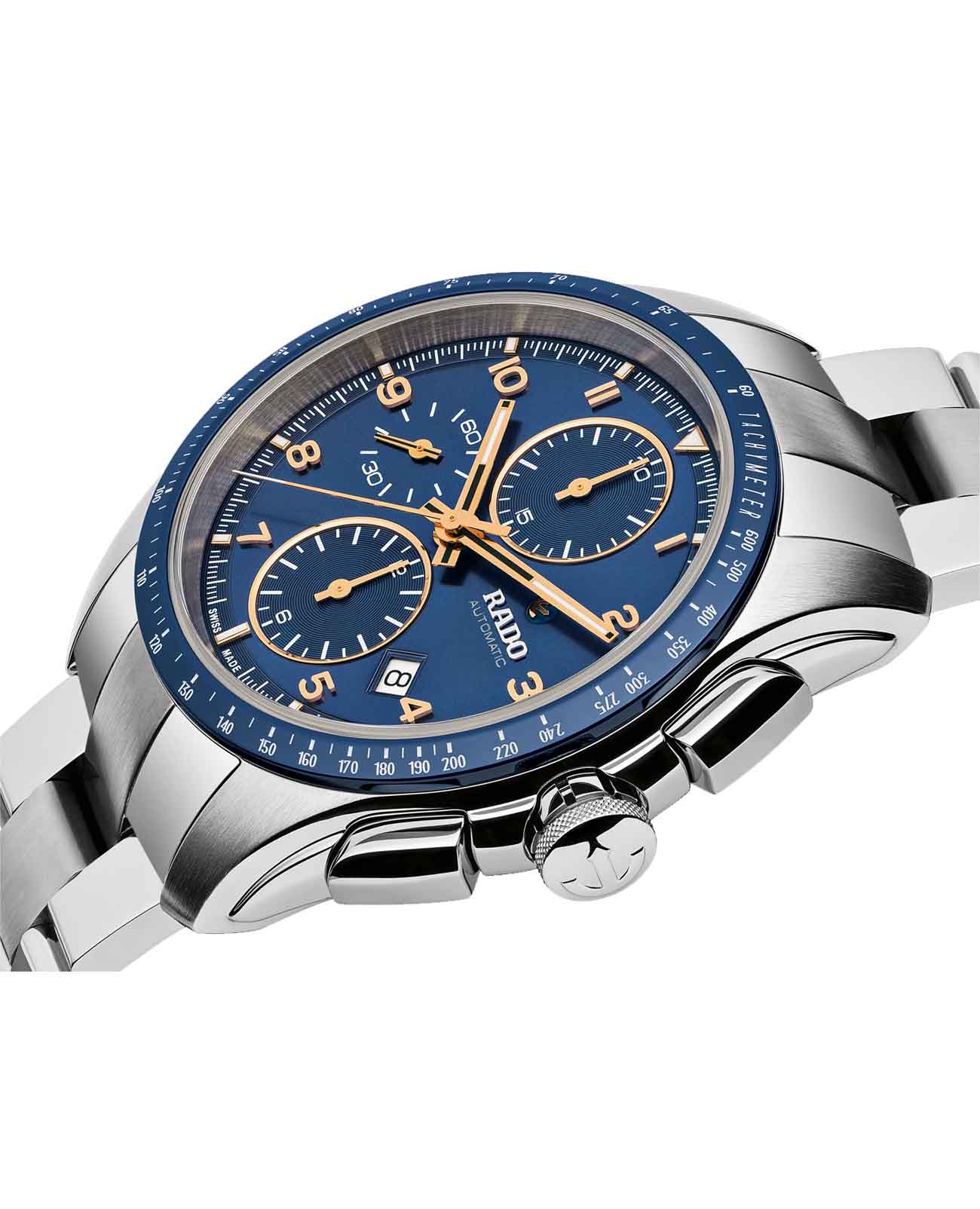 Мужские механические швейцарские часы-хронографХронографФункция позволяет измерять отрезки времени с особой точностью: часы, минуты, секунды. Верным признаком хронографа является наличие на циферблате 3 дополнительных окошек-счётчиков. с автоподзаводом Rado Hyperchrome Automatic Chronograph R32042303. Сапфировое стеклоСапфировое стеклоПрочный и надёжный материал из кристалла сапфира синтетического происхождения, характеризующийся особой твёрдостью и устойчивостью к царапинам и повреждениям. устойчивое к мелким механическим повреждениям. Корпус часов изготовлен из нержавеющей стали и титана. БезельБезельВнешний ободок, закрепляющий стекло. В спортивных часах так называется поворотное кольцо с делениями на циферблате, выполняет роль таймера – замеряет отрезки времени на шкале. Неподвижный безель – элемент декора. Однонаправленно вращающийся безель на дайверских часах позволяет фиксировать моменты погружения и выныривания на поверхность. со шкалой тахиметраТахиметрРазмеченная шкала, располагается на ободке или безеле часов. Тахиметр позволяет рассчитать скорость на определённом участке пути, расстояние измеряется в километрах или милях. из высокотехнологичной керамикиВысокотехнологичная керамикаИнновационный запатентованный Rado материал с гладкой или матовой поверхностью. Керамика за счёт кристаллической структуры обладает повышенной устойчивостью от возникновения царапин. Материал способен принимать температуру тела человека, обеспечивая невероятный комфорт при ношении.. Окошко даты находится в положении между 4 и 5 часами. Стрелки с люминесцентным покрытиемЛюминесцентное покрытиеПозволяет считывать показания времени в темноте. Производители наносят на стрелки, часовые индексы, безель или поверхность циферблата светонакопительный состав, дающий холодное свечение.. Класс водозащиты: 100 метров, позволит плавать, нырять и заниматься другими водными видами спорта. Браслет из нержавеющей стали и титана на раскладной застёжкеРаскладная застёжкаТакой тип застёжки используется только на браслетах из металла. Она никогда не раскрывается полностью, происходит разделение на 2 и более частей. Раскладывающая застёжка снизит вероятность потери часов к минимуму..
