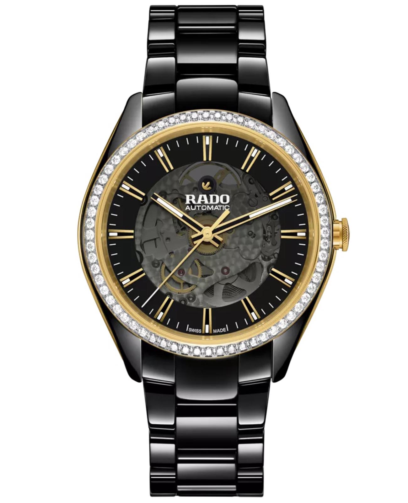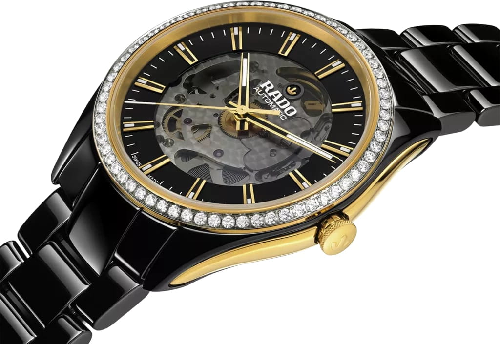 Женские швейцарские механические часы с автоподзаводом Rado Hyperchrome R32157152. Сапфировое стеклоСапфировое стеклоПрочный и надёжный материал из кристалла сапфира синтетического происхождения, характеризующийся особой твёрдостью и устойчивостью к царапинам и повреждениям. устойчивое к мелким механическим повреждениям. Корпус часов изготовлен из нержавеющей стали с PVD-покрытиемPVDУльтратонкое покрытие наносится в технике вакуумного напыления, сочетает в себе нитрид титана особой прочности со слоем золота или оксида хрома. Несёт в себе декоративную или защитную функцию. и высокотехнологичной керамикиВысокотехнологичная керамикаИнновационный запатентованный Rado материал с гладкой или матовой поверхностью. Керамика за счёт кристаллической структуры обладает повышенной устойчивостью от возникновения царапин. Материал способен принимать температуру тела человека, обеспечивая невероятный комфорт при ношении.. Керамический браслет на раскладной застёжкеРаскладная застёжкаТакой тип застёжки используется только на браслетах из металла. Она никогда не раскрывается полностью, происходит разделение на 2 и более частей. Раскладывающая застёжка снизит вероятность потери часов к минимуму.. Стрелки и метки с люминесцентным покрытиемЛюминесцентное покрытиеПозволяет считывать показания времени в темноте. Производители наносят на стрелки, часовые индексы, безель или поверхность циферблата светонакопительный состав, дающий холодное свечение.. Класс водозащиты: 50 метров, позволит защитить корпус от случайных брызг или капель дождя. БезельБезельВнешний ободок, закрепляющий стекло. В спортивных часах так называется поворотное кольцо с делениями на циферблате, выполняет роль таймера – замеряет отрезки времени на шкале. Неподвижный безель – элемент декора. Однонаправленно вращающийся безель на дайверских часах позволяет фиксировать моменты погружения и выныривания на поверхность. инкрустирован бриллиантами.