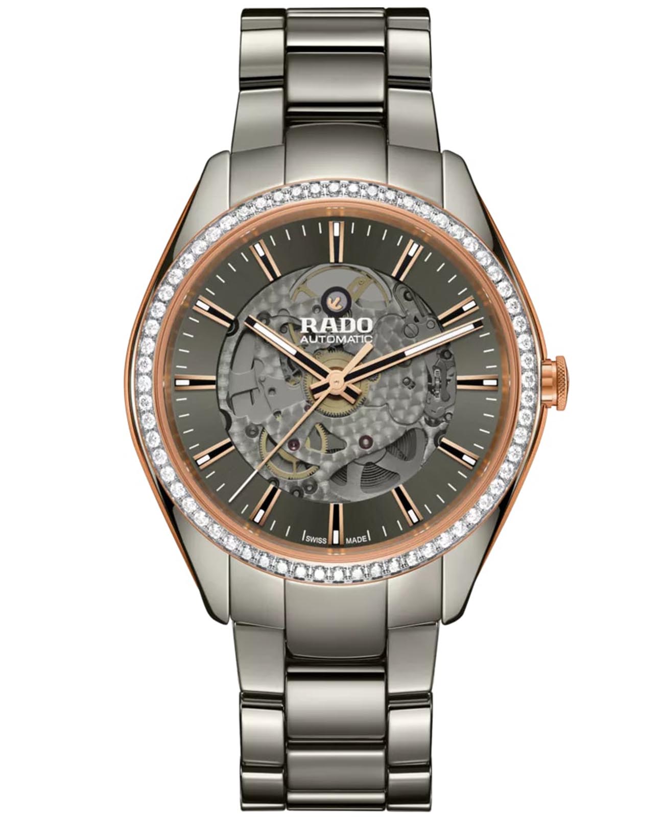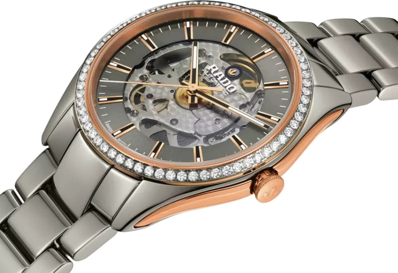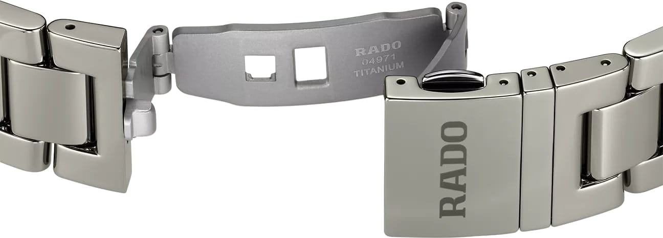 Женские швейцарские механические часы с автоподзаводом Rado Hyperchrome R32158102. Сапфировое стеклоСапфировое стеклоПрочный и надёжный материал из кристалла сапфира синтетического происхождения, характеризующийся особой твёрдостью и устойчивостью к царапинам и повреждениям. устойчивое к мелким механическим повреждениям. Корпус часов изготовлен из нержавеющей стали с PVD-покрытиемPVDУльтратонкое покрытие наносится в технике вакуумного напыления, сочетает в себе нитрид титана особой прочности со слоем золота или оксида хрома. Несёт в себе декоративную или защитную функцию. и высокотехнологичной керамикиВысокотехнологичная керамикаИнновационный запатентованный Rado материал с гладкой или матовой поверхностью. Керамика за счёт кристаллической структуры обладает повышенной устойчивостью от возникновения царапин. Материал способен принимать температуру тела человека, обеспечивая невероятный комфорт при ношении.. Керамический браслет на раскладной застёжкеРаскладная застёжкаТакой тип застёжки используется только на браслетах из металла. Она никогда не раскрывается полностью, происходит разделение на 2 и более частей. Раскладывающая застёжка снизит вероятность потери часов к минимуму.. Стрелки и метки с люминесцентным покрытиемЛюминесцентное покрытиеПозволяет считывать показания времени в темноте. Производители наносят на стрелки, часовые индексы, безель или поверхность циферблата светонакопительный состав, дающий холодное свечение.. Класс водозащиты: 50 метров, позволит защитить корпус от случайных брызг или капель дождя. БезельБезельВнешний ободок, закрепляющий стекло. В спортивных часах так называется поворотное кольцо с делениями на циферблате, выполняет роль таймера – замеряет отрезки времени на шкале. Неподвижный безель – элемент декора. Однонаправленно вращающийся безель на дайверских часах позволяет фиксировать моменты погружения и выныривания на поверхность. инкрустирован бриллиантами.