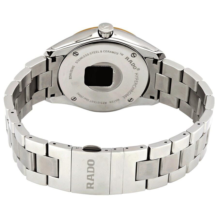 Мужские швейцарские часы с надёжным кварцевым механизмом. Rado Hyperchrome R32188123. Сапфировое стеклоСапфировое стеклоПрочный и надёжный материал из кристалла сапфира синтетического происхождения, характеризующийся особой твёрдостью и устойчивостью к царапинам и повреждениям. устойчивое к мелким механическим повреждениям. Корпус и браслет часов изготовлены из нержавеющей стали и CeramosCeramosМатериал являет собой инновационное сочетание высокотехнологичной керамики и сплава металла. Он объединяет керамическую устойчивость к царапинам и металлический роскошный блеск. . Стальной браслет на раскладной застёжкеРаскладная застёжкаТакой тип застёжки используется только на браслетах из металла. Она никогда не раскрывается полностью, происходит разделение на 2 и более частей. Раскладывающая застёжка снизит вероятность потери часов к минимуму.. Окошко даты находится в положении 3 часа. Стрелки и метки с люминесцентным покрытиемЛюминесцентное покрытиеПозволяет считывать показания времени в темноте. Производители наносят на стрелки, часовые индексы, безель или поверхность циферблата светонакопительный состав, дающий холодное свечение.. Класс водозащиты: 50 метров, позволит защитить корпус от случайных брызг или капель дождя.