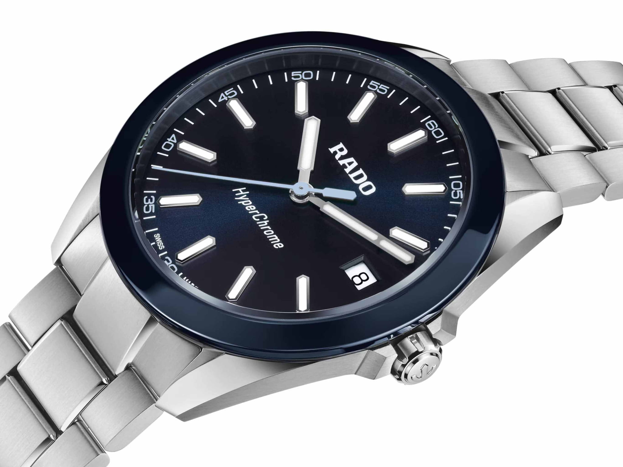 Мужские кварцевые часы Rado HyperChrome — это современное воплощение точности и мастерства материалов. Корпус диаметром 41,5 мм и толщиной 11,7 мм выполнен из полированной и матовой нержавеющей стали. БезельБезельВнешний ободок, закрепляющий стекло. В спортивных часах так называется поворотное кольцо с делениями на циферблате, выполняет роль таймера – замеряет отрезки времени на шкале. Неподвижный безель – элемент декора. Однонаправленно вращающийся безель на дайверских часах позволяет фиксировать моменты погружения и выныривания на поверхность. изготовлен из высокотехнологичной керамикиВысокотехнологичная керамикаИнновационный запатентованный Rado материал с гладкой или матовой поверхностью. Керамика за счёт кристаллической структуры обладает повышенной устойчивостью от возникновения царапин. Материал способен принимать температуру тела человека, обеспечивая невероятный комфорт при ношении. синего цвета, придающей часам прочность и изысканность. Циферблат синего цвета с лакированным покрытием оформлен индексами и стрелками с люминесцентным покрытиемЛюминесцентное покрытиеПозволяет считывать показания времени в темноте. Производители наносят на стрелки, часовые индексы, безель или поверхность циферблата светонакопительный состав, дающий холодное свечение. Super-Luminova®. Особенность подсветки — зелёное свечение метки 12 часов и минутной стрелки, и синее — остальных индексов и часовой стрелки, что обеспечивает интуитивное считывание времени в темноте. Циферблат защищён выпуклым сапфировым стекломСапфировое стеклоПрочный и надёжный материал из кристалла сапфира синтетического происхождения, характеризующийся особой твёрдостью и устойчивостью к царапинам и повреждениям. с антибликовым покрытиемАнтибликовое покрытиеСлой оксида металла в 0,13-0,3 микрон, благодаря которому стекло часов не бликует и не отражает свет. Антибликовое покрытие уменьшает отражение света в 10 раз, обеспечивая отличную читаемость показателей циферблата. на внутренней стороне. Механизм — кварцевый. Окошко даты расположено в положении 3 часов. Часы оснащены трёхрядным стальным браслетом с центральными звеньями и трёхсекционной застёжкой с системой быстрой регулировки. Водонепроницаемость 150 м позволяет использовать часы для плавания и повседневного ношения. Идеальный выбор для тех, кто ценит инновации, точность и смелый дизайн.