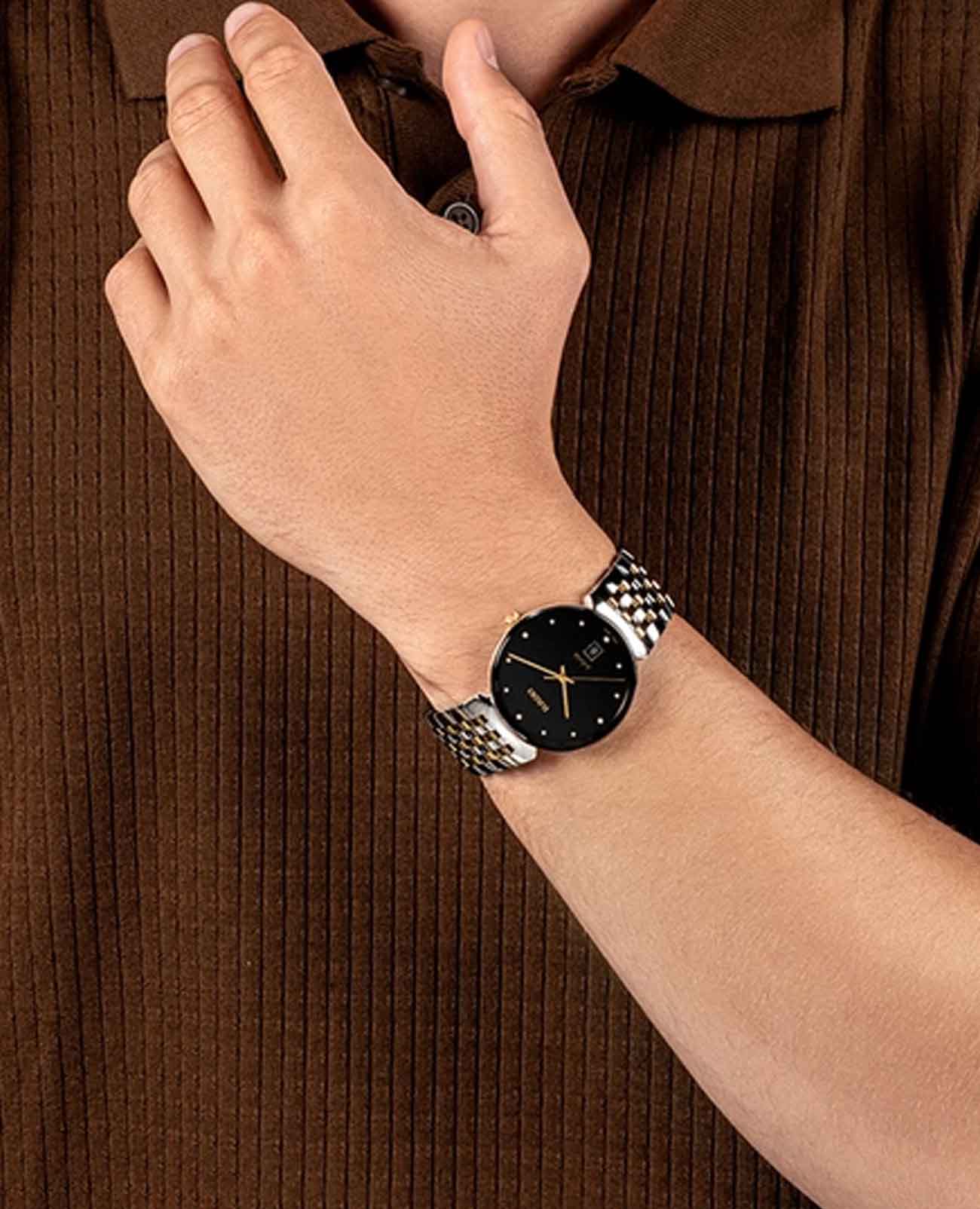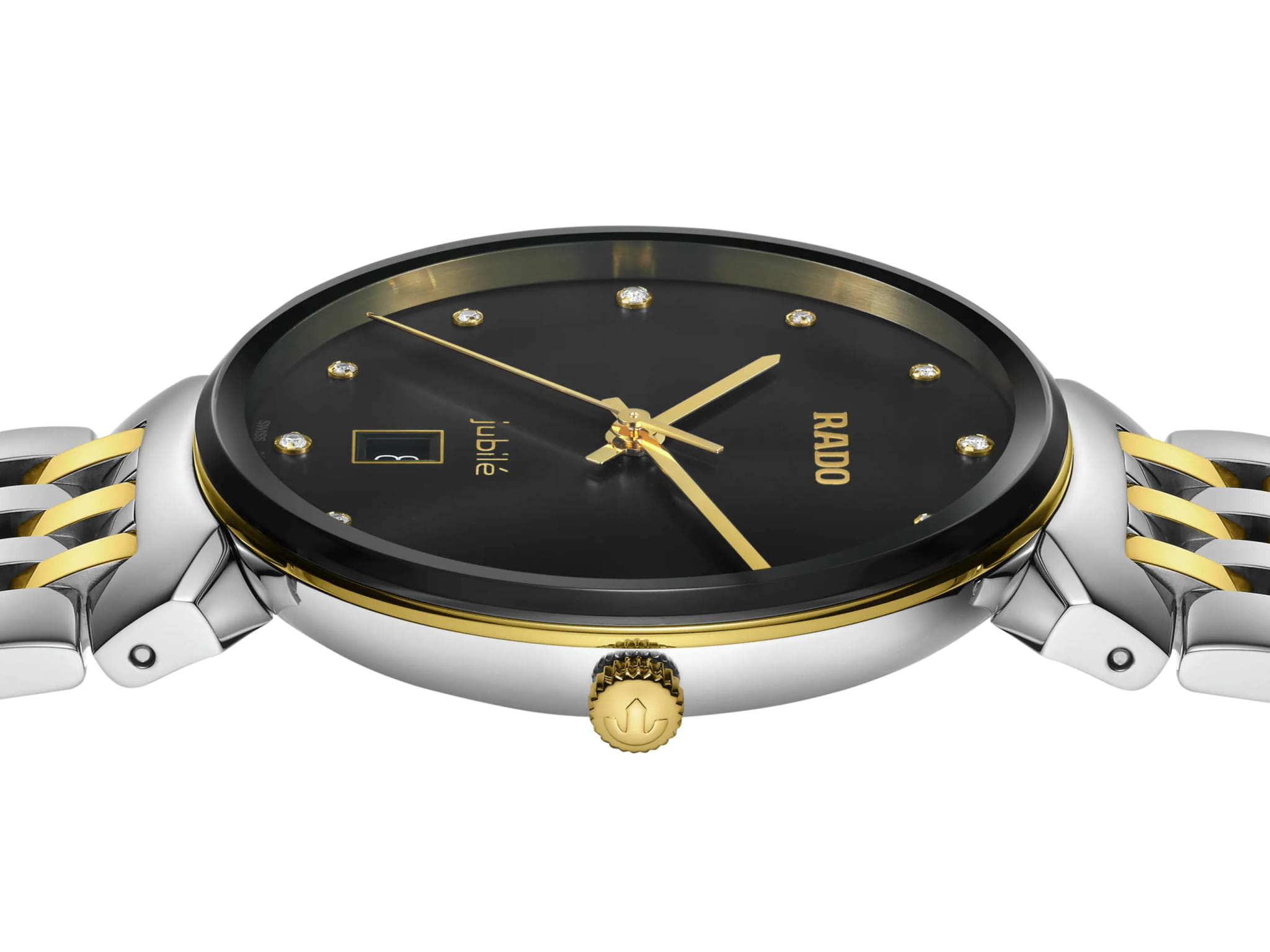 Швейцарские кварцевые часы Rado Florence Classic Diamonds R48912743. Сапфировое стеклоСапфировое стеклоПрочный и надёжный материал из кристалла сапфира синтетического происхождения, характеризующийся особой твёрдостью и устойчивостью к царапинам и повреждениям. устойчивое к мелким механическим повреждениям. Корпус изготовлен из нержавеющей стали с частичным  PVD-покрытиемPVDУльтратонкое покрытие наносится в технике вакуумного напыления, сочетает в себе нитрид титана особой прочности со слоем золота или оксида хрома. Несёт в себе декоративную или защитную функцию.. БезельБезельВнешний ободок, закрепляющий стекло. В спортивных часах так называется поворотное кольцо с делениями на циферблате, выполняет роль таймера – замеряет отрезки времени на шкале. Неподвижный безель – элемент декора. Однонаправленно вращающийся безель на дайверских часах позволяет фиксировать моменты погружения и выныривания на поверхность. с PVD-покрытиемPVDУльтратонкое покрытие наносится в технике вакуумного напыления, сочетает в себе нитрид титана особой прочности со слоем золота или оксида хрома. Несёт в себе декоративную или защитную функцию.. Циферблат украшен бриллиантами. Окошко даты находится в положении 6 часов. Класс водозащиты: 50 метров, позволит защитить корпус от случайных брызг или капель дождя. Браслет из стали с частичным PVD-покрытиемPVDУльтратонкое покрытие наносится в технике вакуумного напыления, сочетает в себе нитрид титана особой прочности со слоем золота или оксида хрома. Несёт в себе декоративную или защитную функцию. на застёжке-бабочкеЗастёжка "бабочка"Такой вид застёжки дополняется предохранителями, помогающими избежать случайного раскрытия браслета. Обладают изящным исполнением. .