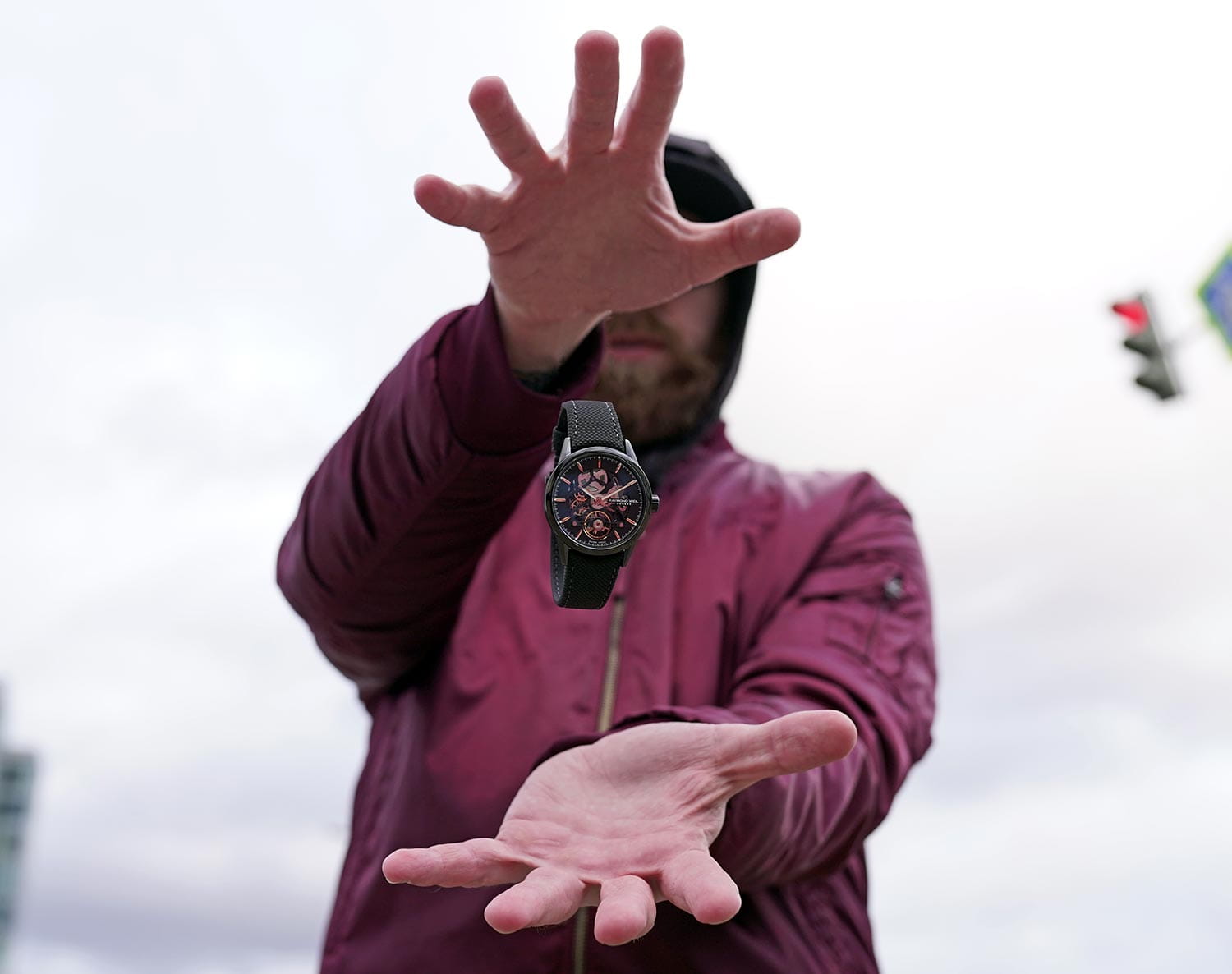 Круглый корпус из нержавеющей стали с черным PVD-покрытиемPVDУльтратонкое покрытие наносится в технике вакуумного напыления, сочетает в себе нитрид титана особой прочности со слоем золота или оксида хрома. Несёт в себе декоративную или защитную функцию. гармонирует с кожаным ремешком с тиснением «под карбон». Сапфировое стеклоСапфировое стеклоПрочный и надёжный материал из кристалла сапфира синтетического происхождения, характеризующийся особой твёрдостью и устойчивостью к царапинам и повреждениям. защищает черный циферблат с открытой центральной частью, предлагая возможность заглянуть в мир часовых механизмов. Запас хода составляет 38 часов, а прозрачная сапфировая задняя крышка позволяет любоваться работой механизма. Завинчивающаяся заводная головка с логотипом RW и браслет с раскладной застёжкойРаскладная застёжкаТакой тип застёжки используется только на браслетах из металла. Она никогда не раскрывается полностью, происходит разделение на 2 и более частей. Раскладывающая застёжка снизит вероятность потери часов к минимуму., имеющей двойную систему защиты, завершают этот элегантный аксессуар.