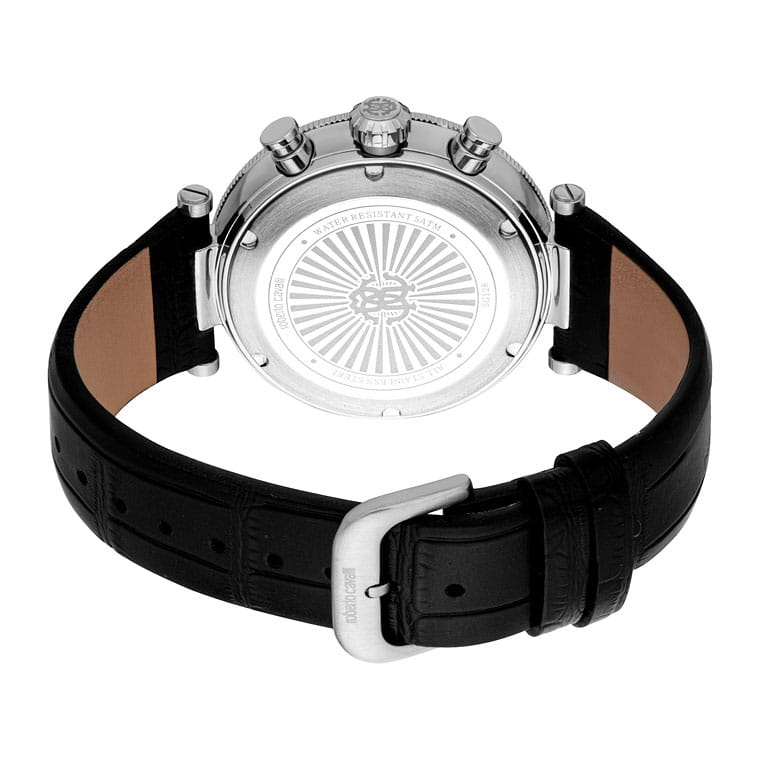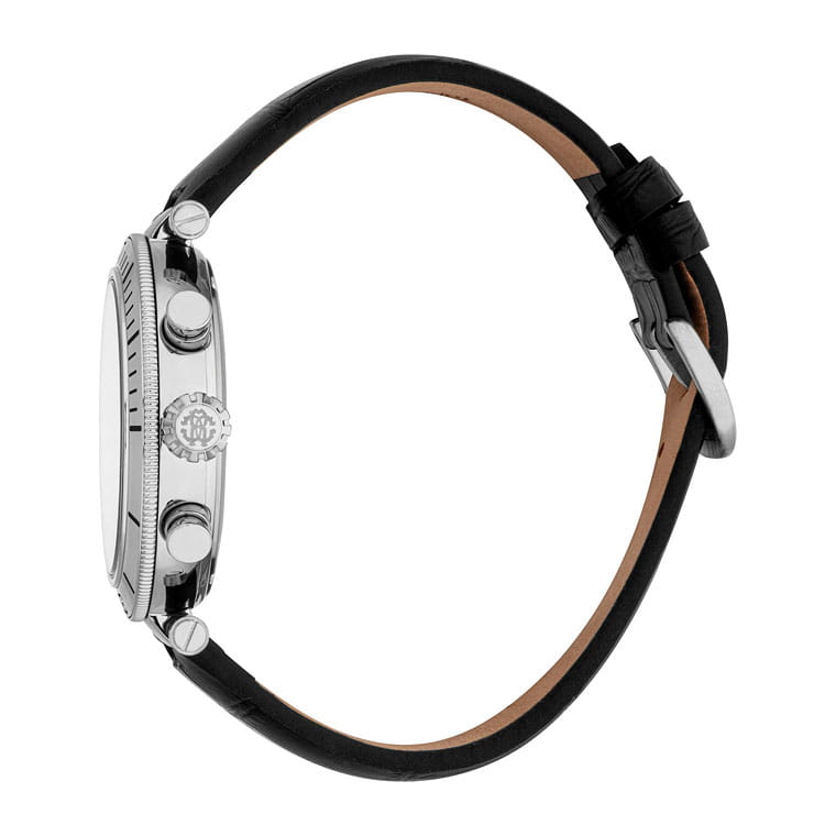 Roberto Cavalli Ritmo RC5G128L0015 — мужская кварцевая модель с ярко выраженным спортивным стилем и практичным функционалом, сочетающая строгий дизайн и надёжность. Корпус диаметром 43 мм и толщиной 12 мм выполнен из нержавеющей стали, защищён прочным минеральным стекломМинеральное стеклоМинеральное стекло представляет собой искусственно выращенный минерал кварца. Такое стекло отличается особой устойчивостью к повреждениям и царапинам. Уступает по некоторым качествам сапфировому стеклу., устойчивым к повседневным повреждениям и сохраняющим хорошую читаемость циферблата. БезельБезельВнешний ободок, закрепляющий стекло. В спортивных часах так называется поворотное кольцо с делениями на циферблате, выполняет роль таймера – замеряет отрезки времени на шкале. Неподвижный безель – элемент декора. Однонаправленно вращающийся безель на дайверских часах позволяет фиксировать моменты погружения и выныривания на поверхность.. Водозащита 100 м делает часы надёжным спутником во время плавания и активного отдыха. Функциональность поддерживается индикаторами хронографаХронографФункция позволяет измерять отрезки времени с особой точностью: часы, минуты, секунды. Верным признаком хронографа является наличие на циферблате 3 дополнительных окошек-счётчиков. и даты, которые органично вписаны в оформление циферблата. Кожаный ремешок шириной 22 мм обеспечивает комфортную посадку и долговечность, а также гармонично завершает образ модели, которая одинаково хорошо подойдёт как для динамичного повседневного ритма, так и для более строгих ситуаций.