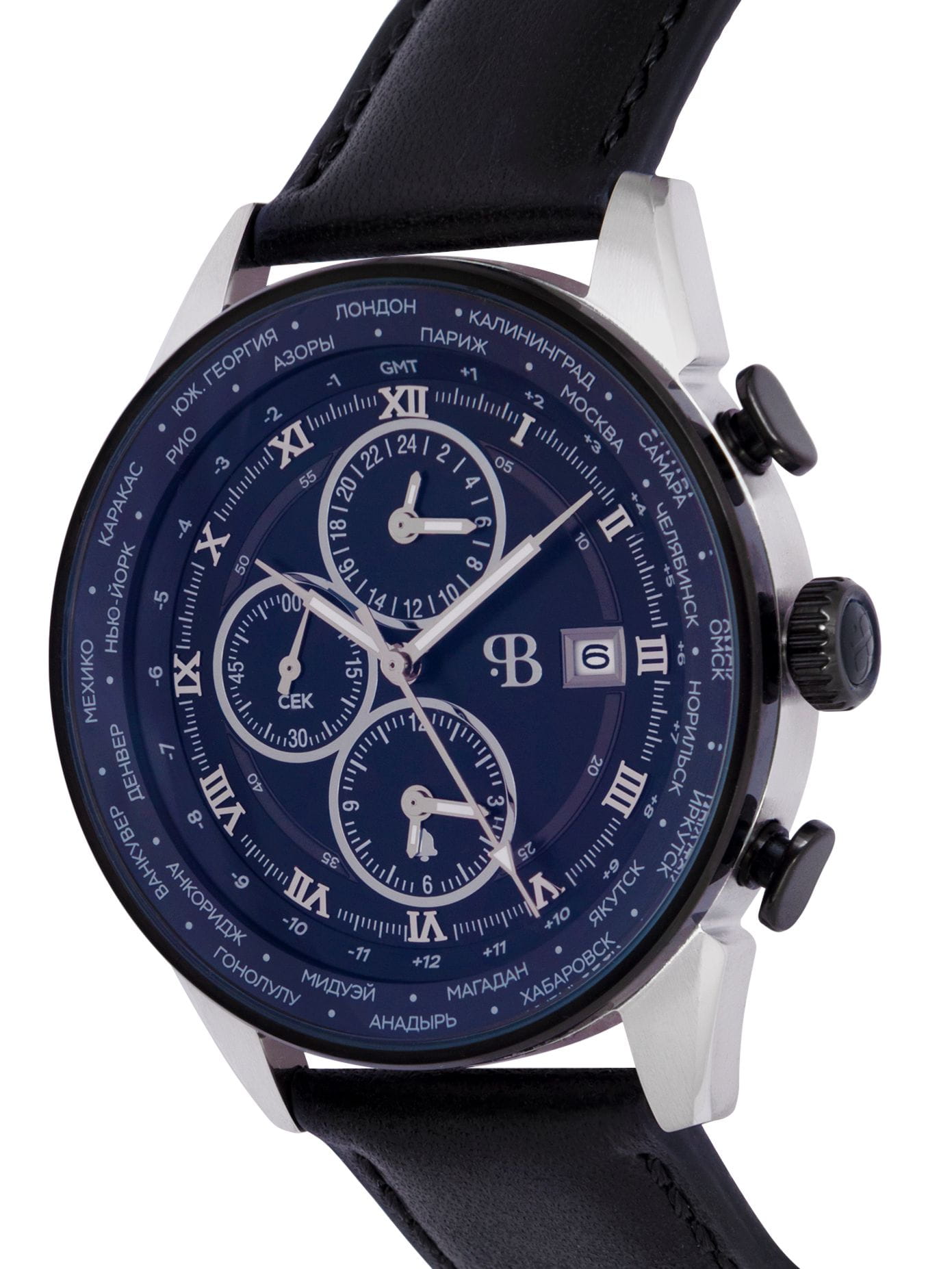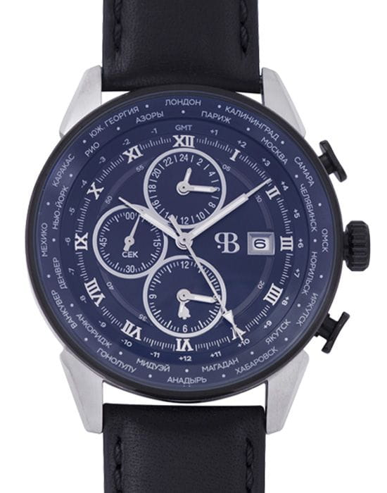 Российские часы Русское время c хронографомХронографФункция позволяет измерять отрезки времени с особой точностью: часы, минуты, секунды. Верным признаком хронографа является наличие на циферблате 3 дополнительных окошек-счётчиков. 75175752 оснащены кварцевый механизм, что обеспечивает исключительную надежность и точность хода. Корпус часов выполнен из стали, что придает ему долговечность и устойчивость к внешним воздействиям Минеральное стеклоМинеральное стеклоМинеральное стекло представляет собой искусственно выращенный минерал кварца. Такое стекло отличается особой устойчивостью к повреждениям и царапинам. Уступает по некоторым качествам сапфировому стеклу. устойчиво к мелким механическим повреждениям, что гарантирует долговечность и сохранение первоначального вида. БезельБезельВнешний ободок, закрепляющий стекло. В спортивных часах так называется поворотное кольцо с делениями на циферблате, выполняет роль таймера – замеряет отрезки времени на шкале. Неподвижный безель – элемент декора. Однонаправленно вращающийся безель на дайверских часах позволяет фиксировать моменты погружения и выныривания на поверхность. с PVD-покрытиемPVDУльтратонкое покрытие наносится в технике вакуумного напыления, сочетает в себе нитрид титана особой прочности со слоем золота или оксида хрома. Несёт в себе декоративную или защитную функцию.. Класс водозащиты часов составляет 50 метров, что позволяет защитить корпус от случайных брызг и капель дождя.Кожаный ремешок на стандартной застежке. Эти часы идеально подойдут для повседневного использования, сочетая в себе стиль, надежность и функциональность. Лимитированная серия.