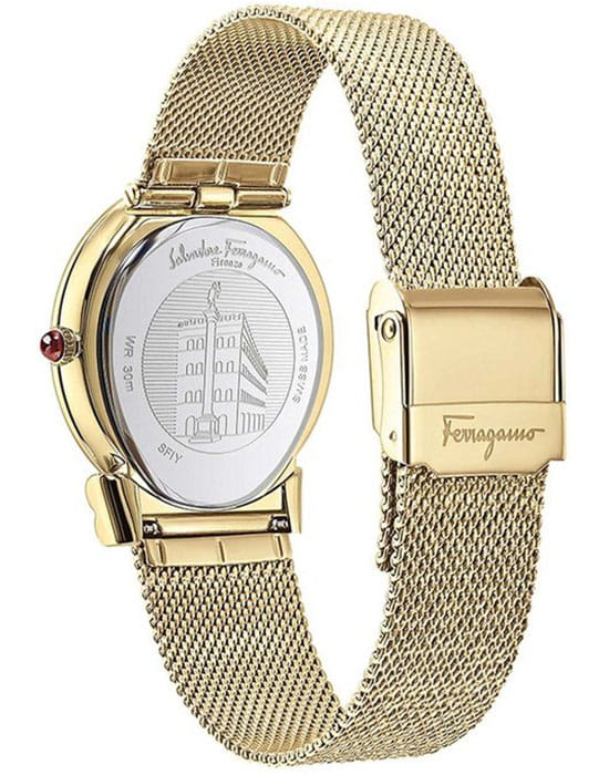 Женские швейцарские часы с сапфировым стеклом Salvatore Ferragamo SFIY00719, кварцевый механизм с высокой точностью. Сапфировое стекло устойчивое к появлению царапин, обладающее высокой прозрачностью. Класс водозащиты: 30 метров, позволит защитить корпус от случайных брызг или капель дождя. Корпус часов изготовлен из стали, золотистого цвета.