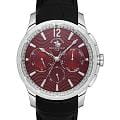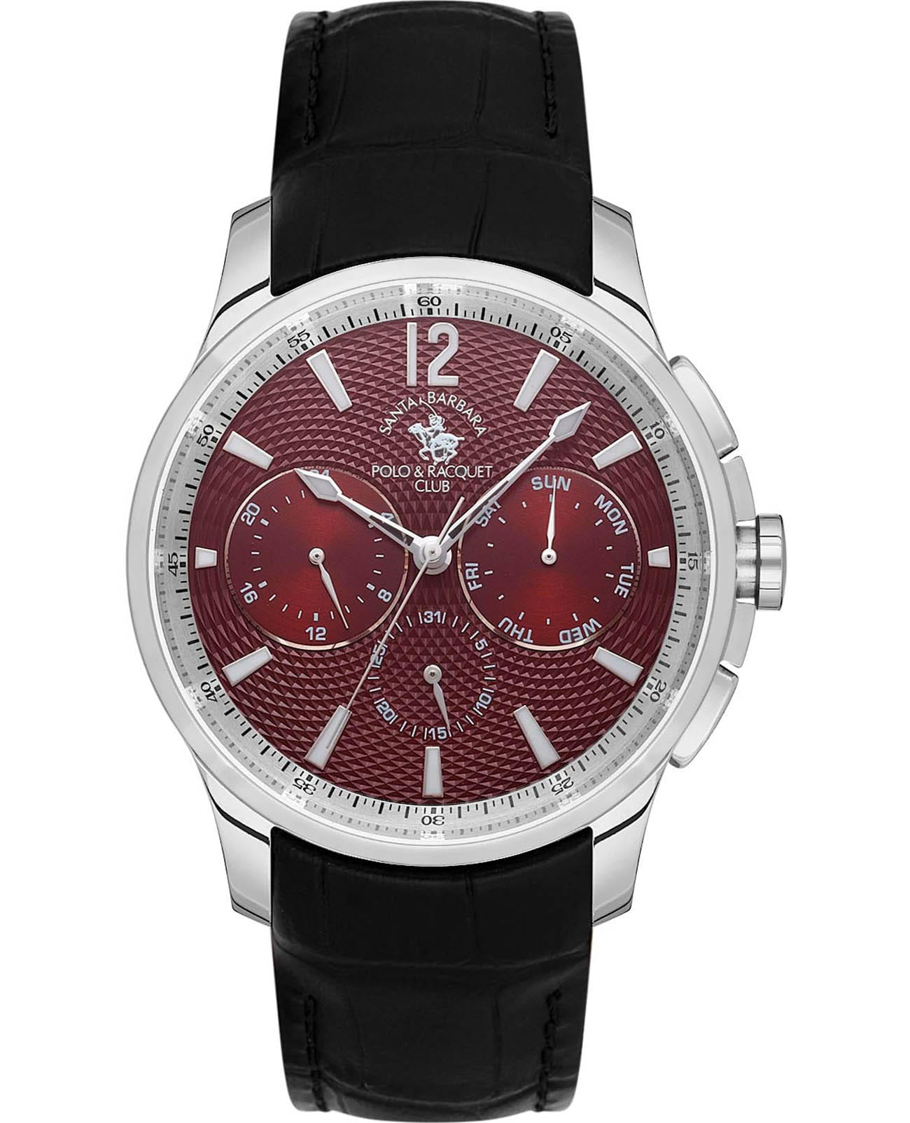 Мужские кварцевые часы Santa Barbara Polo & Racquet Club — это идеальный выбор для тех, кто ценит практичность и стиль. Корпус диаметром 43 мм выполнен из нержавеющей стали 316L с полированной отделкой. Циферблат красного цвета украшен узором и фирменным логотипом, дополнен накладными метками в виде штрихов и арабской цифрой 12. Указатели дня недели и даты вынесены на отдельные субциферблаты, также присутствует индикация 24-часового формата времени. Стрелки и метки с люминесцентным покрытиемЛюминесцентное покрытиеПозволяет считывать показания времени в темноте. Производители наносят на стрелки, часовые индексы, безель или поверхность циферблата светонакопительный состав, дающий холодное свечение., обеспечивающим хорошую читаемость в темноте. Циферблат защищён минеральным стекломМинеральное стеклоМинеральное стекло представляет собой искусственно выращенный минерал кварца. Такое стекло отличается особой устойчивостью к повреждениям и царапинам. Уступает по некоторым качествам сапфировому стеклу.. Часы оснащены кожаным ремешком с застёжкой «бабочка» с кнопкамиЗастёжка "бабочка"Такой вид застёжки дополняется предохранителями, помогающими избежать случайного раскрытия браслета. Обладают изящным исполнением. . Водонепроницаемость 50 м позволяет использовать часы в повседневных условиях. Идеальный выбор для тех, кто ценит классический дизайн, точность и надёжность.