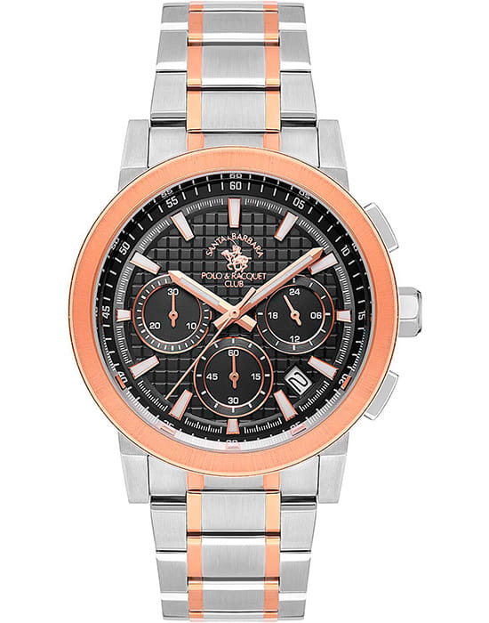 Santa Barbara Polo & Racquet Club — стильный мужской хронограф, сочетающий спортивную динамику и функциональность. Крупный корпус выполнен из нержавеющей стали с PVD-покрытиемPVDУльтратонкое покрытие наносится в технике вакуумного напыления, сочетает в себе нитрид титана особой прочности со слоем золота или оксида хрома. Несёт в себе декоративную или защитную функцию. и гармонично дополнен браслетом с PVD-покрытиемPVDУльтратонкое покрытие наносится в технике вакуумного напыления, сочетает в себе нитрид титана особой прочности со слоем золота или оксида хрома. Несёт в себе декоративную или защитную функцию. на застёжке-бабочке с кнопкамиЗастёжка "бабочка"Такой вид застёжки дополняется предохранителями, помогающими избежать случайного раскрытия браслета. Обладают изящным исполнением. .