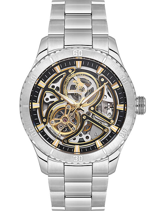Мужские механические часы с автоподзаводом Santa Barbara Polo & Racquet Club Luxury — это стильный и функциональный аксессуар для современного джентльмена. Изысканный корпус из стали 316L  диаметром 42.5 мм. Изящный скелетонизированный циферблат украшен фирменным логотипом, с метками. Накладные лаконичные метки и стрелки с люминесцентным покрытиемЛюминесцентное покрытиеПозволяет считывать показания времени в темноте. Производители наносят на стрелки, часовые индексы, безель или поверхность циферблата светонакопительный состав, дающий холодное свечение., обеспечивающим хорошую читаемость в темноте. Циферблат защищён минеральным стекломМинеральное стеклоМинеральное стекло представляет собой искусственно выращенный минерал кварца. Такое стекло отличается особой устойчивостью к повреждениям и царапинам. Уступает по некоторым качествам сапфировому стеклу., устойчивым к царапинам и механическим повреждениям. Стальной браслет на застёжке-бабочке с кнопкамиЗастёжка "бабочка"Такой вид застёжки дополняется предохранителями, помогающими избежать случайного раскрытия браслета. Обладают изящным исполнением. обеспечивает комфортное и безопасное ношение. Водонепроницаемость 50 м позволяет использовать часы в повседневных условиях. Идеальный выбор для тех, кто ценит элегантность, точность и надёжность.