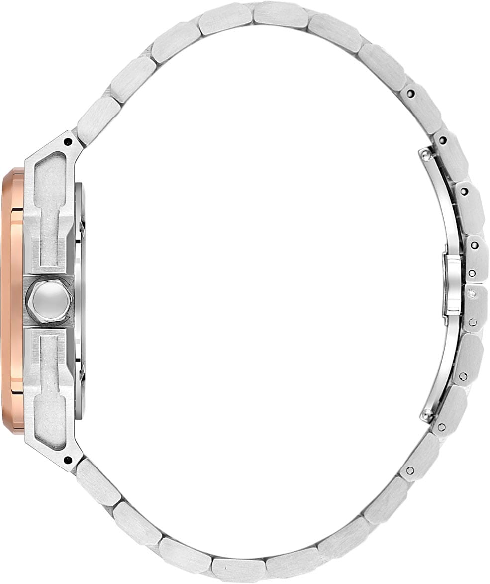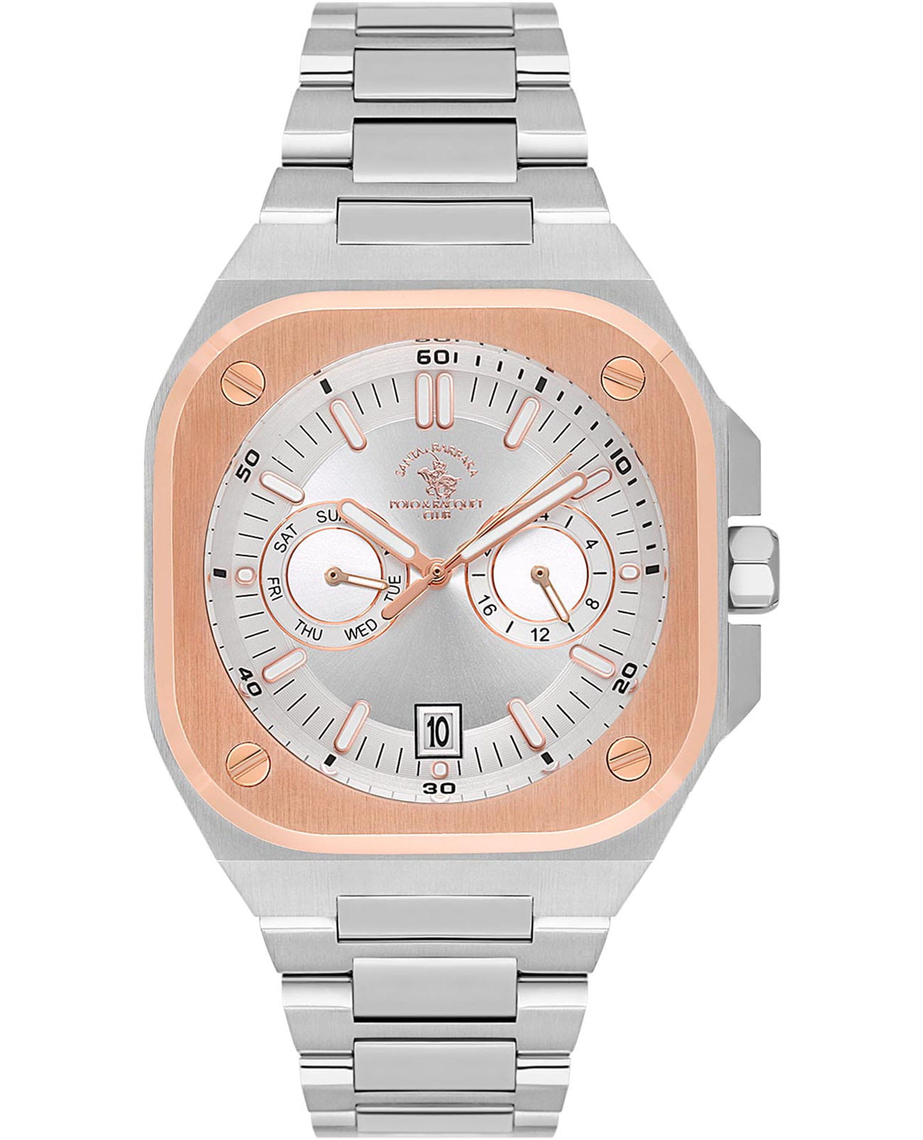 Мужские кварцевые часы Santa Barbara Polo & Racquet Club Luxury SB.1.10576-4 — воплощение элегантности и технического совершенства. Корпус из нержавеющей стали 316L, диаметром 41 мм, что делает их устойчивыми к внешним воздействиям и придает благородный вид. Неподвижный безельБезельВнешний ободок, закрепляющий стекло. В спортивных часах так называется поворотное кольцо с делениями на циферблате, выполняет роль таймера – замеряет отрезки времени на шкале. Неподвижный безель – элемент декора. Однонаправленно вращающийся безель на дайверских часах позволяет фиксировать моменты погружения и выныривания на поверхность. с IP-покрытиемIP-покрытиеМетод ионного напыления. Демонстрирует повышенную устойчивость к истиранию, окислению и химическим веществам. Под воздействием высокого давления и температуры около 1500°C молекулы металла надёжно соединяются с частицами корпуса часов. розового золота. Стрелки и метки с люминесцентным покрытиемЛюминесцентное покрытиеПозволяет считывать показания времени в темноте. Производители наносят на стрелки, часовые индексы, безель или поверхность циферблата светонакопительный состав, дающий холодное свечение., обеспечивающим хорошую читаемость в темноте. Циферблат защищён минеральным стекломМинеральное стеклоМинеральное стекло представляет собой искусственно выращенный минерал кварца. Такое стекло отличается особой устойчивостью к повреждениям и царапинам. Уступает по некоторым качествам сапфировому стеклу. устойчивое к царапинам и механическим повреждениям. Окошко даты находится в положении отметки 6 часов. Указатель дня недели вынесен на отдельный циферблат, также присутствует индикация 24-часового формата времени. Часы оснащены надежным стальным браслетом с застёжкой-бабочкаЗастёжка "бабочка"Такой вид застёжки дополняется предохранителями, помогающими избежать случайного раскрытия браслета. Обладают изящным исполнением. , обеспечивающая комфортное и безопасное ношение. Водонепроницаемость 50 метров позволит защитить корпус от случайных брызг или капель дождя. Идеальный выбор для тех, кто ценит элегантный дизайн и качество.