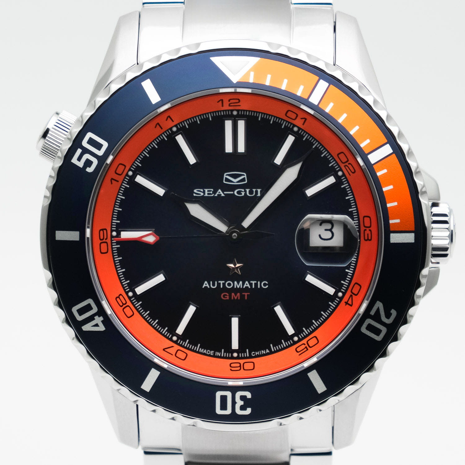 Seagull 816.32.6155 - автоматическая модель с функцией GMTGMTОтображение времени второго часового пояса.Такая функция особенно актуальна для путешественников и бизнесменов,которые общаются с людьми из разных стран,теперь вы всегда будете знать,какой час у вашего партнёра или близкого человека. и ярким двухцветным акцентом. Внутри установлен механизм Sea-Gull ST2130 с запасом хода до 42 часов. Индикация включает часы и минуты по центру, дату с увеличением и отображение второго часового пояса. Синий циферблат сочетается со стрелками и метками с Люминесцентным покрытиемЛюминесцентное покрытиеПозволяет считывать показания времени в темноте. Производители наносят на стрелки, часовые индексы, безель или поверхность циферблата светонакопительный состав, дающий холодное свечение., обеспечивая читаемость при слабом освещении. Корпус 44 мм из стали 316L оснащён однонаправленным БезелемБезельВнешний ободок, закрепляющий стекло. В спортивных часах так называется поворотное кольцо с делениями на циферблате, выполняет роль таймера – замеряет отрезки времени на шкале. Неподвижный безель – элемент декора. Однонаправленно вращающийся безель на дайверских часах позволяет фиксировать моменты погружения и выныривания на поверхность. с контрастным оформлением. Лицевая часть закрыта Сапфировым стекломСапфировое стеклоПрочный и надёжный материал из кристалла сапфира синтетического происхождения, характеризующийся особой твёрдостью и устойчивостью к царапинам и повреждениям.. Стальной браслет фиксируется на Раскладной застёжкеРаскладная застёжкаТакой тип застёжки используется только на браслетах из металла. Она никогда не раскрывается полностью, происходит разделение на 2 и более частей. Раскладывающая застёжка снизит вероятность потери часов к минимуму.. Водозащита WR 200 рассчитана на активное использование и погружения.