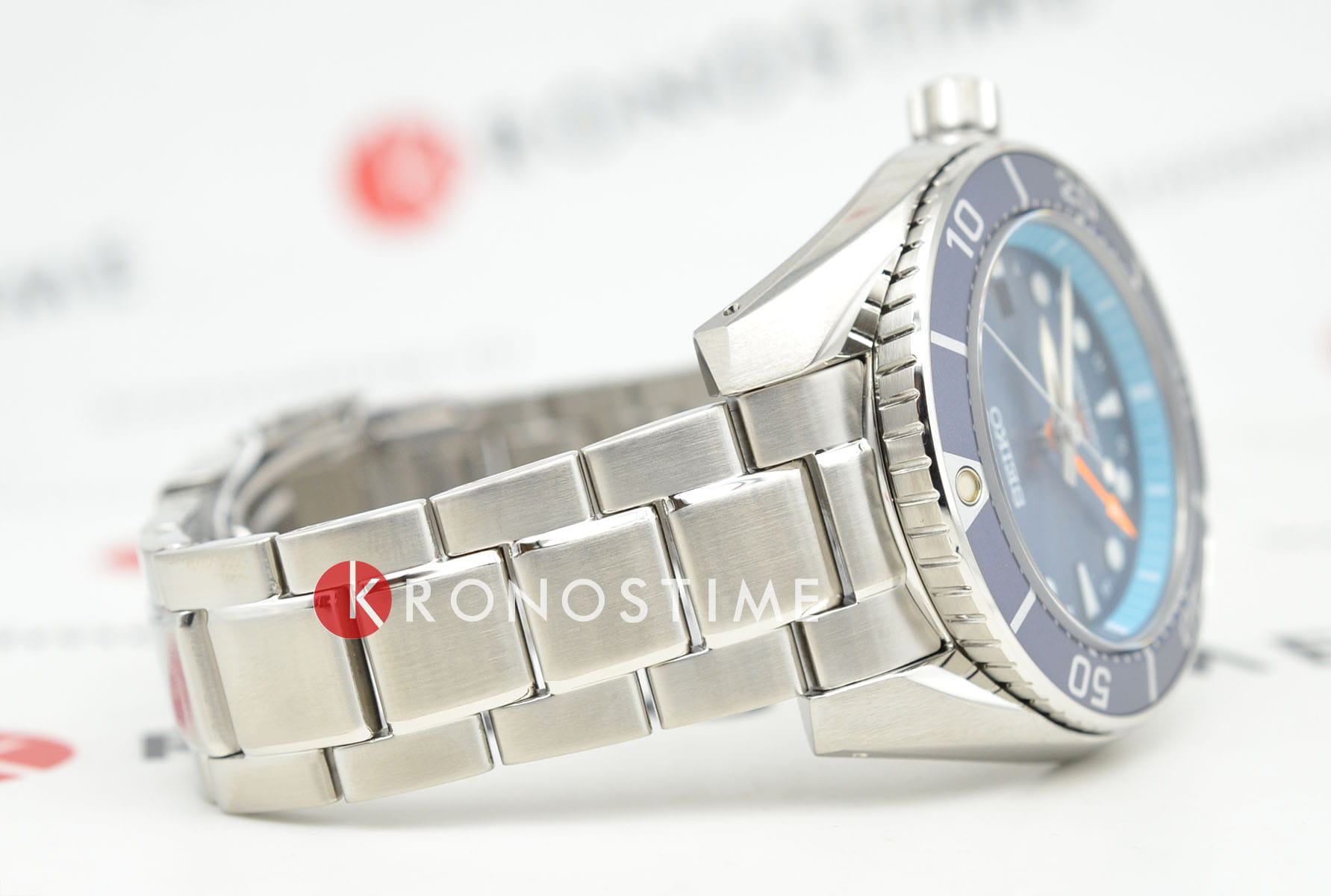 Seiko Prospex Aqua Sumo SFK001J1 — это надёжные водонепроницаемые часы, созданные для активного образа жизни и подводных приключений. Модель оснащена кварцевым механизмом с солнечным питанием, обеспечивающим запас хода до 9 месяцев при полной зарядке. Также реализована функция предотвращения перезарядкиEOLПредставляет собой систему, уведомляющую владельца часов о необходимости замены элемента питания. За 2 недели до полного разряда батарейки секундная стрелка перестаёт ходить чётко и начинает перепрыгивать на 3-4 деления. и функция корректировки разницы во времени, привязанная к календарю. Второй часовой пояс отображается центральной стрелкой в 24-часовом формате. Циферблат синего цвета выполнен по технологии Sunray, имитирующей солнечные лучи, и дополнен штриховыми метками и точками. Стрелки и индексы покрыты фирменным люминесцентным составомЛюминесцентное покрытиеПозволяет считывать показания времени в темноте. Производители наносят на стрелки, часовые индексы, безель или поверхность циферблата светонакопительный состав, дающий холодное свечение. LumiBrite, обеспечивающим отличную читаемость даже в темноте. Окошко даты расположено в положении 3 часов, что делает её легко читаемой. Защиту циферблата обеспечивает сапфировое стеклоСапфировое стеклоПрочный и надёжный материал из кристалла сапфира синтетического происхождения, характеризующийся особой твёрдостью и устойчивостью к царапинам и повреждениям. с антибликовым покрытием на внутренней поверхности. Часы имеют односторонне вращающийся безельБезельВнешний ободок, закрепляющий стекло. В спортивных часах так называется поворотное кольцо с делениями на циферблате, выполняет роль таймера – замеряет отрезки времени на шкале. Неподвижный безель – элемент декора. Однонаправленно вращающийся безель на дайверских часах позволяет фиксировать моменты погружения и выныривания на поверхность. с 24-часовой шкалой, удобный при расчёте времени погружения. Заводная головка с защитой расположена в положении 4 часов и имеет , как и задняя крышка, что обеспечивает дополнительную защиту механизма. Корпус диаметром 45 мм изготовлен из стали с частичным PVD-покрытиемPVDУльтратонкое покрытие наносится в технике вакуумного напыления, сочетает в себе нитрид титана особой прочности со слоем золота или оксида хрома. Несёт в себе декоративную или защитную функцию., придающим модели благородный внешний вид. Браслет выполнен из стали и оснащён трёхсгибной раскладной застёжкойРаскладная застёжкаТакой тип застёжки используется только на браслетах из металла. Она никогда не раскрывается полностью, происходит разделение на 2 и более частей. Раскладывающая застёжка снизит вероятность потери часов к минимуму. с системой блокировки и удлинением для дайверовУдлинение для дайверовЗастёжка с удлинением для дайверов представляет собой безопасное крепление, которое позволяет надевать часы поверх гидрокостюма. Гибкая застёжка удлиняется на 1-2 миллиметра., что позволяет надевать часы поверх гидрокостюма. Общая длина браслета составляет 200 мм, ширина — 20 мм. Часы водонепроницаемы до 200 метров (), что позволяет использовать их при профессиональном дайвинге и других водных активностях. Также реализована защита от магнитных полей до 4800 А/м. Эти часы станут универсальным аксессуаром для тех, кто ценит соче