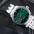 Мужские наручные часы Seiko SSA441J1 из коллекции Presage Cocktail Time сочетают в себе классический дизайн и надежность современных технологий. Модель обладает круглым корпусом диаметром 40,5 мм, изготовленным из нержавеющей стали, что обеспечивает высокую устойчивость к внешним воздействиям . Толщина корпуса составляет 11,8 мм, а для защиты используется минеральное стеклоМинеральное стеклоМинеральное стекло представляет собой искусственно выращенный минерал кварца. Такое стекло отличается особой устойчивостью к повреждениям и царапинам. Уступает по некоторым качествам сапфировому стеклу. Hardlex Crystal, обеспечивающее прочную защиту от царапин . Браслет также выполнен из нержавеющей стали с раскладной застежкойРаскладная застёжкаТакой тип застёжки используется только на браслетах из металла. Она никогда не раскрывается полностью, происходит разделение на 2 и более частей. Раскладывающая застёжка снизит вероятность потери часов к минимуму., гарантирующей комфортное ношение . Циферблат зеленого цвета украшен текстурой, которая подчеркивает элегантный стиль модели. асы работают на автоматическом механизме с калибром 4R38, который включает 23 камня и обладает запасом хода до 41 часа. Водонепроницаемость составляет WR 50, что позволяет защитить корпус от случайных брызг и кратковременного контакта с водой . Вдохновленные культурой японских коктейлей, эти часы демонстрируют уникальный стиль и внимание к деталям.