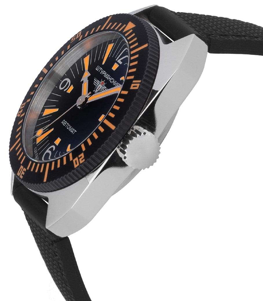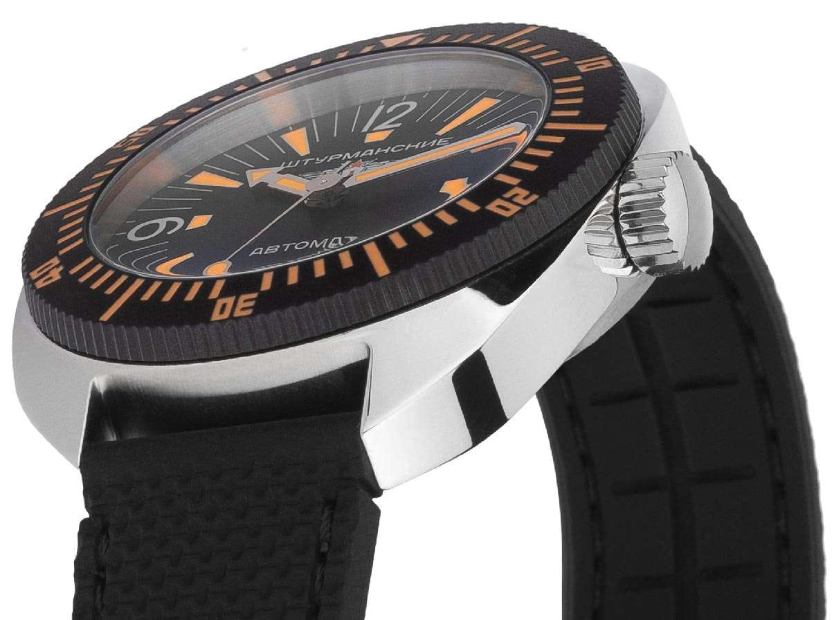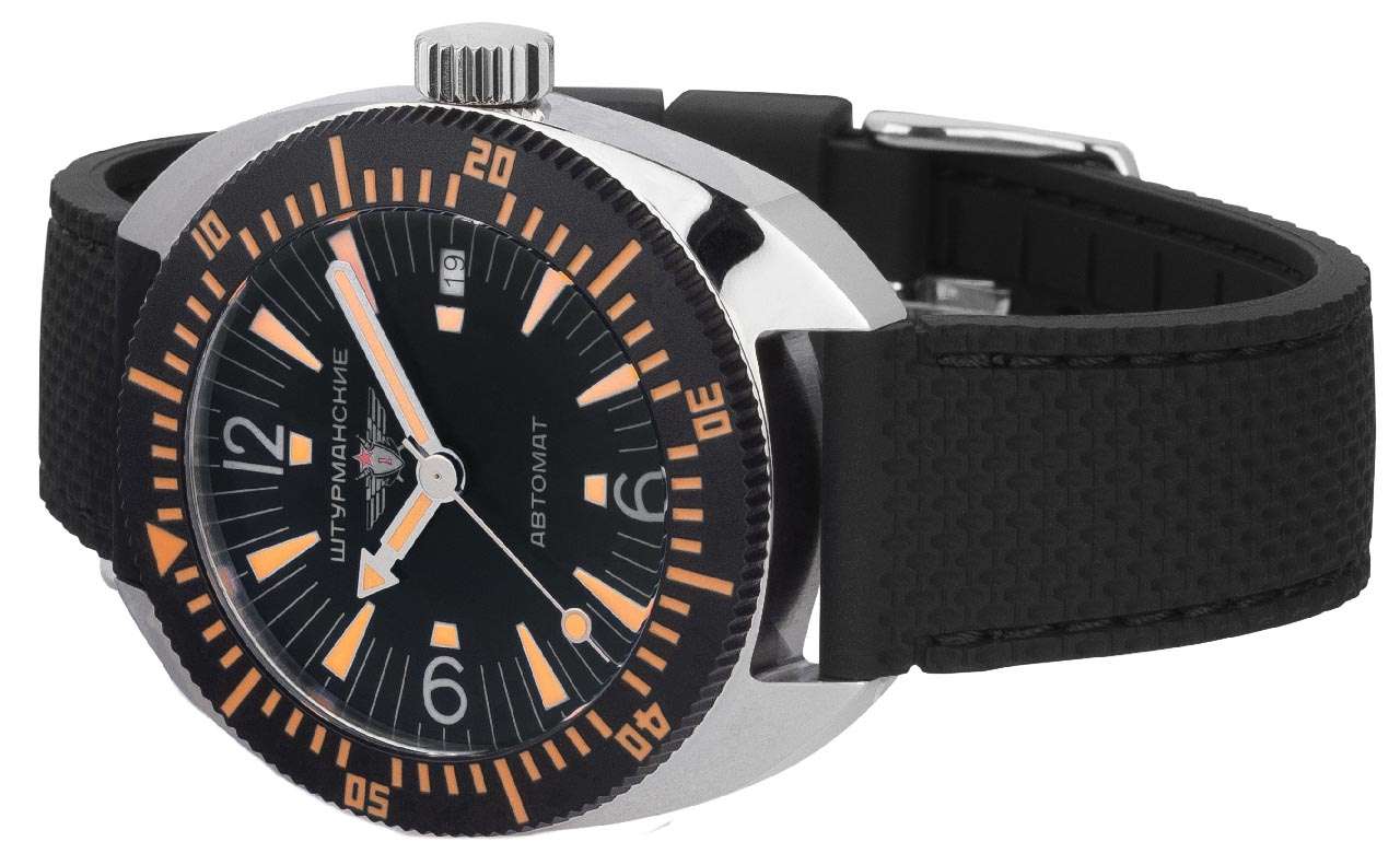 Мужские механические часы с автоподзаводом Штурманские Амфибия 2416/8881504 с высокой точностью. Корпус из нержавеющей стали диаметром 42 мм идеально сбалансирован и элегантен. Минеральное стеклоМинеральное стеклоМинеральное стекло представляет собой искусственно выращенный минерал кварца. Такое стекло отличается особой устойчивостью к повреждениям и царапинам. Уступает по некоторым качествам сапфировому стеклу. устойчивое к мелким механическим повреждениям. Силиконовый ремешок на стандартной застёжке, обеспечивает комфортное ношение. Класс водозащиты: 200 метров, позволит плавать, нырять и заниматься другими водными видами спорта. Стрелки и метки на циферблате имеют люминесцентное покрытиеЛюминесцентное покрытиеПозволяет считывать показания времени в темноте. Производители наносят на стрелки, часовые индексы, безель или поверхность циферблата светонакопительный состав, дающий холодное свечение., которое светится в темноте после непродолжительной зарядки на свету. Окошко даты находится в положении 3 часа. Рифленая заводная головка. БезельБезельВнешний ободок, закрепляющий стекло. В спортивных часах так называется поворотное кольцо с делениями на циферблате, выполняет роль таймера – замеряет отрезки времени на шкале. Неподвижный безель – элемент декора. Однонаправленно вращающийся безель на дайверских часах позволяет фиксировать моменты погружения и выныривания на поверхность. с PVD-покрытиемPVDУльтратонкое покрытие наносится в технике вакуумного напыления, сочетает в себе нитрид титана особой прочности со слоем золота или оксида хрома. Несёт в себе декоративную или защитную функцию. и минутной шкалой поворачивается в одном направлении.