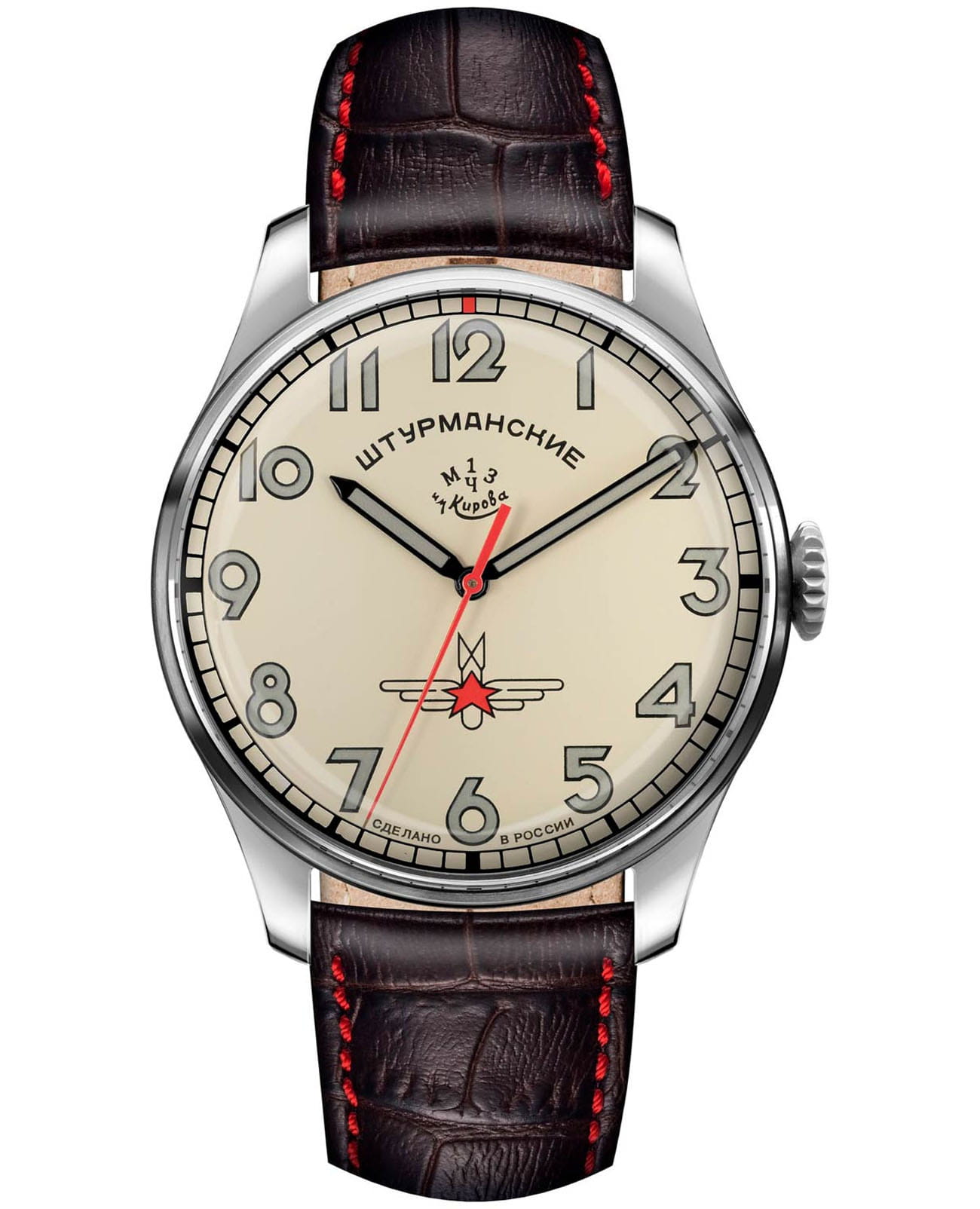 Мужские российские механические часы Штурманские Гагарин Наследие 2609/3747477, механический механизм (автоматический калибр) с высокой точностью. Минеральное стеклоМинеральное стеклоМинеральное стекло представляет собой искусственно выращенный минерал кварца. Такое стекло отличается особой устойчивостью к повреждениям и царапинам. Уступает по некоторым качествам сапфировому стеклу. устойчивое к мелким механическим повреждениям. Класс водозащиты: 30 метров, позволит защитить корпус от случайных брызг или капель дождя. Корпус часов изготовлен из титана. Кожаный ремешок на стандартной застёжке. Стрелки и метки с люминесцентным покрытиемЛюминесцентное покрытиеПозволяет считывать показания времени в темноте. Производители наносят на стрелки, часовые индексы, безель или поверхность циферблата светонакопительный состав, дающий холодное свечение.. Чёткая, читаемая минутная шкала уходит за приделы видимой области циферблата, подчёркивая изящность ободка корпуса. Оцифровка циферблата – отличительная особенность данной модели, её дизайн не изменился с самой первый, гагаринской серии. Заводная головка конической формы с удобной насечкой повторяет дизайн оригинальной модели.