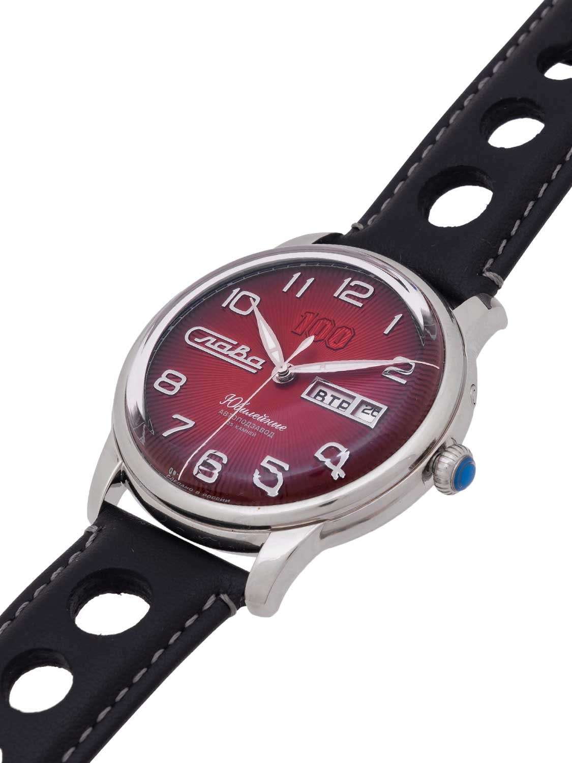 Часы Слава Юбилейные 2600675/300-2427 представляют собой воплощение российского часового искусства, сочетая в себе традиции и современные технологии. Эти механические часы с автоподзаводом оснащены калибром «Слава 2427», который обеспечивает надежную и точную работу. Корпус из высококачественной стали диаметром 44 мм и толщиной 14,5 мм придает часам солидность и долговечность. Циферблат выполнен в благородном красном цвете и оформлен арабскими цифрами, обеспечивая удобство чтения времени. Прочное выпуклое сапфировое стеклоСапфировое стеклоПрочный и надёжный материал из кристалла сапфира синтетического происхождения, характеризующийся особой твёрдостью и устойчивостью к царапинам и повреждениям. защищает циферблат от царапин и повреждений. Особенностью модели является наличие календаря, отображающего число и день недели в положении 3 часа. Стрелки с люминесцентным покрытиемЛюминесцентное покрытиеПозволяет считывать показания времени в темноте. Производители наносят на стрелки, часовые индексы, безель или поверхность циферблата светонакопительный состав, дающий холодное свечение., что облегчает чтение времени даже в условиях слабого освещения. Часы обладают водозащитой уровня 100WR, что делает их подходящими для повседневного ношения и активного образа жизни. Кожаный ремешок с классической застежкой добавляет модели изысканности и комфорта в носке. Эта модель представлена в лимитированной серии из 300 экземпляров, что делает её не только надежным функциональным аксессуаром, но и ценным предметом для коллекционеров. Прозрачная задняя крышка позволяет наблюдать за работой механизма, который включает в себя 25 камней и имеет частоту 18000 полуколебаний в час. Запас хода составляет до 40 часов, а противоударное устройство оси баланса обеспечивает дополнительную надежность.