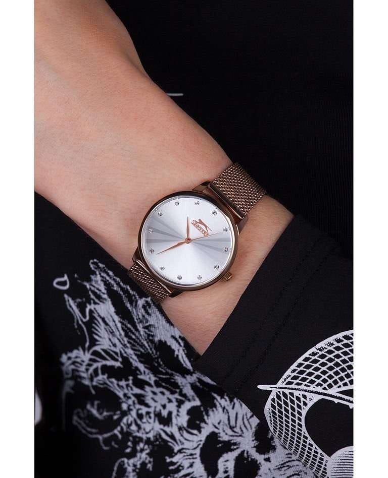 Часы Slazenger SL.09.2052.3.01 — это воплощение элегантности и современного стиля, которые придутся по вкусу каждой женщине. Серебристый циферблат придает часам утонченный вид, гармонично сочетаясь с корпусом и безелемБезельВнешний ободок, закрепляющий стекло. В спортивных часах так называется поворотное кольцо с делениями на циферблате, выполняет роль таймера – замеряет отрезки времени на шкале. Неподвижный безель – элемент декора. Однонаправленно вращающийся безель на дайверских часах позволяет фиксировать моменты погружения и выныривания на поверхность. из суперметалла и IP-покрытиемIP-покрытиеМетод ионного напыления. Демонстрирует повышенную устойчивость к истиранию, окислению и химическим веществам. Под воздействием высокого давления и температуры около 1500°C молекулы металла надёжно соединяются с частицами корпуса часов.. Эти часы оснащены надежным кварцевым механизмом, который обеспечивает точность и долговечность. Водозащита уровня 3 ATM защитит от случайных брызг, а минеральное стеклоМинеральное стеклоМинеральное стекло представляет собой искусственно выращенный минерал кварца. Такое стекло отличается особой устойчивостью к повреждениям и царапинам. Уступает по некоторым качествам сапфировому стеклу. сохранит циферблат от царапин. Изюминкой дизайна являются фианиты, добавляющие блеск и изысканность. Золотой браслет с миланским плетением и IP-покрытиемIP-покрытиеМетод ионного напыления. Демонстрирует повышенную устойчивость к истиранию, окислению и химическим веществам. Под воздействием высокого давления и температуры около 1500°C молекулы металла надёжно соединяются с частицами корпуса часов., выполненный в цвете розового золота и оснащенный раскладным замкомРаскладной замокДанный вариант застежки используется только на часах с металлическим браслетом. Отличительная особенность такого крепления в том, что длина браслета становится универсальной и вы можете самостоятельно отрегулировать нужный вам размер – застежка просто двигается по браслету часов., обеспечивает комфорт и стильное прилегание к запястью. Диаметр корпуса составляет 34 мм, а толщина — 9 мм, что делает эти часы универсальным аксессуаром для любого наряда.