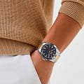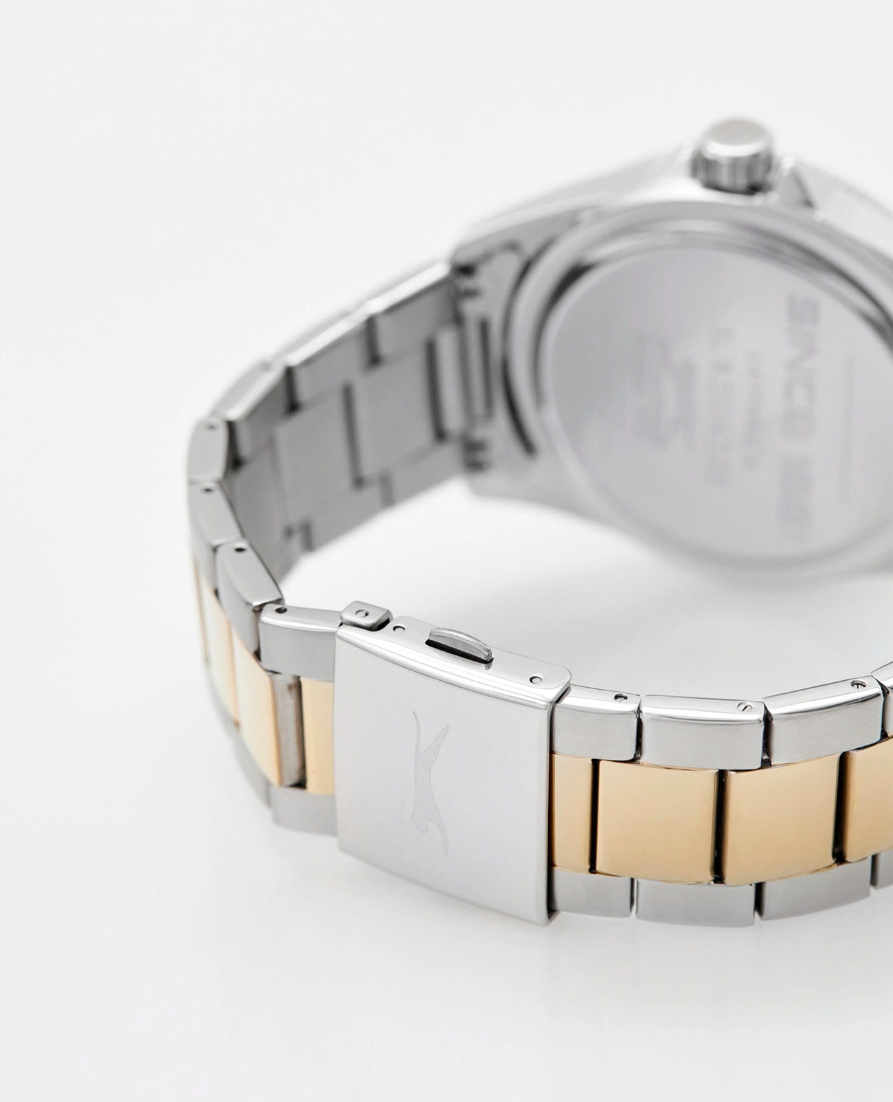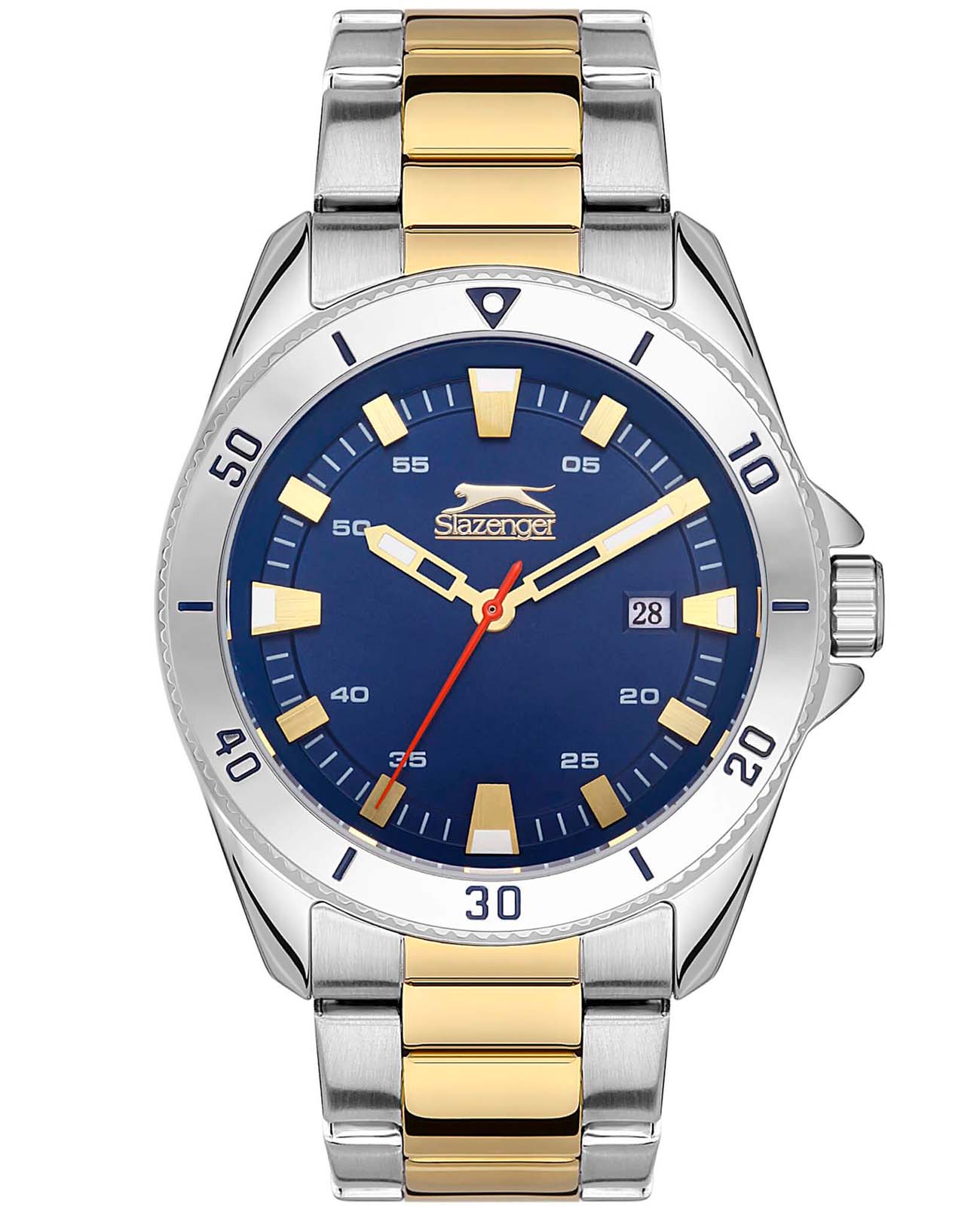 Мужские наручные часы Slazenger SL.09.2114.2.03 сочетают в себе классический дизайн и надежность современных технологий. Модель обладает круглым корпусом диаметром 44 мм, изготовленным из суперметалла, что обеспечивает высокую устойчивость к внешним воздействиям. Браслет выполнен из того же материала с частичным IP-покрытиемIP-покрытиеМетод ионного напыления. Демонстрирует повышенную устойчивость к истиранию, окислению и химическим веществам. Под воздействием высокого давления и температуры около 1500°C молекулы металла надёжно соединяются с частицами корпуса часов. раскладной застежкойРаскладная застёжкаТакой тип застёжки используется только на браслетах из металла. Она никогда не раскрывается полностью, происходит разделение на 2 и более частей. Раскладывающая застёжка снизит вероятность потери часов к минимуму., гарантирующей комфортное ношение и безопасность. Синий циферблат украшен индексами и оснащен окном даты. Для защиты применяется минеральное стеклоМинеральное стеклоМинеральное стекло представляет собой искусственно выращенный минерал кварца. Такое стекло отличается особой устойчивостью к повреждениям и царапинам. Уступает по некоторым качествам сапфировому стеклу., устойчивое к царапинам. Часы работают на кварцевом механизме, что гарантирует точное время без необходимости подзаводки. Водонепроницаемость часов достигает 5 атмосфер (50 метров), что позволяет использовать их при контакте с водой, например, во время мытья рук или попадания брызг, однако не рекомендуется для плавания.