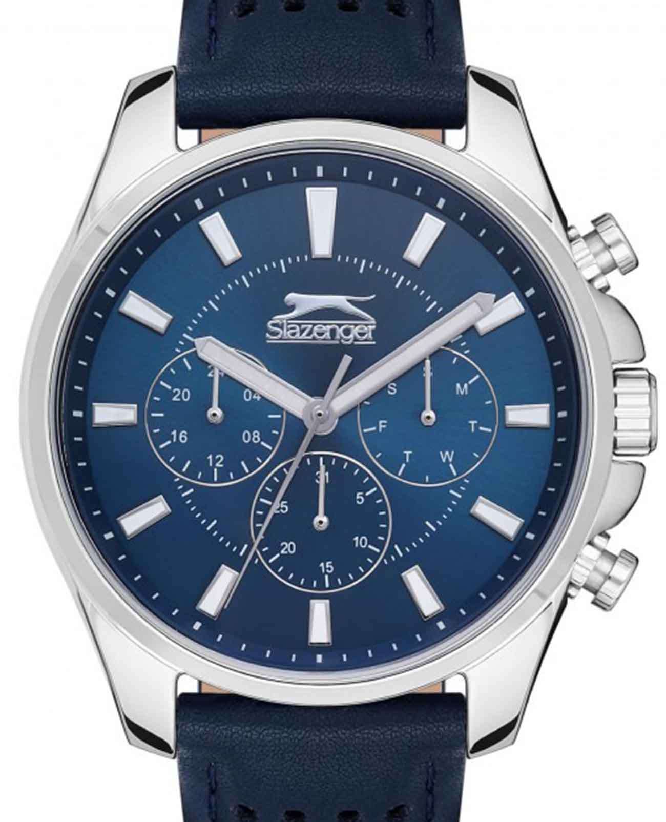 Часы Slazenger SL.09.2134.2.04 воплощают в себе элегантность и практичность, идеально подходящие для современных мужчин. Их синий циферблат, защищенный минеральным стекломМинеральное стеклоМинеральное стекло представляет собой искусственно выращенный минерал кварца. Такое стекло отличается особой устойчивостью к повреждениям и царапинам. Уступает по некоторым качествам сапфировому стеклу., заключен серебристый глянцевый корпус диаметром 46 мм, который изготовлен из прочного суперметалла. Часы оснащены двойным форматом времени (12 и 24 часа), указателем дней недели и удобным окошком даты. Надежный кварцевый механизм обеспечивает точность, а водозащита 5 ATM делает их устойчивыми к воздействию воды. Ремень из натуральной кожи синего цвета имеет классическую застежку, что позволяет легко регулировать его длину на запястье. Люминесцентное покрытиеЛюминесцентное покрытиеПозволяет считывать показания времени в темноте. Производители наносят на стрелки, часовые индексы, безель или поверхность циферблата светонакопительный состав, дающий холодное свечение. на стрелках и метках обеспечивает отличную видимость в темноте.