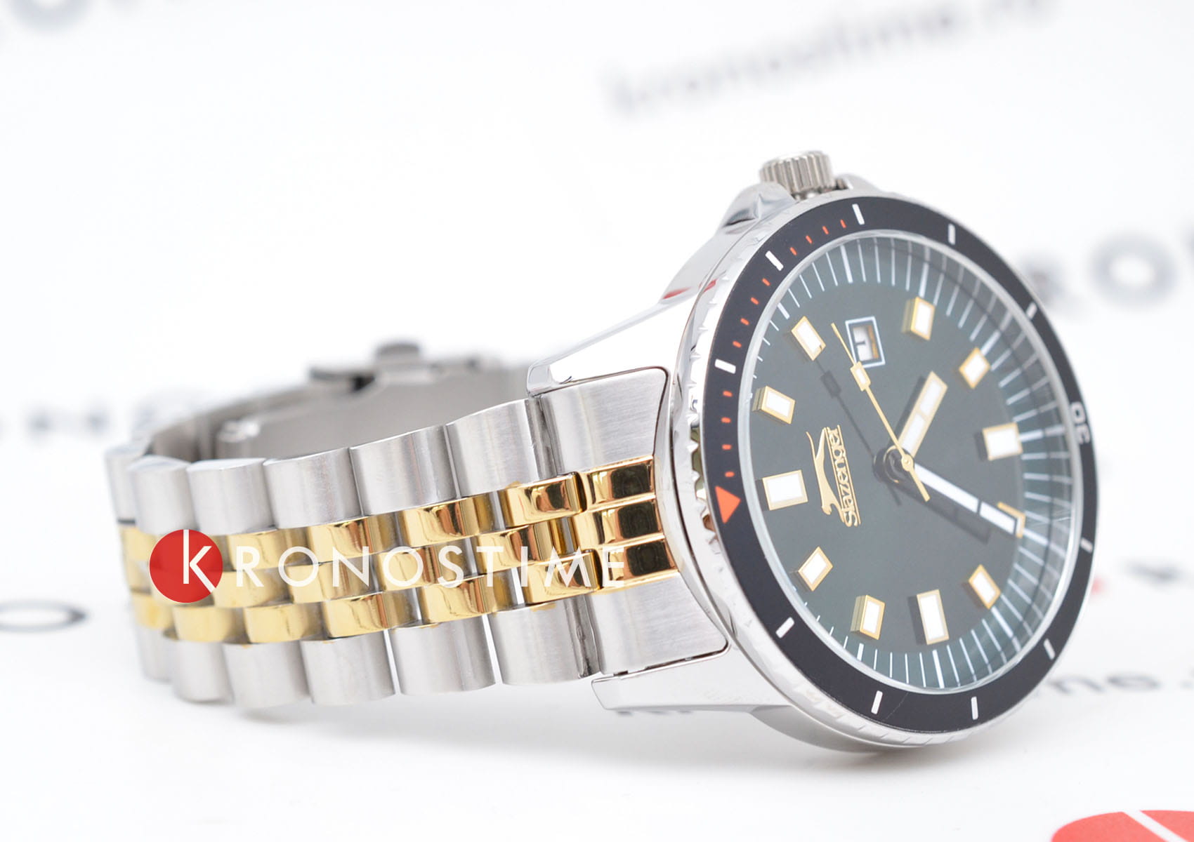 Часы Slazenger SL.09.2135.1.04 воплощают в себе элегантность и практичность, идеально подходящие для современных мужчин. Их зеленый циферблат, защищенный минеральным стекломМинеральное стеклоМинеральное стекло представляет собой искусственно выращенный минерал кварца. Такое стекло отличается особой устойчивостью к повреждениям и царапинам. Уступает по некоторым качествам сапфировому стеклу., заключен в серебристый корпус диаметром 45 мм, который изготовлен из прочного суперметалла. Неподвижный безельБезельВнешний ободок, закрепляющий стекло. В спортивных часах так называется поворотное кольцо с делениями на циферблате, выполняет роль таймера – замеряет отрезки времени на шкале. Неподвижный безель – элемент декора. Однонаправленно вращающийся безель на дайверских часах позволяет фиксировать моменты погружения и выныривания на поверхность. с IP-покрытиемIP-покрытиеМетод ионного напыления. Демонстрирует повышенную устойчивость к истиранию, окислению и химическим веществам. Под воздействием высокого давления и температуры около 1500°C молекулы металла надёжно соединяются с частицами корпуса часов. черного цвета. Часы оснащены удобным окошком даты и стрелками контрастного цвета. Надежный кварцевый механизм обеспечивает точность, а водозащита 5 ATM делает их устойчивыми к воздействию воды. Стальной браслет из суперметалла с частичным IP-покрытиемIP-покрытиеМетод ионного напыления. Демонстрирует повышенную устойчивость к истиранию, окислению и химическим веществам. Под воздействием высокого давления и температуры около 1500°C молекулы металла надёжно соединяются с частицами корпуса часов. золотистого цвета имеет раскладную застёжкуРаскладная застёжкаТакой тип застёжки используется только на браслетах из металла. Она никогда не раскрывается полностью, происходит разделение на 2 и более частей. Раскладывающая застёжка снизит вероятность потери часов к минимуму., что подчеркивает современный стиль и позволяет легко снимать часы. Люминесцентное покрытиеЛюминесцентное покрытиеПозволяет считывать показания времени в темноте. Производители наносят на стрелки, часовые индексы, безель или поверхность циферблата светонакопительный состав, дающий холодное свечение. на стрелках и метках обеспечивает отличную видимость в темноте.