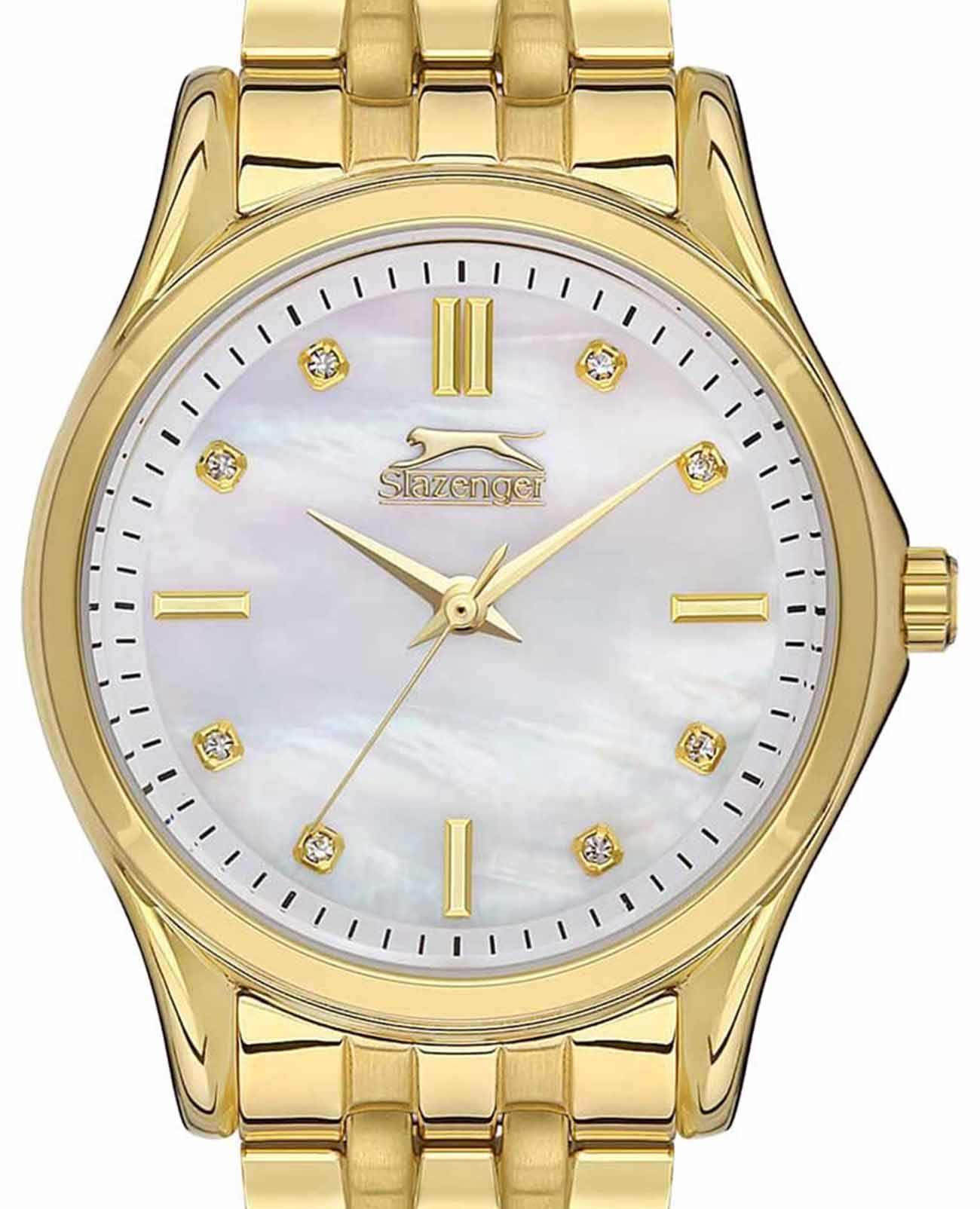 Эти стильные часы Slazenger SL.09.2154.3.05 станут отличным дополнением к вашему образу. Кварцевый механизм обеспечивает точное время, а корпус из суперметалла с золотистым IP-покрытиемIP-покрытиеМетод ионного напыления. Демонстрирует повышенную устойчивость к истиранию, окислению и химическим веществам. Под воздействием высокого давления и температуры около 1500°C молекулы металла надёжно соединяются с частицами корпуса часов. придаёт аксессуару современный вид и дополнительную прочность. Перламутровый белый циферблат украшен изысканными фианитами, что добавляет часам элегантности и блеска. Металлический браслет, с золотистым IP-покрытиемIP-покрытиеМетод ионного напыления. Демонстрирует повышенную устойчивость к истиранию, окислению и химическим веществам. Под воздействием высокого давления и температуры около 1500°C молекулы металла надёжно соединяются с частицами корпуса часов., отличается плавностью линий и удобной раскладной застёжкойРаскладная застёжкаТакой тип застёжки используется только на браслетах из металла. Она никогда не раскрывается полностью, происходит разделение на 2 и более частей. Раскладывающая застёжка снизит вероятность потери часов к минимуму.. Водозащита на уровне 30WR позволяет не беспокоиться о случайных брызгах в повседневной жизни. Минеральное стеклоМинеральное стеклоМинеральное стекло представляет собой искусственно выращенный минерал кварца. Такое стекло отличается особой устойчивостью к повреждениям и царапинам. Уступает по некоторым качествам сапфировому стеклу. защищает циферблат от царапин, а компактные габариты — диаметр 32 мм и толщина 9 мм — делают эти часы комфортными для ношения.