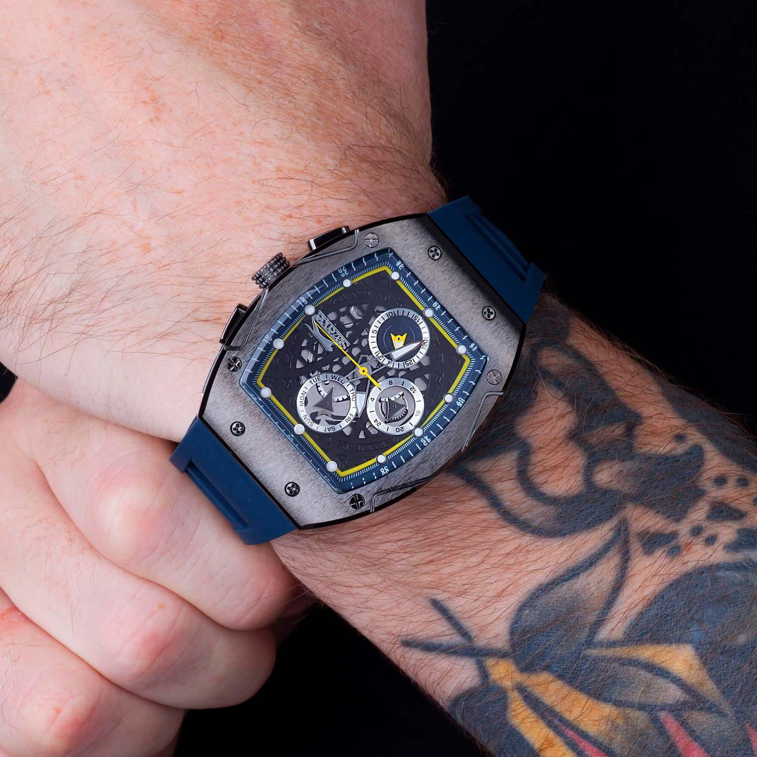 Часы Slazenger SL.09.2257.2.03 — это современная модель, сочетающая стильный внешний вид и функциональность. Крупный корпус размером 44х53 мм выполнен из металла с прочным черным IP-покрытиемIP-покрытиеМетод ионного напыления. Демонстрирует повышенную устойчивость к истиранию, окислению и химическим веществам. Под воздействием высокого давления и температуры около 1500°C молекулы металла надёжно соединяются с частицами корпуса часов., что придает часам выразительный характер и надежную защиту от внешних воздействий. Сатинированный безельБезельВнешний ободок, закрепляющий стекло. В спортивных часах так называется поворотное кольцо с делениями на циферблате, выполняет роль таймера – замеряет отрезки времени на шкале. Неподвижный безель – элемент декора. Однонаправленно вращающийся безель на дайверских часах позволяет фиксировать моменты погружения и выныривания на поверхность. гармонично сочетается с черным циферблатом, украшенным логотипом бренда и аккуратными часовыми метками в виде точек. Минеральное стеклоМинеральное стеклоМинеральное стекло представляет собой искусственно выращенный минерал кварца. Такое стекло отличается особой устойчивостью к повреждениям и царапинам. Уступает по некоторым качествам сапфировому стеклу. обеспечивает защиту от случайных царапин, а стрелки и метки с люминесцентным покрытиемЛюминесцентное покрытиеПозволяет считывать показания времени в темноте. Производители наносят на стрелки, часовые индексы, безель или поверхность циферблата светонакопительный состав, дающий холодное свечение. удобно подсвечиваются в темноте после зарядки на свету. На циферблате расположены отдельные индикаторы даты, дня недели, а также 12- и 24-часового формата времени. За точность хода отвечает кварцевый механизм, не требующий ежедневного завода. Модель снабжена синим силиконовым ремешком шириной 26 мм с классической застежкой, который комфортно фиксируется на запястье и подходит для активного образа жизни. Водозащита 50WR позволяет не снимать часы при мытье рук или во время прогулок под дождем.