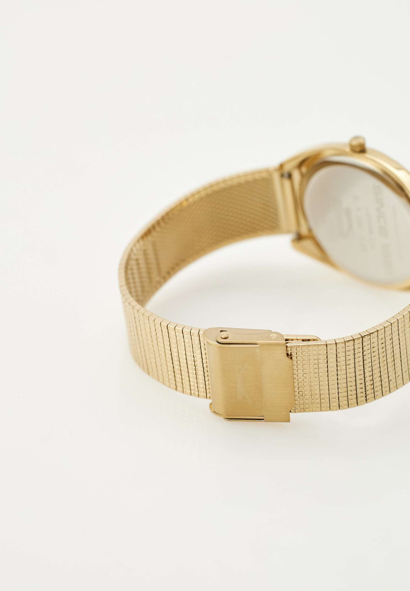 Часы Slazenger SL.09.2261.3.03 — это утонченное сочетание современного дизайна и классической элегантности. Изделие оснащено надежным кварцевым механизмом, который обеспечивает точность хода и простоту эксплуатации. Корпус из суперметалла с золотистым IP-покрытиемIP-покрытиеМетод ионного напыления. Демонстрирует повышенную устойчивость к истиранию, окислению и химическим веществам. Под воздействием высокого давления и температуры около 1500°C молекулы металла надёжно соединяются с частицами корпуса часов. гармонично сочетается с металлическим браслетом аналогичного оттенка и покрытия, подчеркивая изысканность аксессуара и его актуальность в модных тенденциях. Золотистый циферблат украшен изысканным гильоше Clous de Paris и дополнен лаконичными метками в виде штрихов, а также фирменным логотипом бренда. Минеральное стеклоМинеральное стеклоМинеральное стекло представляет собой искусственно выращенный минерал кварца. Такое стекло отличается особой устойчивостью к повреждениям и царапинам. Уступает по некоторым качествам сапфировому стеклу. надежно защищает циферблат от случайных царапин. Диаметр корпуса составляет 34 мм, толщина — 8 мм, ширина браслета — 18 мм, а вес часов — всего 54 г, благодаря чему аксессуар удобно сидит на запястье. Стальной браслет c раскладным замкомРаскладной замокДанный вариант застежки используется только на часах с металлическим браслетом. Отличительная особенность такого крепления в том, что длина браслета становится универсальной и вы можете самостоятельно отрегулировать нужный вам размер – застежка просто двигается по браслету часов. удобно фиксируется на запястье и подчёркивает современный характер часов. Водозащита 30WR позволяет не беспокоиться о случайных брызгах. Модель отличается отсутствием секундной стрелки и оснащена рифленой заводной головкой для легкой корректировки времени. Эти часы станут стильным завершением любого образа, подчеркивая индивидуальность и чувство вкуса обладателя.