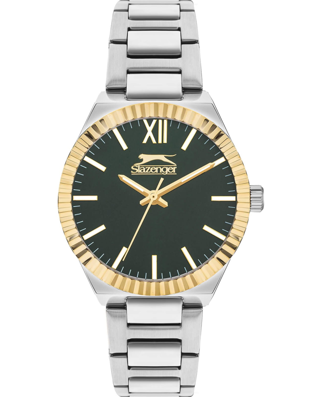 Женские кварцевые часы Slazenger SL.09.2304.3.02 — это элегантный и стильный аксессуар, идеально дополняющий любой образ. Безель из суперметалла с IP-покрытиемIP-покрытиеМетод ионного напыления. Демонстрирует повышенную устойчивость к истиранию, окислению и химическим веществам. Под воздействием высокого давления и температуры около 1500°C молекулы металла надёжно соединяются с частицами корпуса часов., защищён минеральным стекломМинеральное стеклоМинеральное стекло представляет собой искусственно выращенный минерал кварца. Такое стекло отличается особой устойчивостью к повреждениям и царапинам. Уступает по некоторым качествам сапфировому стеклу.. Циферблат зелёного цвета оформлен в классическом стиле, стрелки оснащены люминесцентным покрытиемЛюминесцентное покрытиеПозволяет считывать показания времени в темноте. Производители наносят на стрелки, часовые индексы, безель или поверхность циферблата светонакопительный состав, дающий холодное свечение., обеспечивающим хорошую читаемость в темноте. Браслет из суперметалла фиксируется на раскладной застёжкеРаскладная застёжкаТакой тип застёжки используется только на браслетах из металла. Она никогда не раскрывается полностью, происходит разделение на 2 и более частей. Раскладывающая застёжка снизит вероятность потери часов к минимуму., обеспечивая надёжность и комфорт ношения. Водонепроницаемость 30 м позволяет использовать часы в повседневных условиях, защищая от случайных брызг и капель дождя. Модель сочетает в себе лёгкость, прочность и изысканный внешний вид.