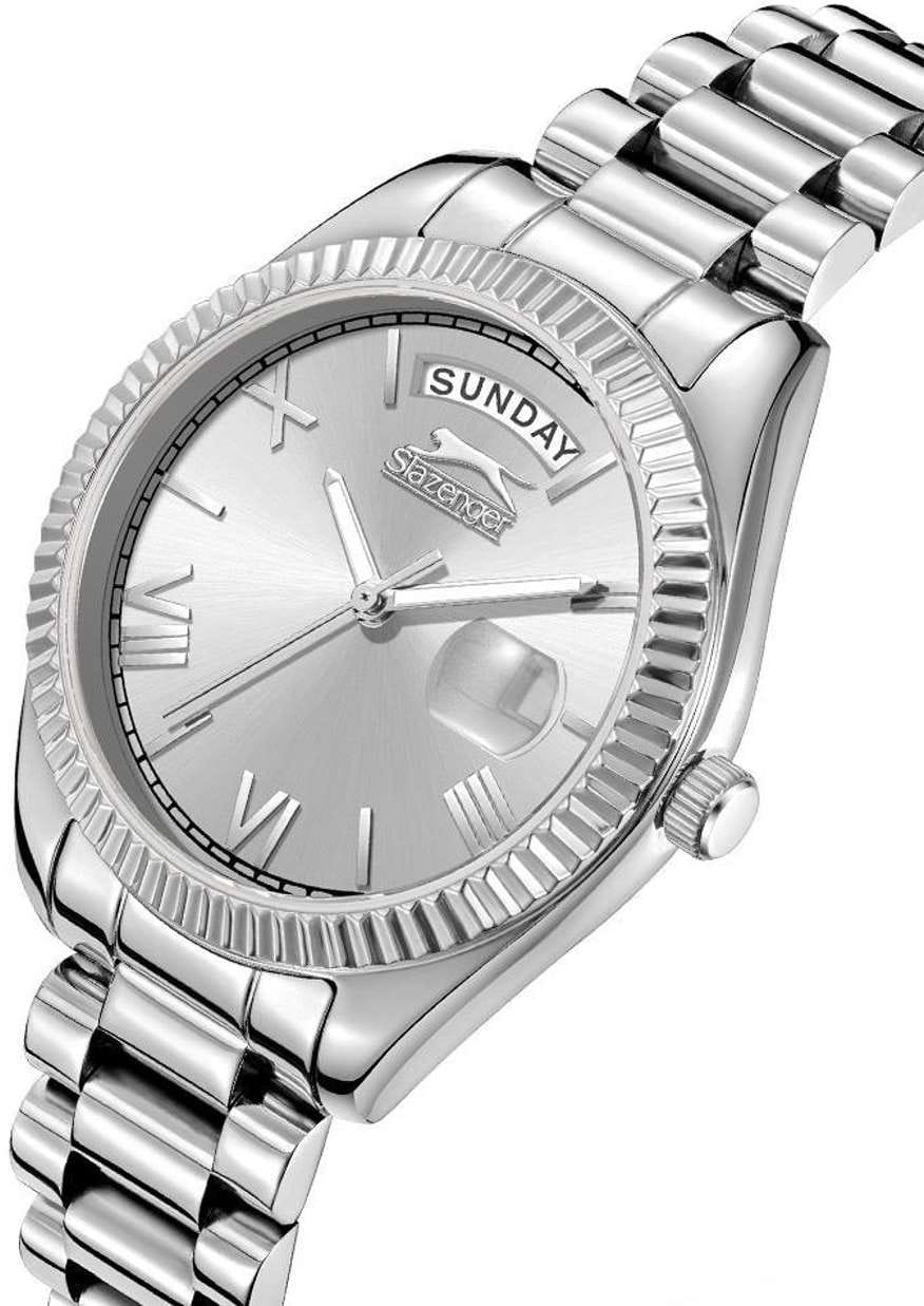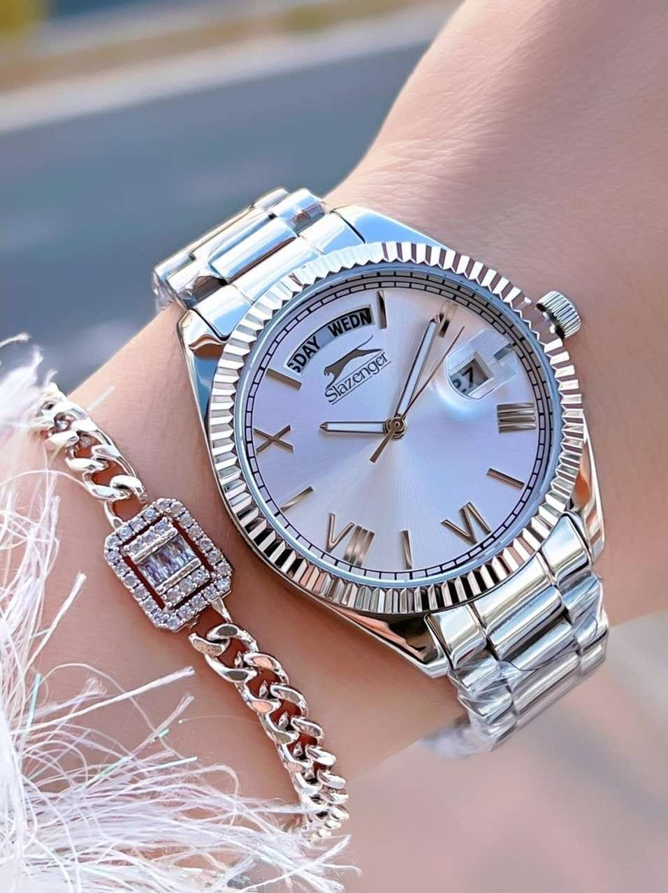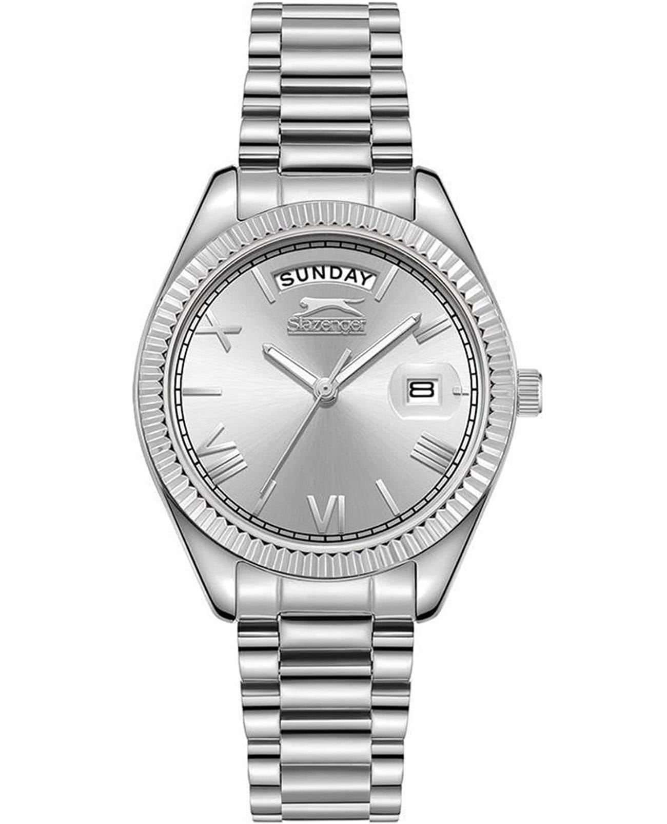 Женские элегантные наручные часы Slazenger SL.09.2338.4.01 сочетают в себе современный стиль и функциональность. Стильный корпус выполнен из суперметалла, придающий модели дополнительную прочность и элегантный внешний вид. Изысканный циферблат защищён минеральным стекломМинеральное стеклоМинеральное стекло представляет собой искусственно выращенный минерал кварца. Такое стекло отличается особой устойчивостью к повреждениям и царапинам. Уступает по некоторым качествам сапфировому стеклу., устойчивым к царапинам и повреждениям. Водонепроницаемость 3 АТМ позволяет использовать часы в повседневных условиях — при мытье рук или под лёгким дождём. Браслет из суперметалла и с раскладной застёжкойРаскладная застёжкаТакой тип застёжки используется только на браслетах из металла. Она никогда не раскрывается полностью, происходит разделение на 2 и более частей. Раскладывающая застёжка снизит вероятность потери часов к минимуму., обеспечивающий надёжную фиксацию и комфорт при ношении. Окошко даты находится в положении 3 часа. Cтрелки покрыты люминесцентным покрытиемЛюминесцентное покрытиеПозволяет считывать показания времени в темноте. Производители наносят на стрелки, часовые индексы, безель или поверхность циферблата светонакопительный состав, дающий холодное свечение. для читаемости в условиях недостаточного освещения. Эта модель идеально подходит для женщин, ценящих стиль, функциональность и надёжность в одном аксессуаре.