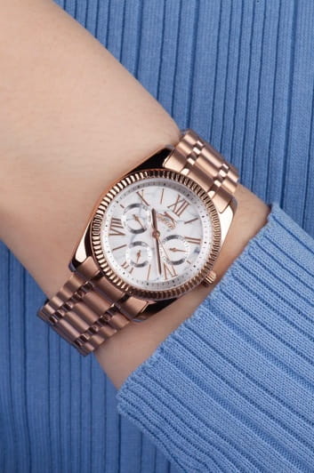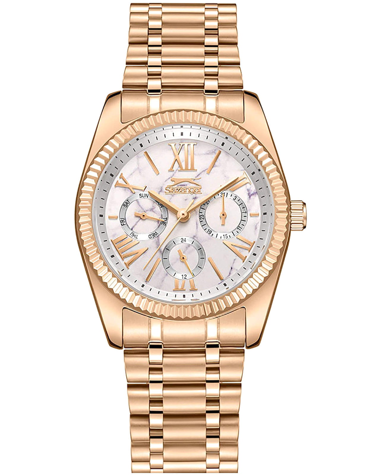 Женские кварцевые часы Slazenger SL.09.2343.4.04 – это сочетание элегантности, современного стиля и надёжности. Изящный корпус из суперметалла с IP-покрытиемIP-покрытиеМетод ионного напыления. Демонстрирует повышенную устойчивость к истиранию, окислению и химическим веществам. Под воздействием высокого давления и температуры около 1500°C молекулы металла надёжно соединяются с частицами корпуса часов. цвета розового золота, диаметром 36 мм и толщиной 10.5 мм, подчёркивает утончённость модели и делает их идеальным аксессуаром для любой ситуации – будь то деловая встреча, романтический вечер или повседневные выходы. Циферблат надёжно защищён минеральным стекломМинеральное стеклоМинеральное стекло представляет собой искусственно выращенный минерал кварца. Такое стекло отличается особой устойчивостью к повреждениям и царапинам. Уступает по некоторым качествам сапфировому стеклу., которое устойчиво к механическим повреждениям и сохраняет кристальную прозрачность. Рифленый неподвижный безельБезельВнешний ободок, закрепляющий стекло. В спортивных часах так называется поворотное кольцо с делениями на циферблате, выполняет роль таймера – замеряет отрезки времени на шкале. Неподвижный безель – элемент декора. Однонаправленно вращающийся безель на дайверских часах позволяет фиксировать моменты погружения и выныривания на поверхность.. Браслет из суперметалла с IP-покрытиемIP-покрытиеМетод ионного напыления. Демонстрирует повышенную устойчивость к истиранию, окислению и химическим веществам. Под воздействием высокого давления и температуры около 1500°C молекулы металла надёжно соединяются с частицами корпуса часов. удобно облегает запястье и фиксируется с помощью раскладной застёжкиРаскладная застёжкаТакой тип застёжки используется только на браслетах из металла. Она никогда не раскрывается полностью, происходит разделение на 2 и более частей. Раскладывающая застёжка снизит вероятность потери часов к минимуму., обеспечивая надёжность и комфорт в повседневном ношении. Утончённый стиль, внимание к деталям и практичность делают эту модель идеальным выбором для современных женщин, ценящих эстетику и функциональность. Вынесенный циферблат с 24-х часовым указателем времени. Водозащита до 30 метров позволит защитить корпус от случайных брызг или капель дождя.