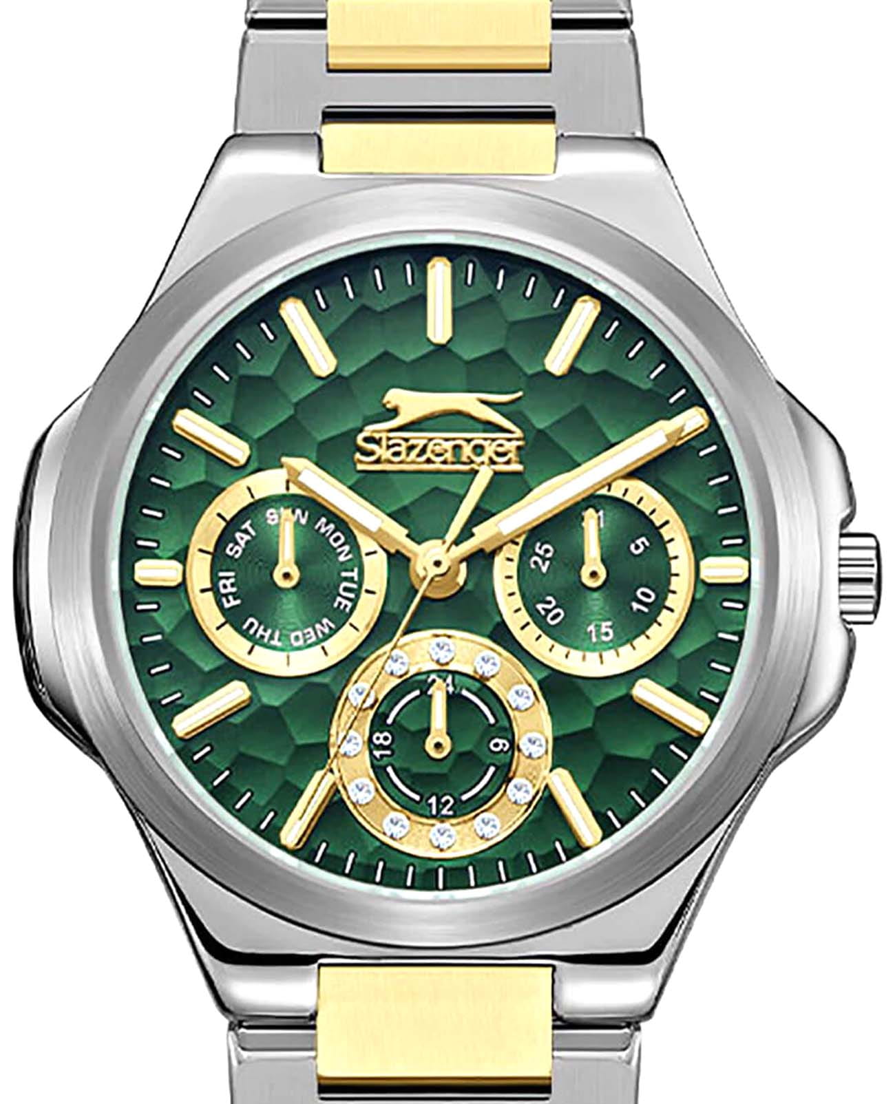 Женские кварцевые часы Slazenger SL.09.2365.4.01 – это сочетание элегантности, современного стиля и надёжности. Изящный корпус из суперметалла серебристого цвета, диаметром 33 мм и толщиной 10 мм, подчёркивает утончённость модели и делает их идеальным аксессуаром для любой ситуации – будь то деловая встреча, романтический вечер или повседневные выходы. Циферблат надёжно защищён минеральным стекломМинеральное стеклоМинеральное стекло представляет собой искусственно выращенный минерал кварца. Такое стекло отличается особой устойчивостью к повреждениям и царапинам. Уступает по некоторым качествам сапфировому стеклу., которое устойчиво к механическим повреждениям и сохраняет кристальную прозрачность. Браслет из суперметалла с частичным IP-покрытиемIP-покрытиеМетод ионного напыления. Демонстрирует повышенную устойчивость к истиранию, окислению и химическим веществам. Под воздействием высокого давления и температуры около 1500°C молекулы металла надёжно соединяются с частицами корпуса часов. золотистого цвета удобно облегает запястье и фиксируется с помощью раскладной застёжкиРаскладная застёжкаТакой тип застёжки используется только на браслетах из металла. Она никогда не раскрывается полностью, происходит разделение на 2 и более частей. Раскладывающая застёжка снизит вероятность потери часов к минимуму., обеспечивая надёжность и комфорт в повседневном ношении. Утончённый стиль, внимание к деталям и практичность делают эту модель идеальным выбором для современных женщин, ценящих эстетику и функциональность. Стрелки и метки покрыты люминесцентным покрытиемЛюминесцентное покрытиеПозволяет считывать показания времени в темноте. Производители наносят на стрелки, часовые индексы, безель или поверхность циферблата светонакопительный состав, дающий холодное свечение., обеспечивающим отличную читаемость в темноте. Вынесенный циферблат с 24-х часовым указателем времени украшен фианитами. Водозащита до 30 метров позволит защитить корпус от случайных брызг или капель дождя.
