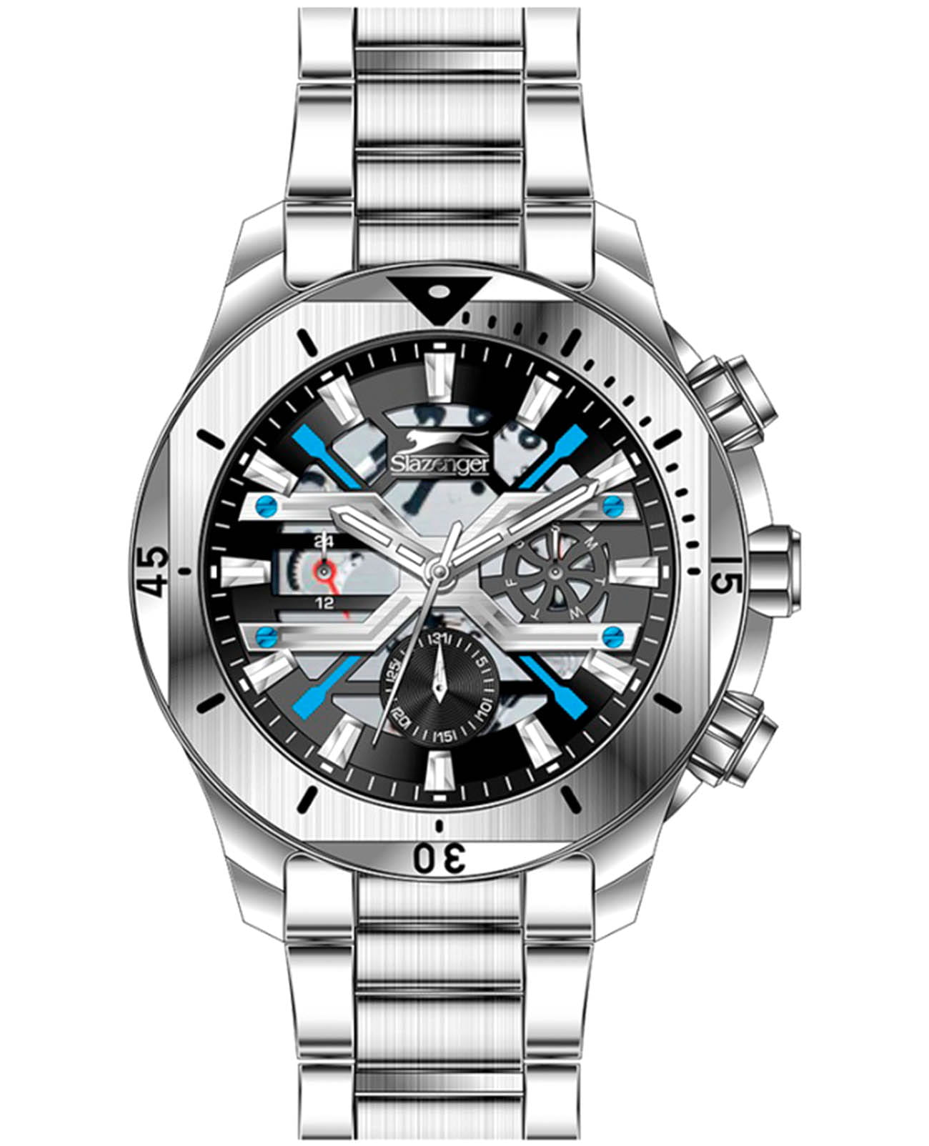 Мужские кварцевые часы Slazenger — это выразительный и функциональный аксессуар. Корпус диаметром 44 мм и толщиной 12 мм выполнен из суперметалла. Циферблат чёрного цвета с голубыми элементами частично скелетонизирован. Циферблат защищён минеральным стекломМинеральное стеклоМинеральное стекло представляет собой искусственно выращенный минерал кварца. Такое стекло отличается особой устойчивостью к повреждениям и царапинам. Уступает по некоторым качествам сапфировому стеклу.. Механизм — кварцевый калибр VX9JE1. Часы оснащены индикацией дня недели, даты и 12/24-часового формата времени. Часы оснащены браслетом из суперметалла с раскладной застёжкойРаскладная застёжкаТакой тип застёжки используется только на браслетах из металла. Она никогда не раскрывается полностью, происходит разделение на 2 и более частей. Раскладывающая застёжка снизит вероятность потери часов к минимуму.. Водонепроницаемость 50 м позволяет использовать часы в повседневных условиях. Гарантия — 12 месяцев. Идеальный выбор для тех, кто ценит стиль, функциональность и качество.